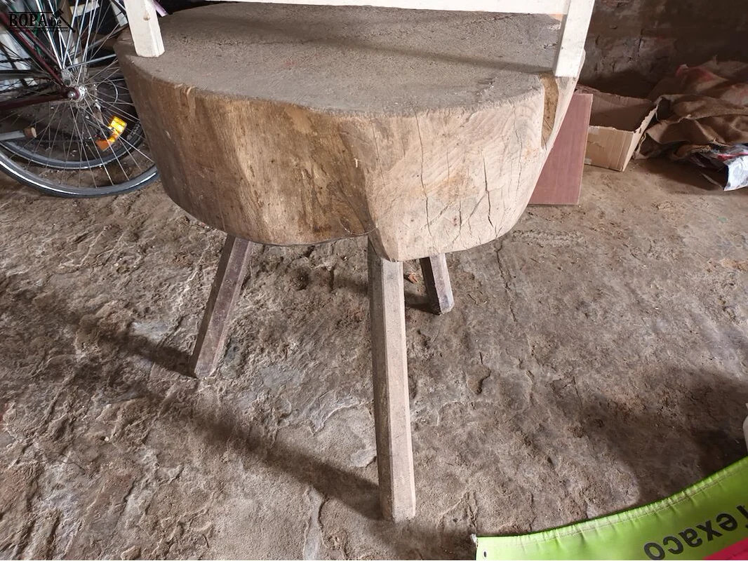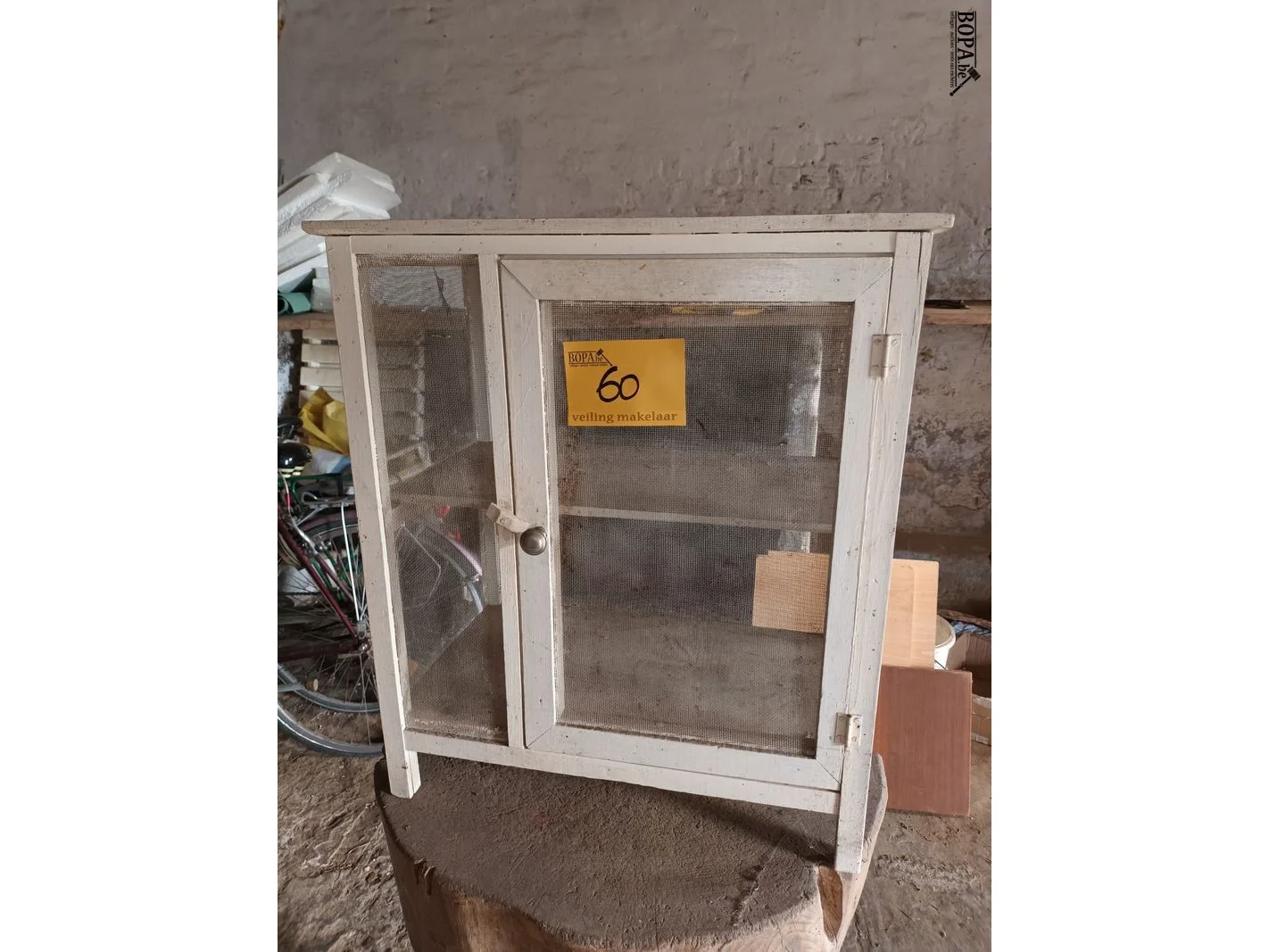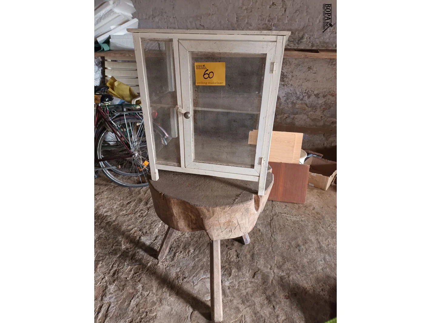 Houten kapblok ( diameter 60 cm en hoogte 74 cm) en kastje om voedsel te bewaren (50 x 30 x 61 cm).