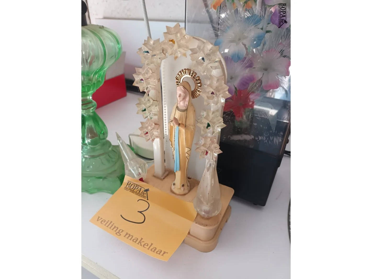 1 x lampe belge, 1 x maria beeldje met verlichting, 1 x vintage IKEA bureaulamp en 1 x vintage fiberglas bloemenlamp.