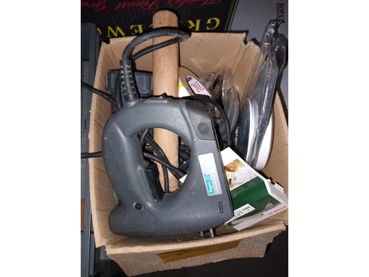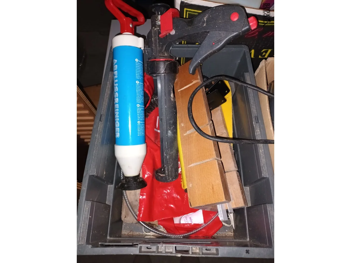 1 doos en 1 bak met divers werkmateriaal zoals een elektrische nietmachine, silicone pomp, etc.