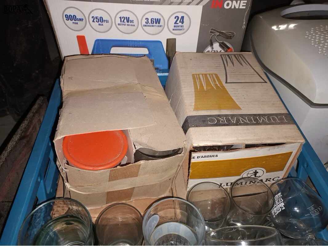 Bak met diverse glazen zoals Ricard, Luminarc etc. Blauwe bak niet inbegrepen.