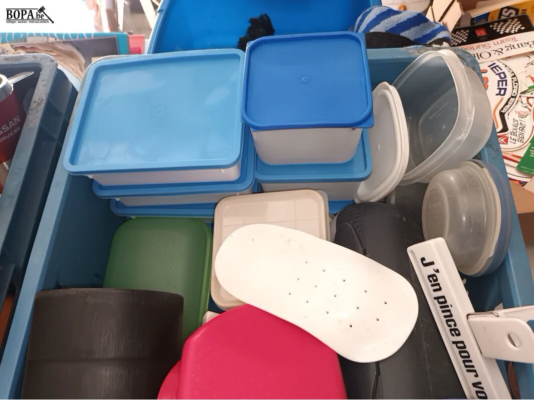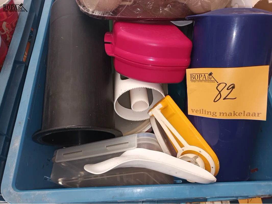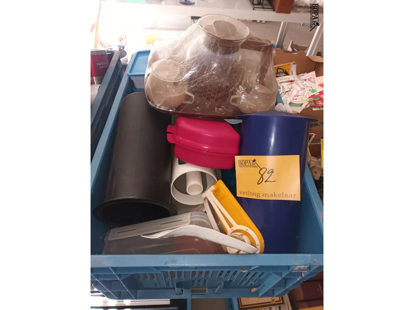1 bak met plastieken huisraad en een koffieset. Blauwe bak niet inbegrepen.