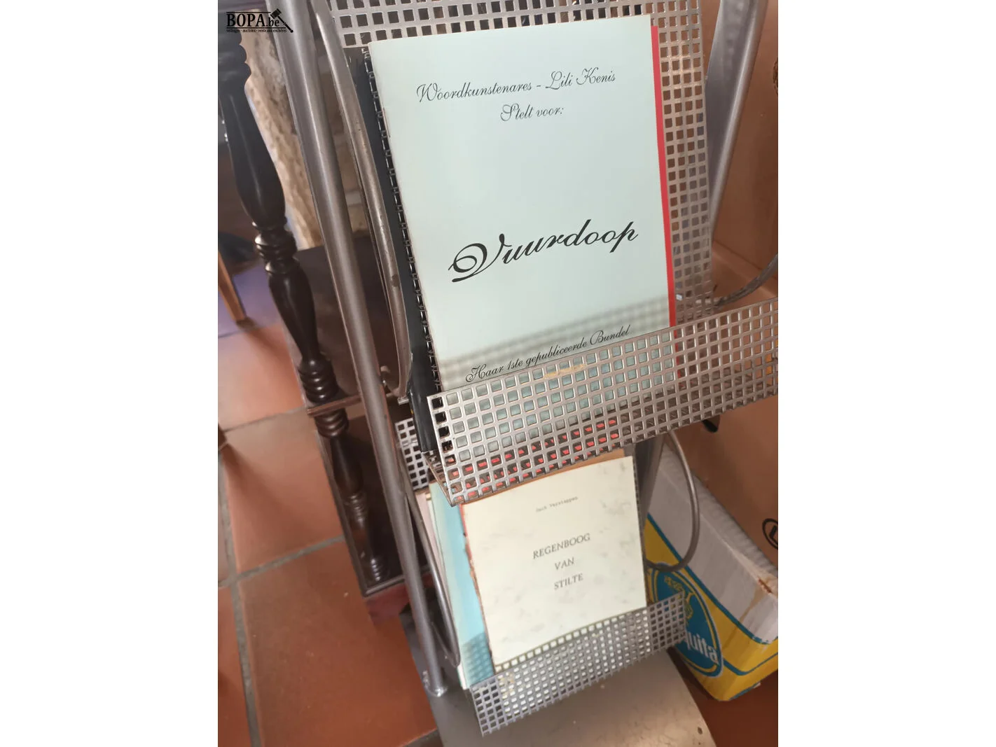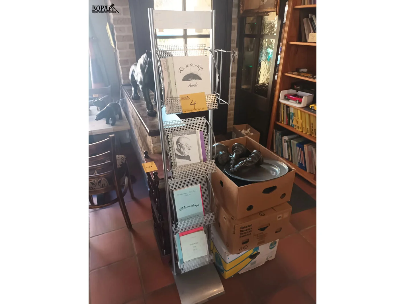 Metalen folderrek met inhoud. 30 x 20 x 150 cm.