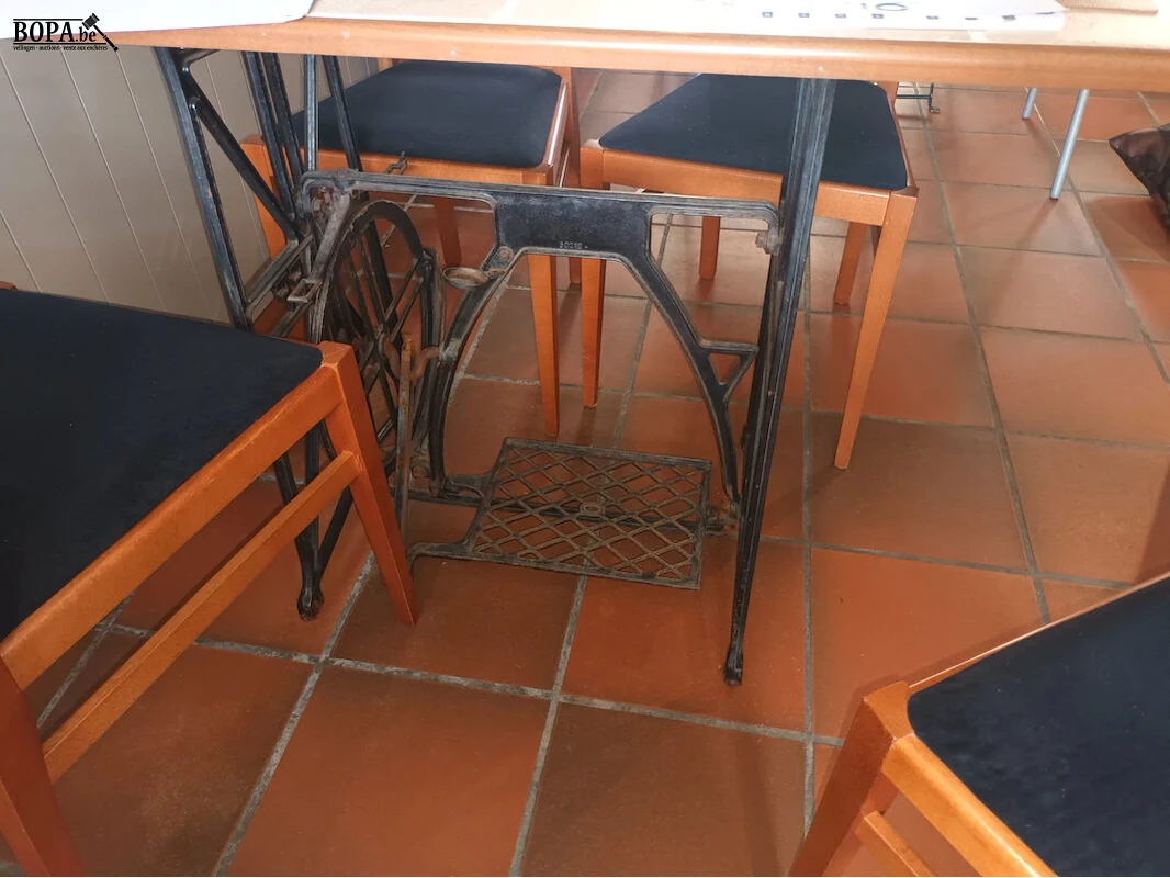 Tafel met smeedijzeren onderstel van een Pfaff naaimachine en een blad met tegels. 106 x 61 x 79 cm.