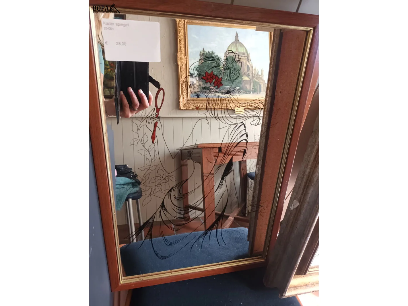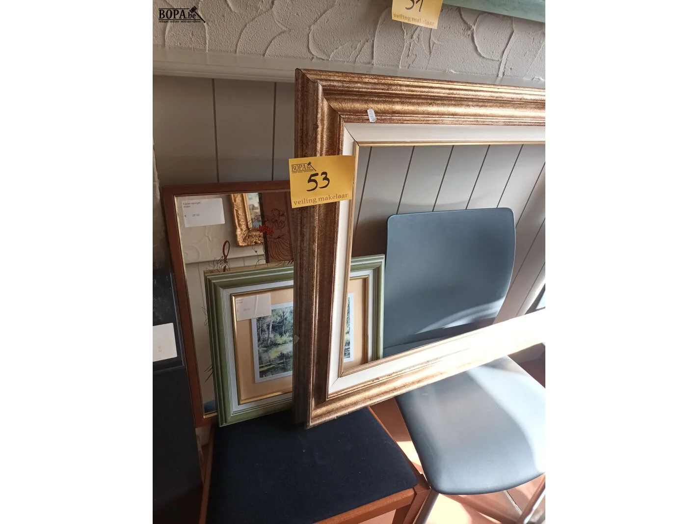 Kaders en spiegel. 3 stuks. De grootste meet 96 x 68 cm.