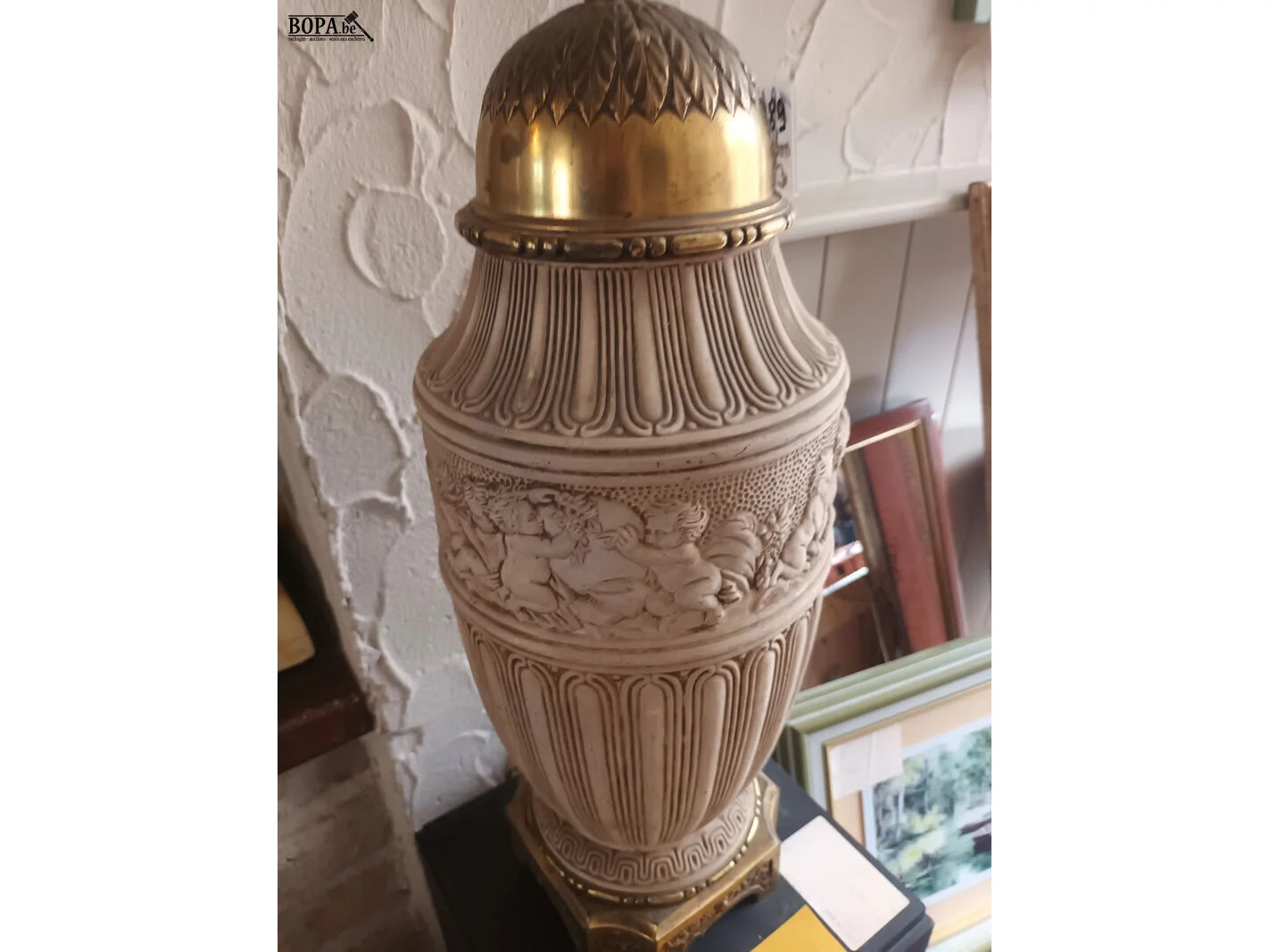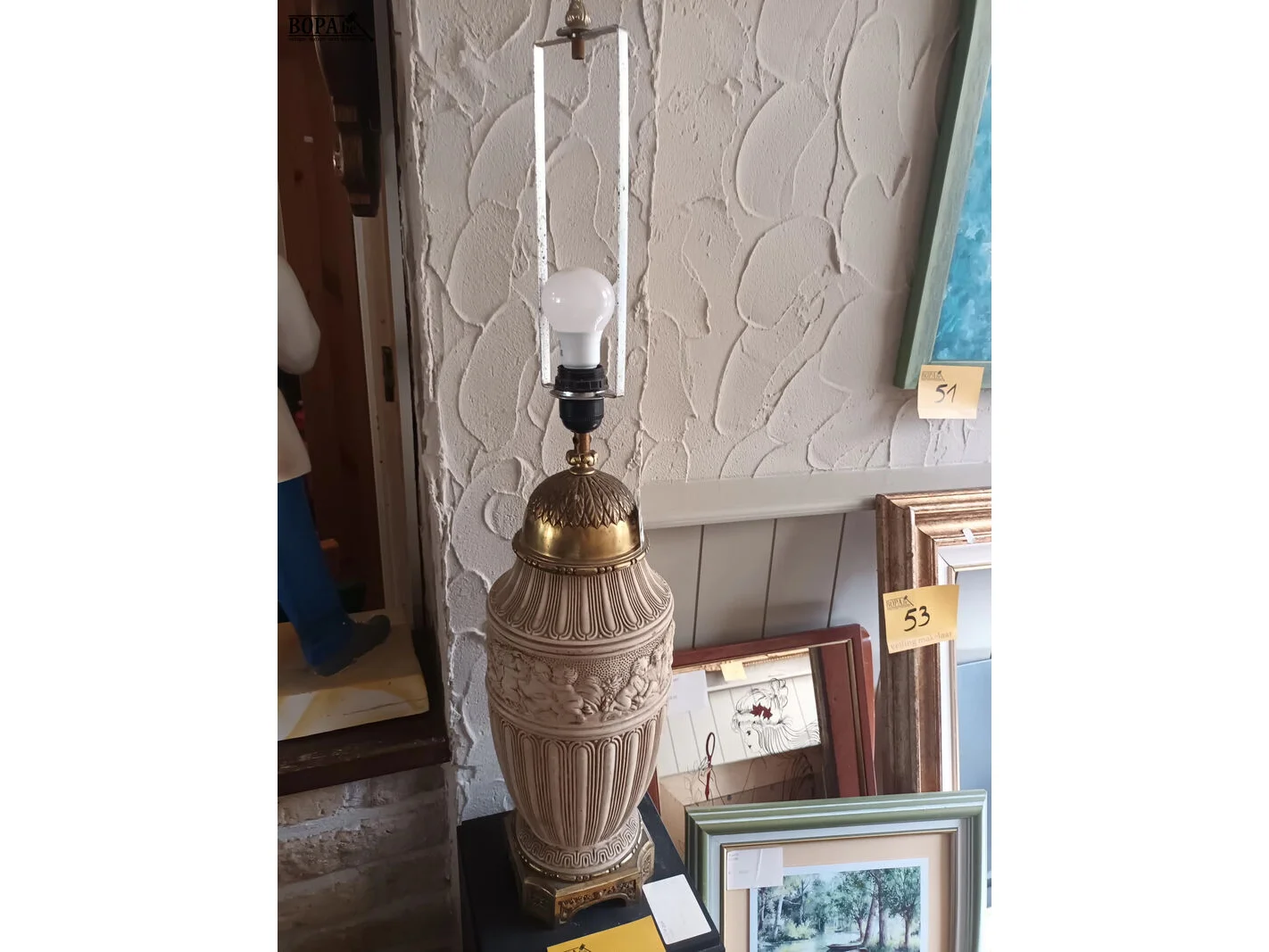 Zwarte zuil (hoogte 80 cm) en lamp met engelen (hoogte 80 cm).
