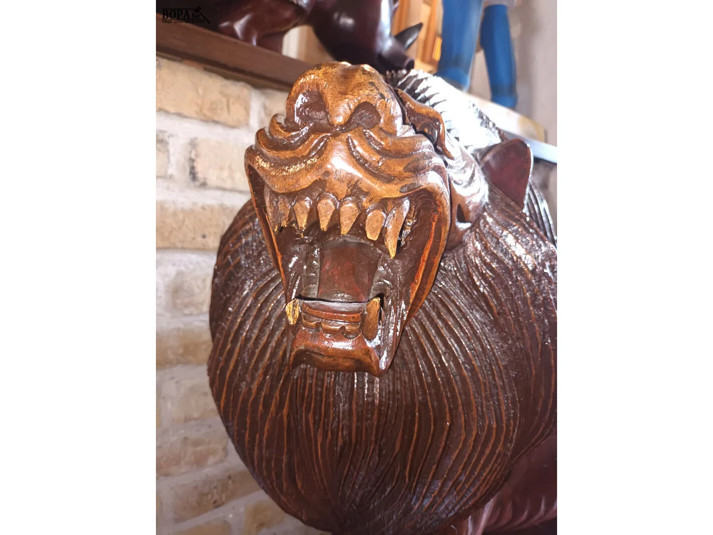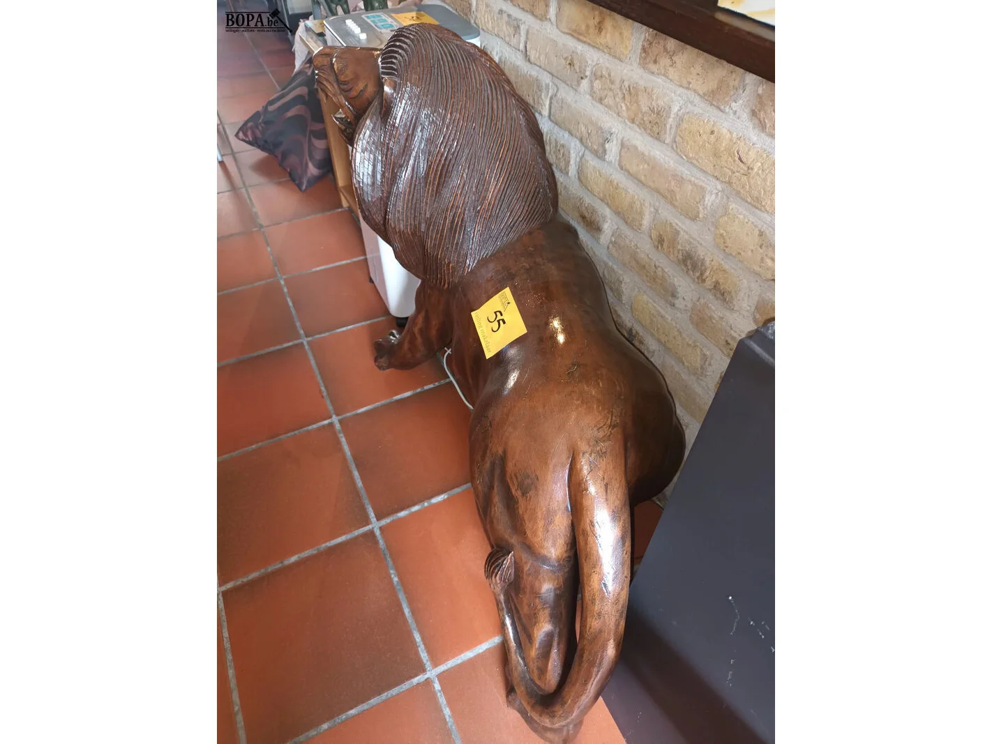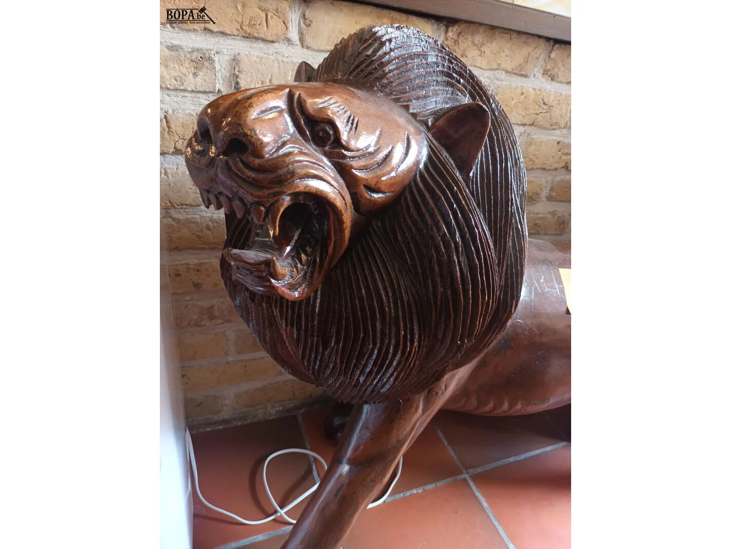Grote brullende leeuw in hardhout. 102 x 40 x 80 cm. 1 tand onderaan afgebroken.