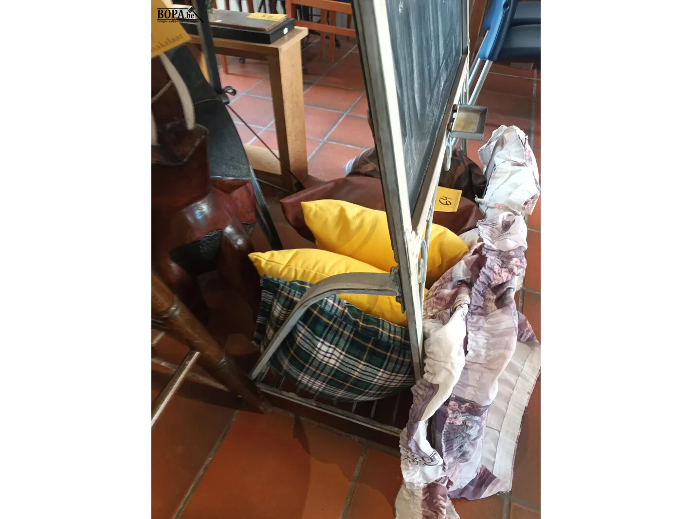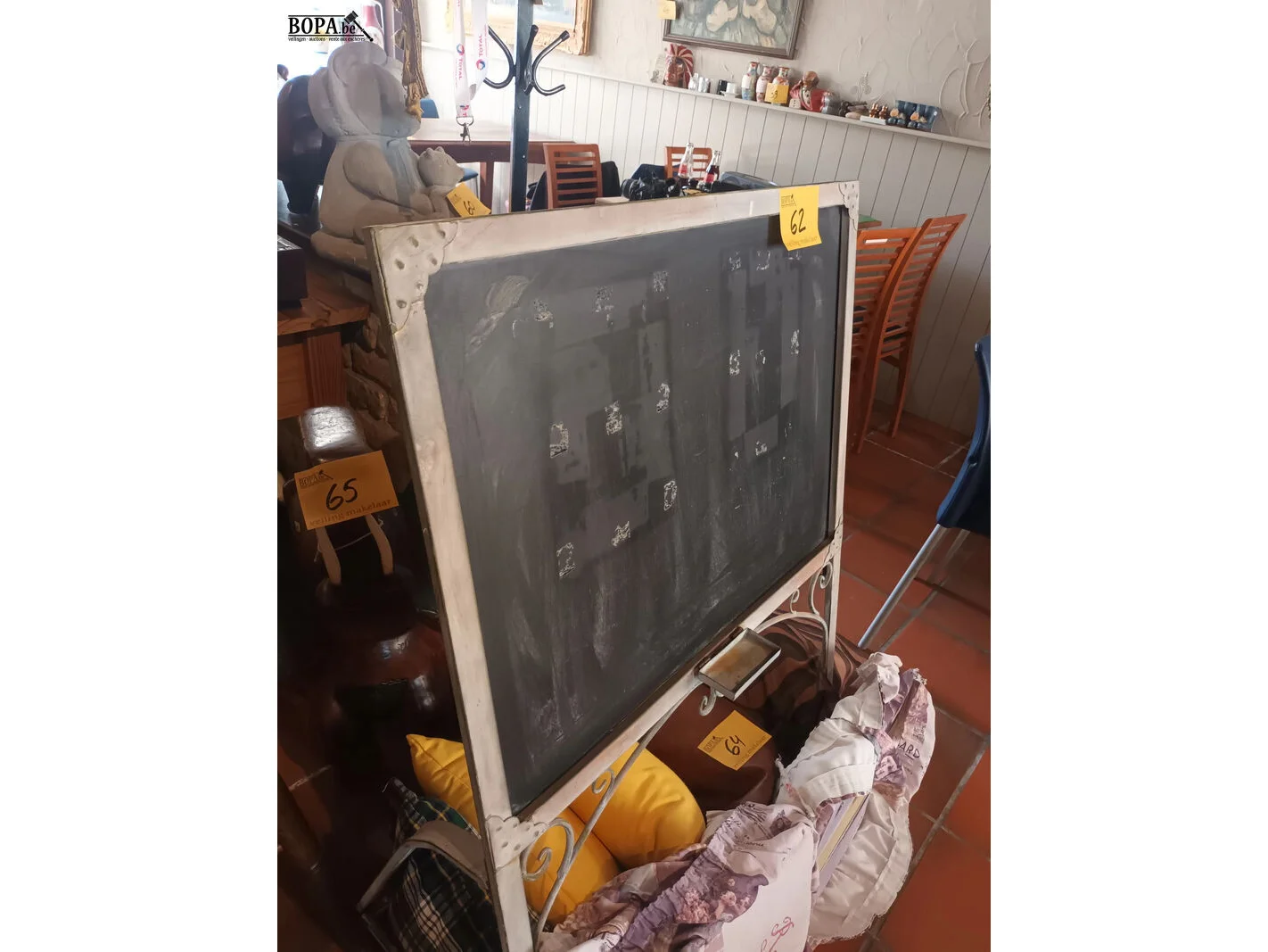 Krijtbord in ijzeren staander. 80 x 45 x 110 cm.