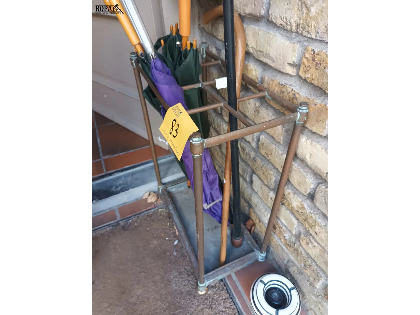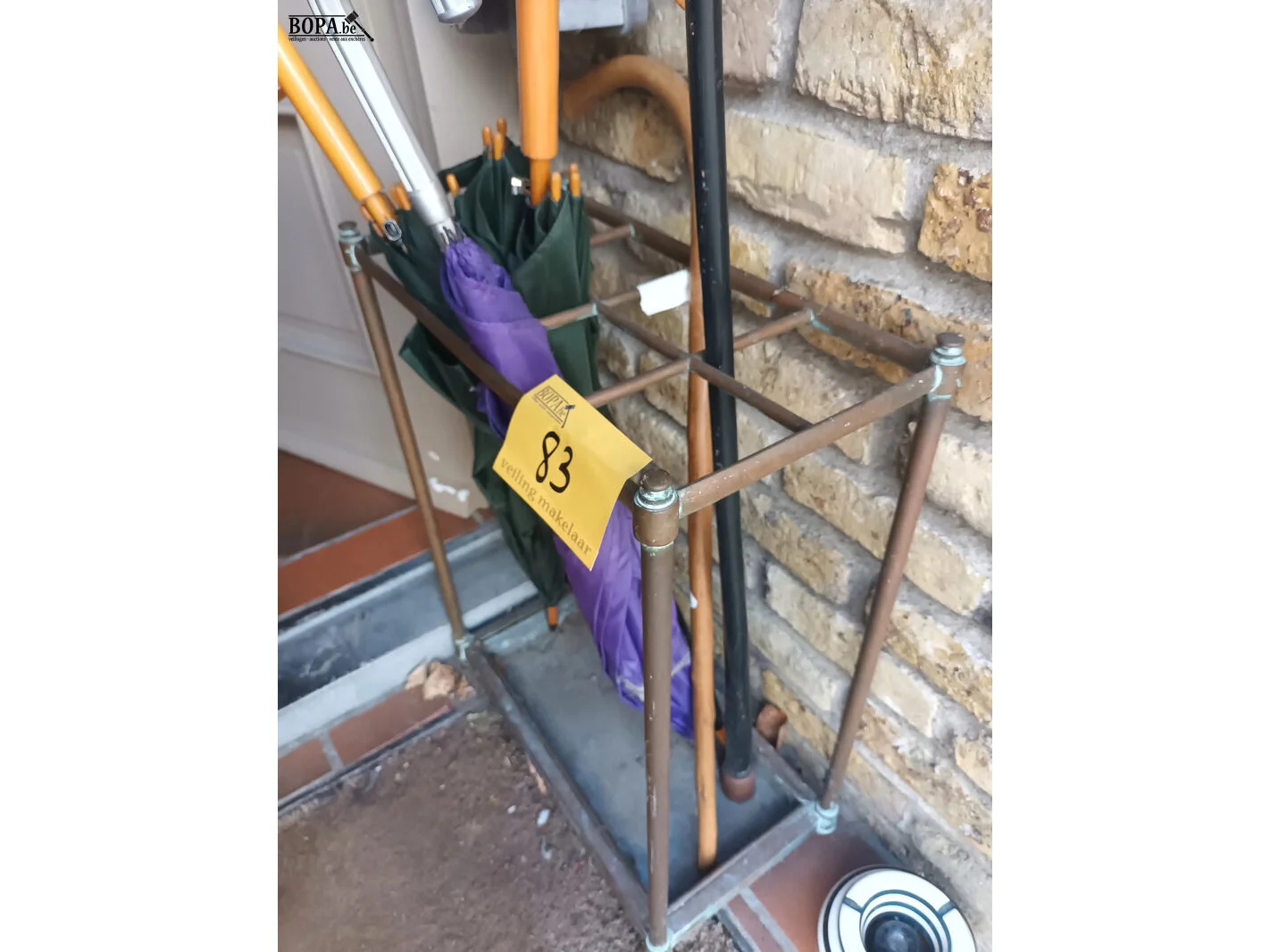 Koperen paraplubak met 2 wandelstokken en 3 paraplu’s.