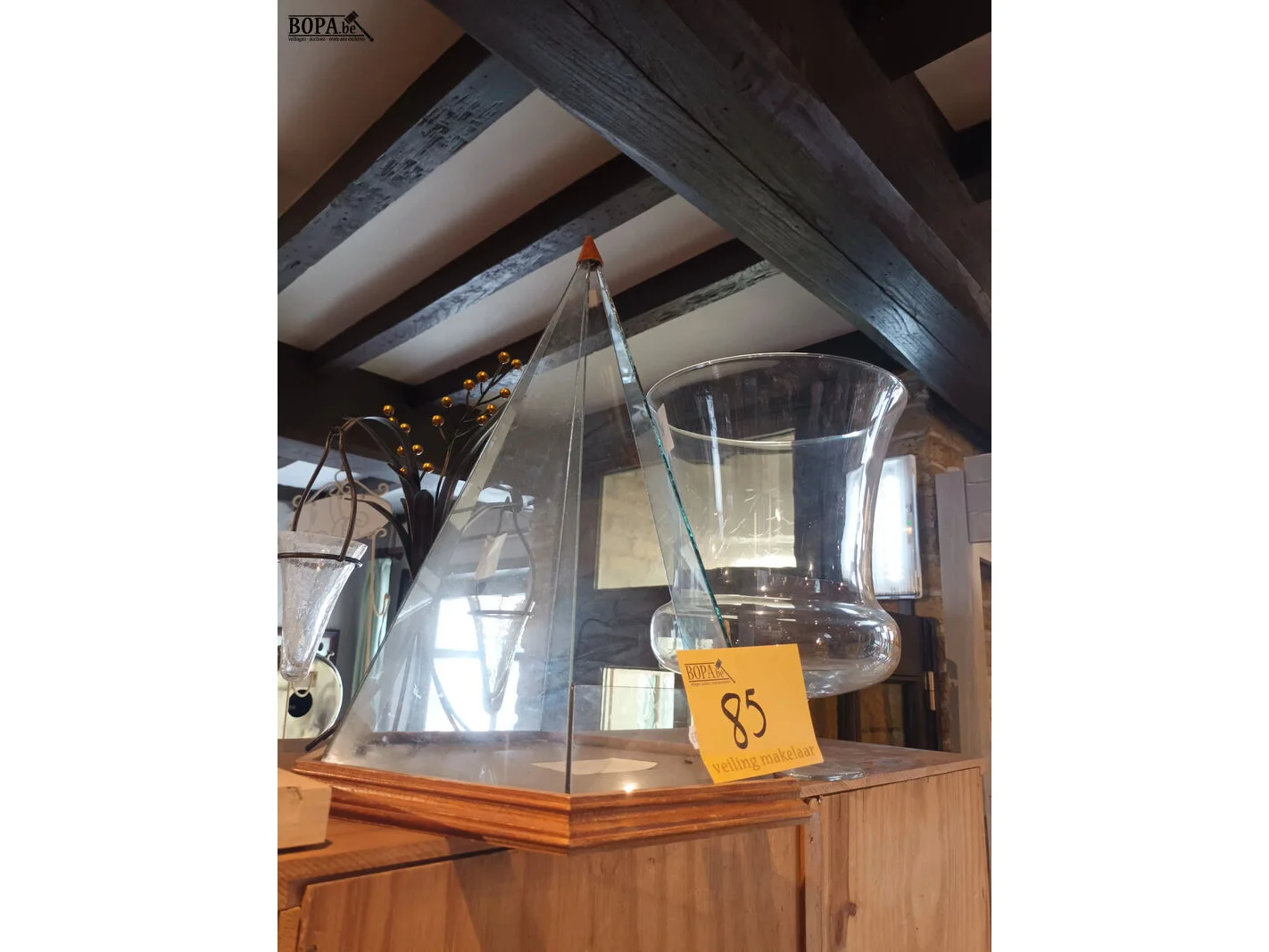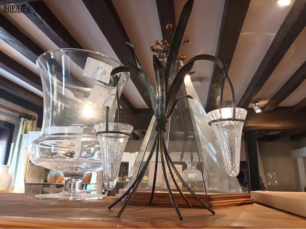 Glazen vaas, glazen piramide en ijzeren statief met glazen theelichthouders.
