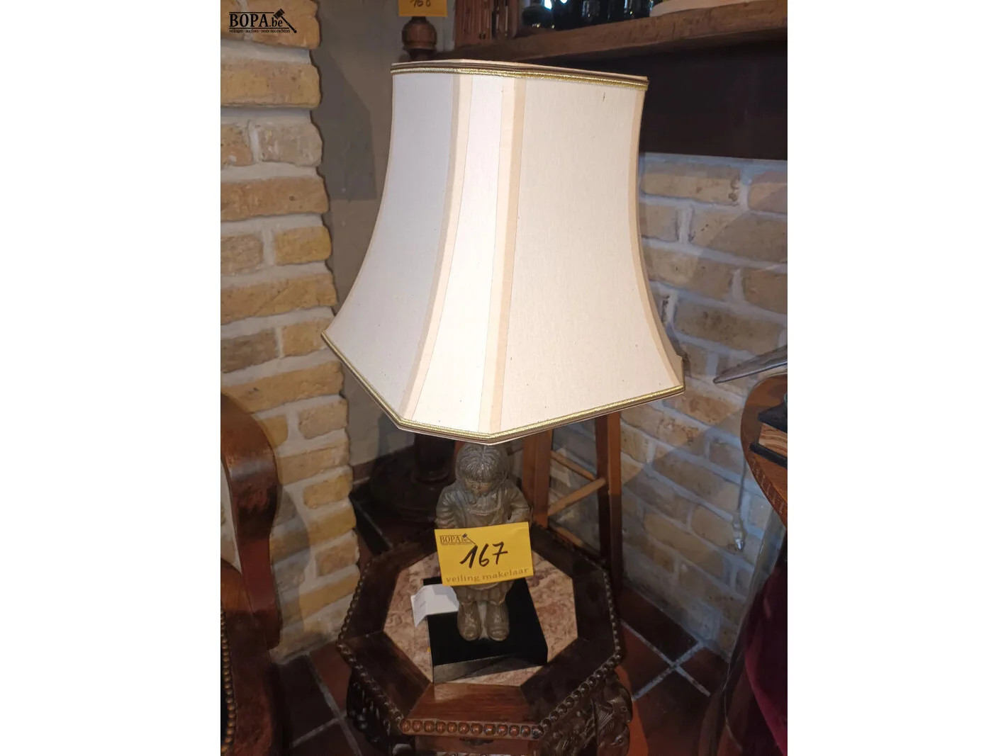 Tafellamp waarvan de voet een beeld is van Geert Kunen. Gesigneerd. Hoogte 67 cm.