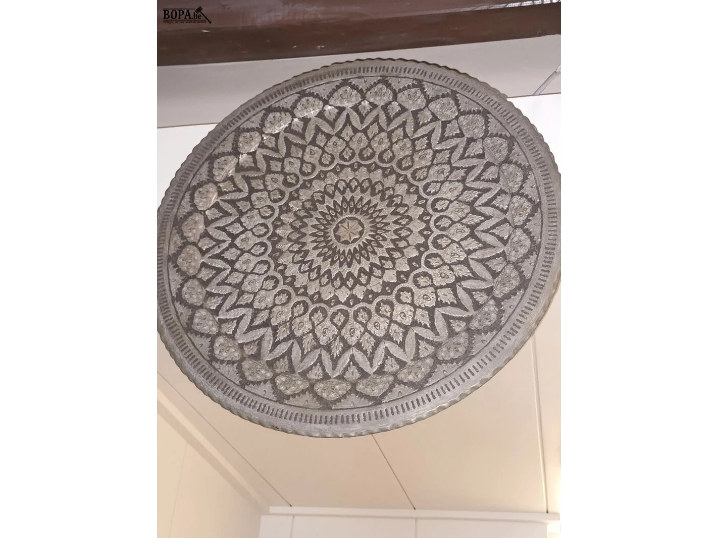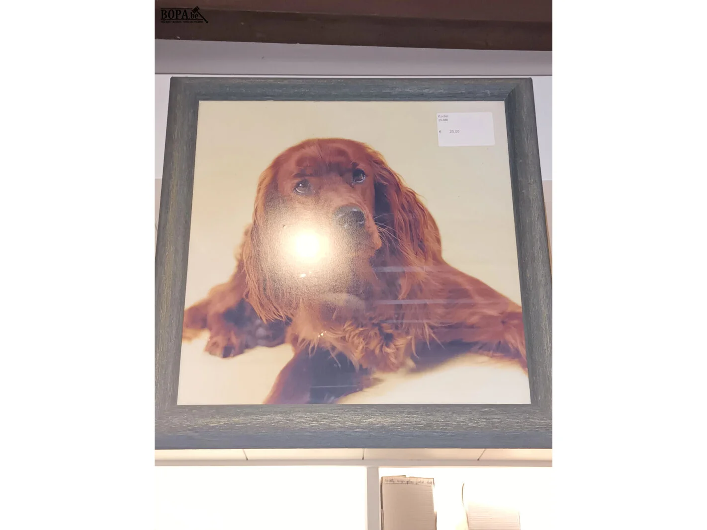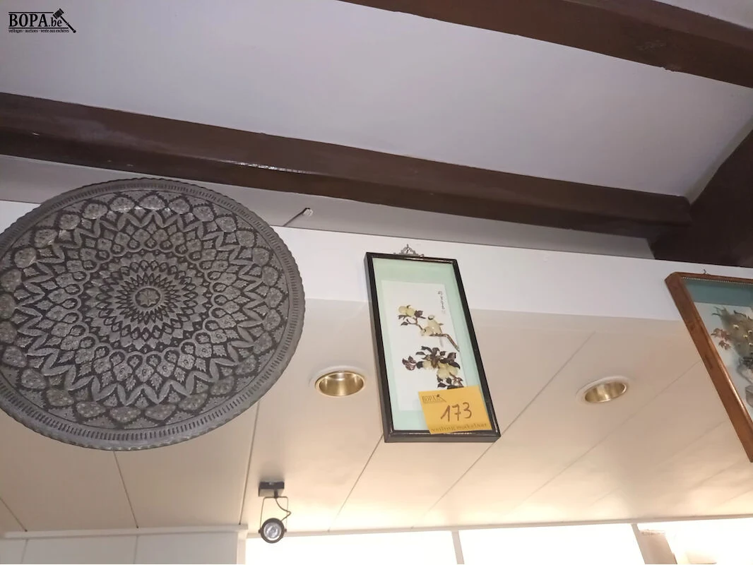 1 schaal voor theetafel, 2 oosterse kaders en een kader met een foto van een hond.