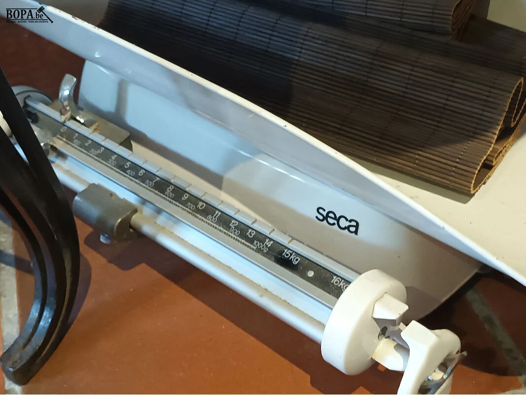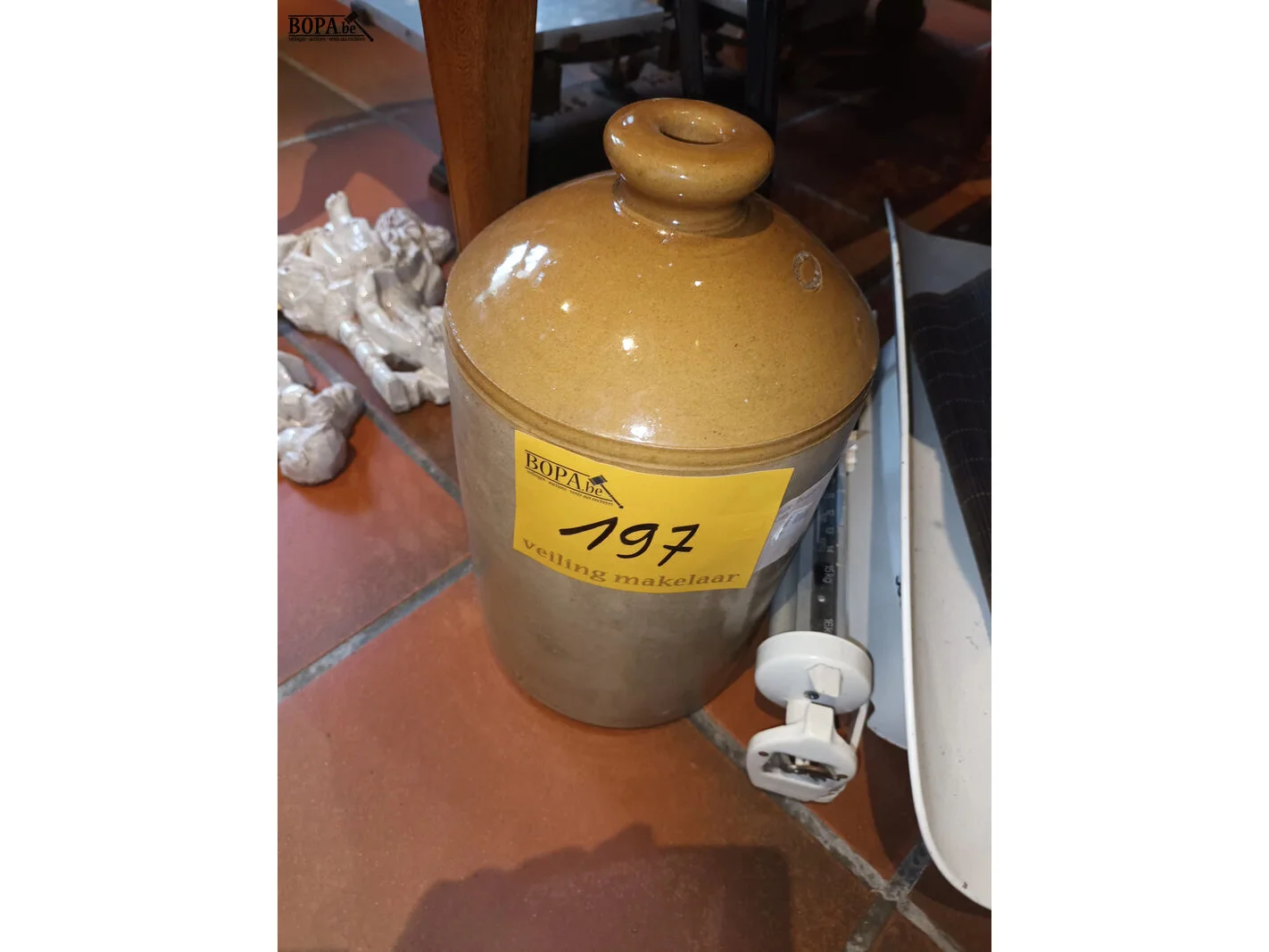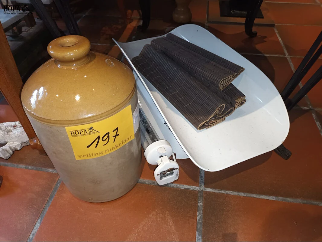 Geglazuurde rumkruik, onderleggers en een weegschaal Seca.