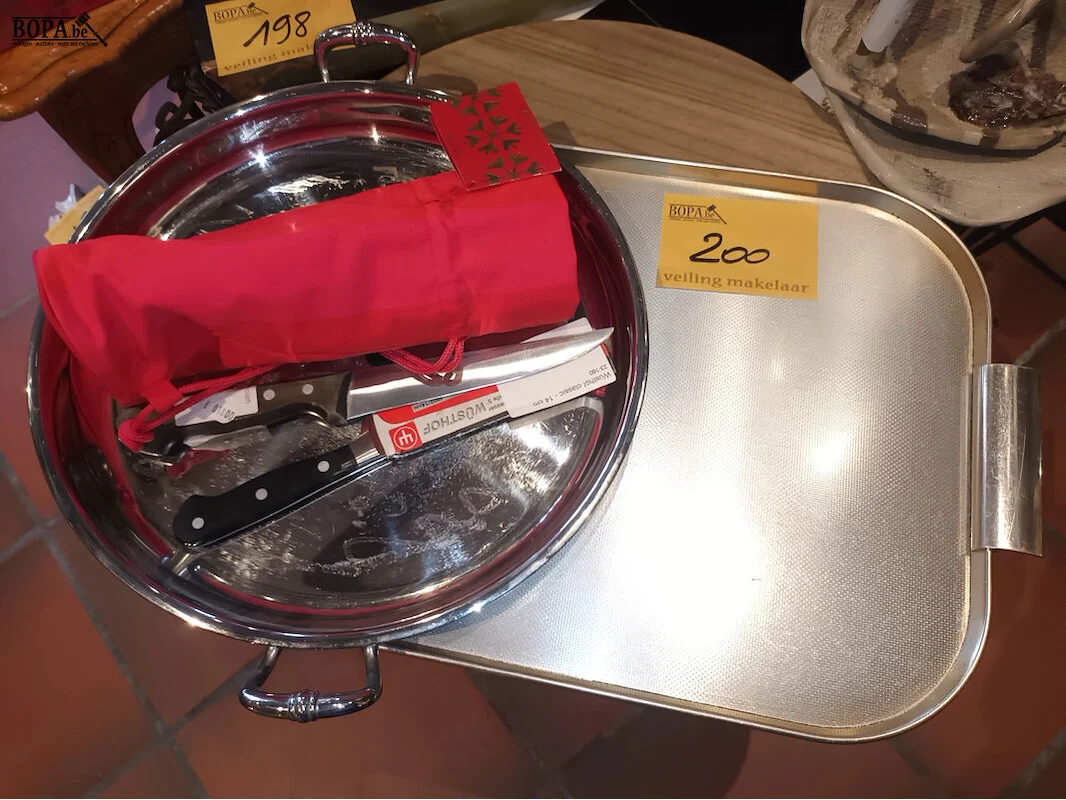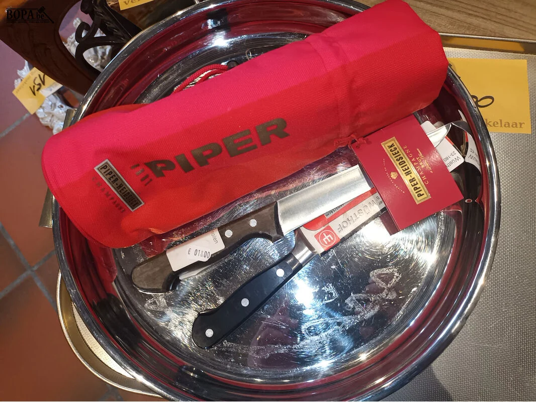 3 dienbladen waaronder een Kaymet, 2 messen en een zakje van Piper-Heidsieck.