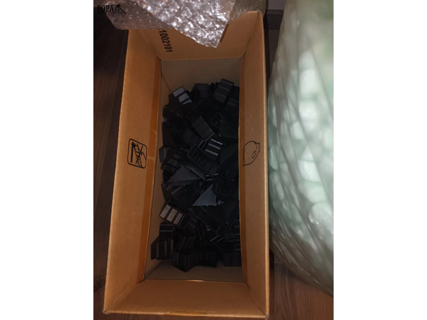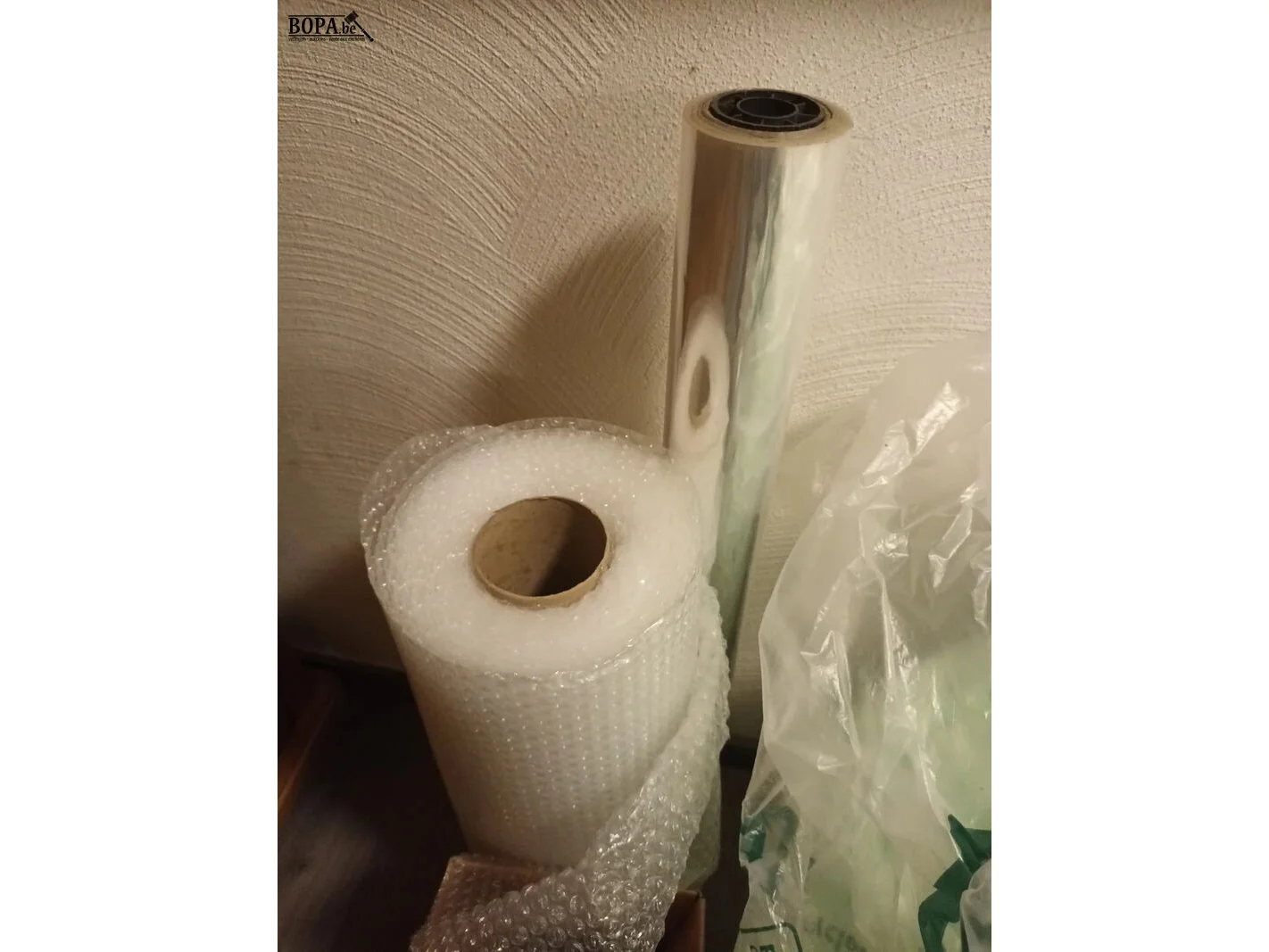 Verpakkingsmateriaal zoals isomo chips, bubble folie, hoekbeschermingsblokjes, rol plastic folie.