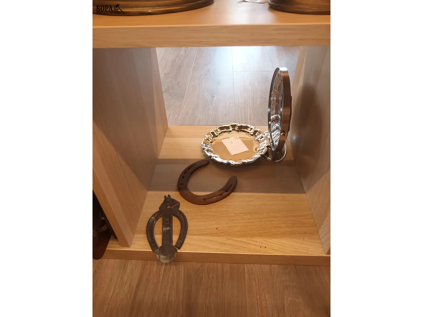 5 kastvakken met diverse decoratie waaronder koperwerk.