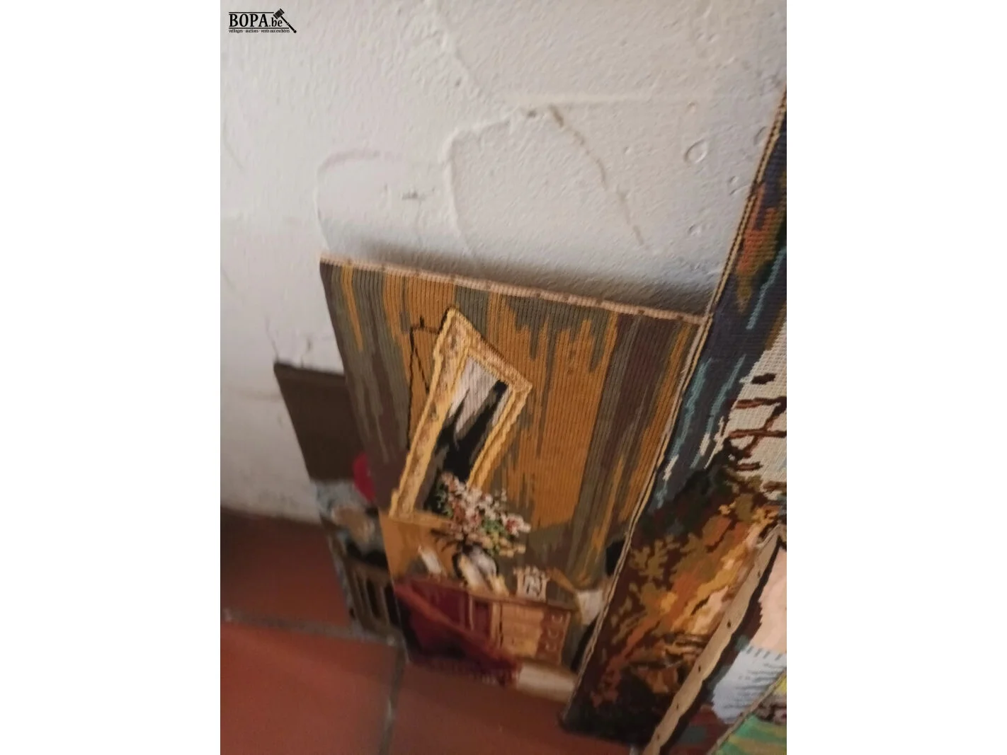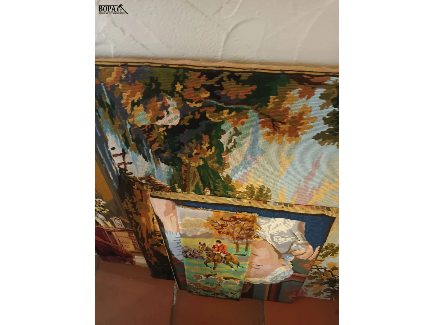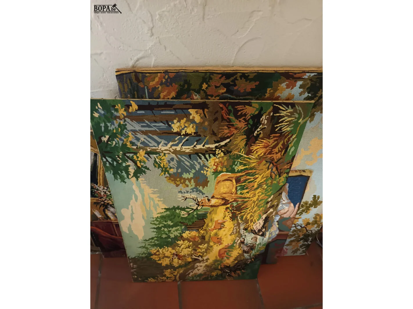 Kunstwerk in borduurwerk. 8 stuks waarvan 1 ingekaderd (80 x 65 cm).