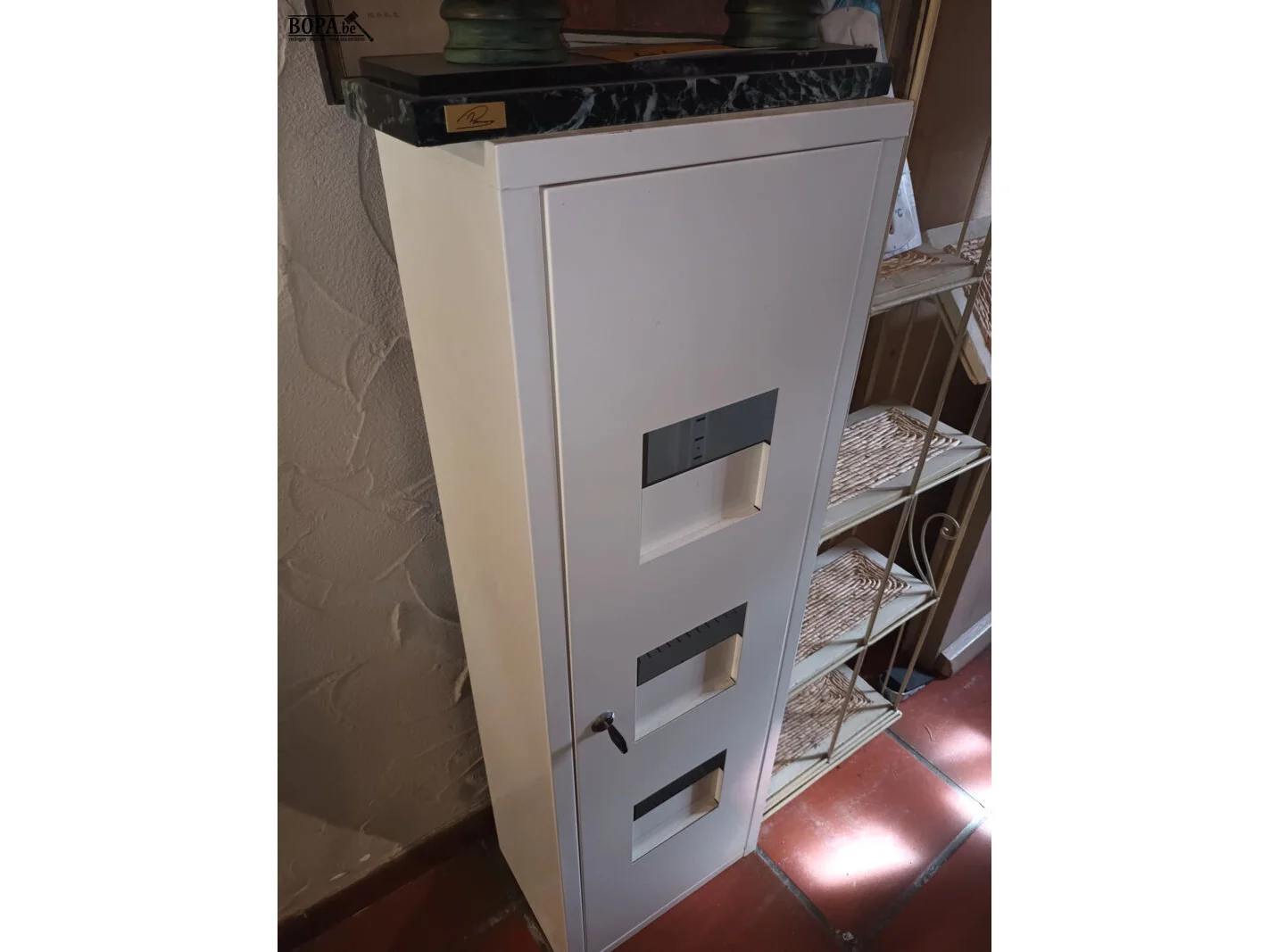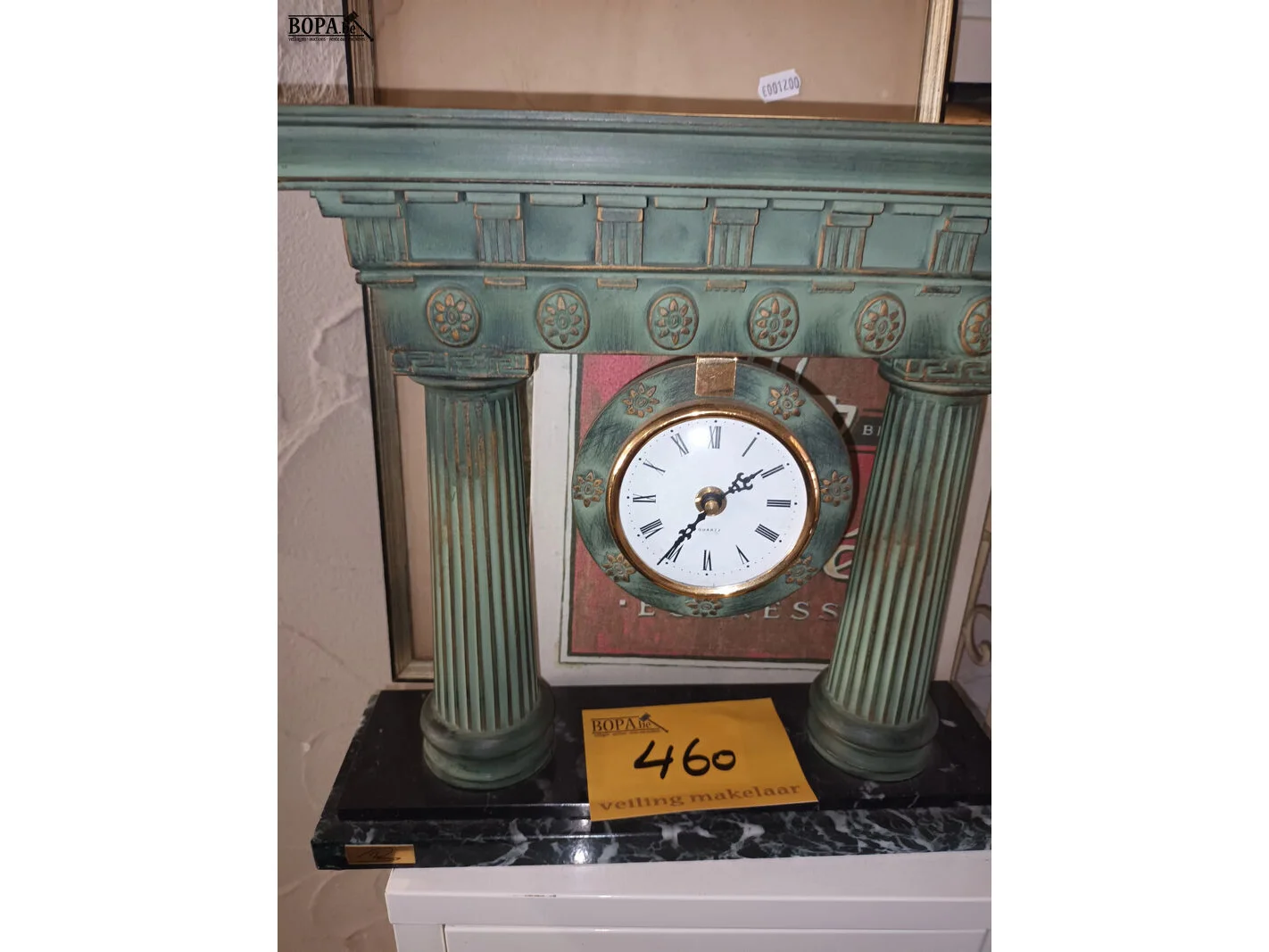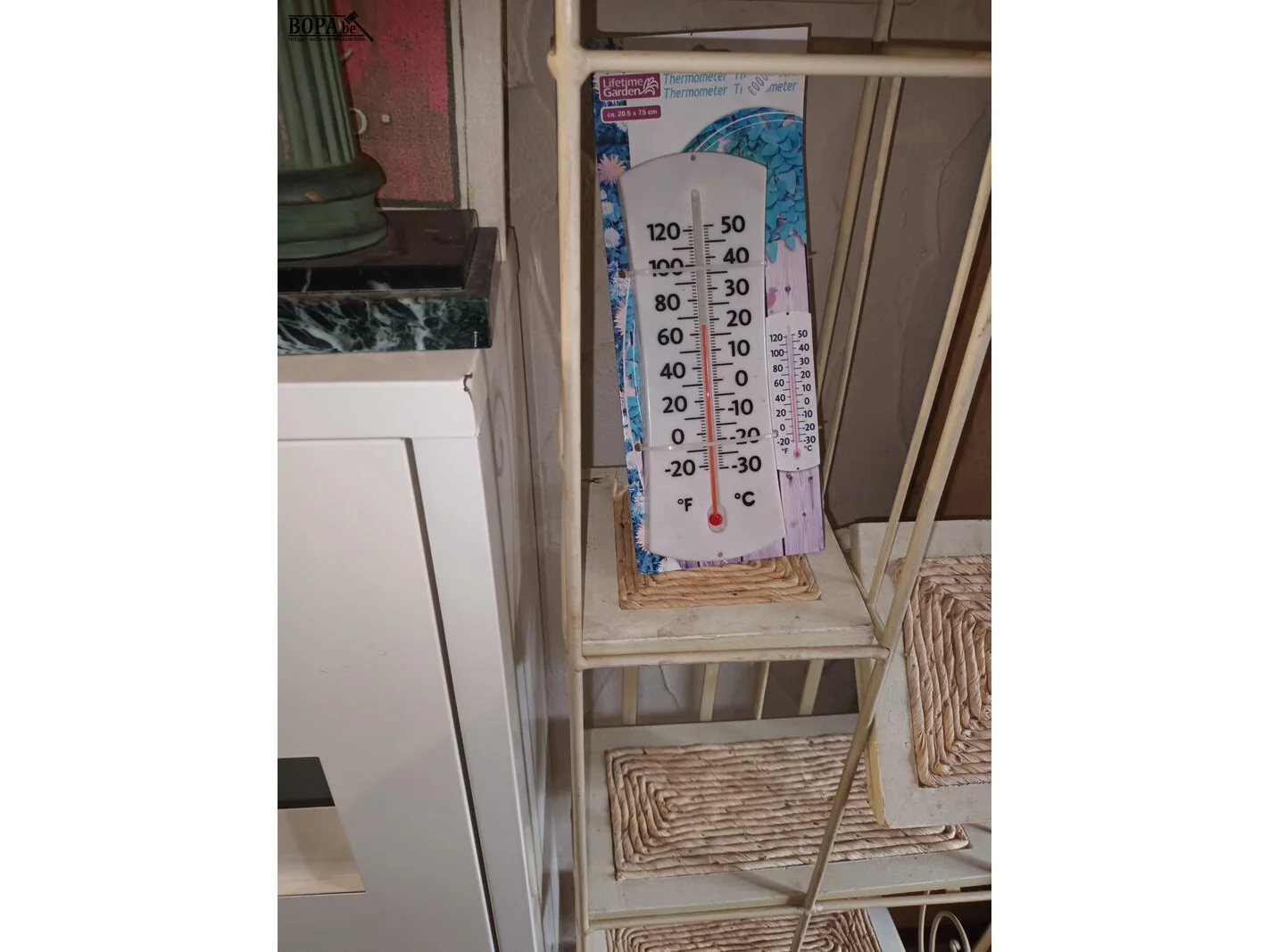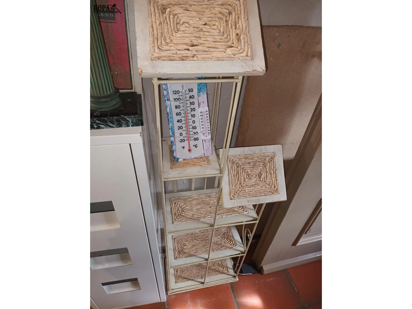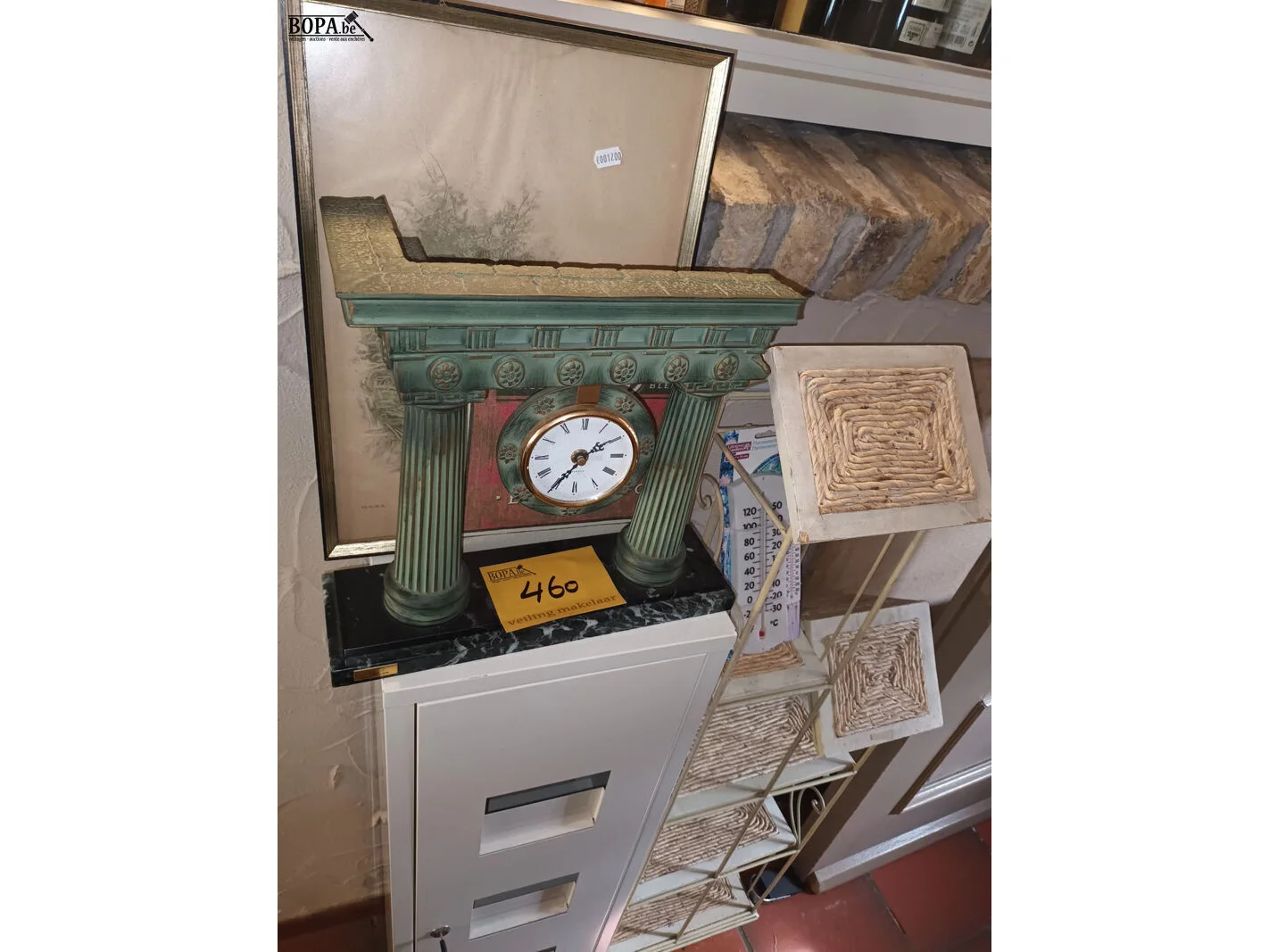 Tafelklok, 2 kaders, rekje met riet, thermometer, metalen kastje.