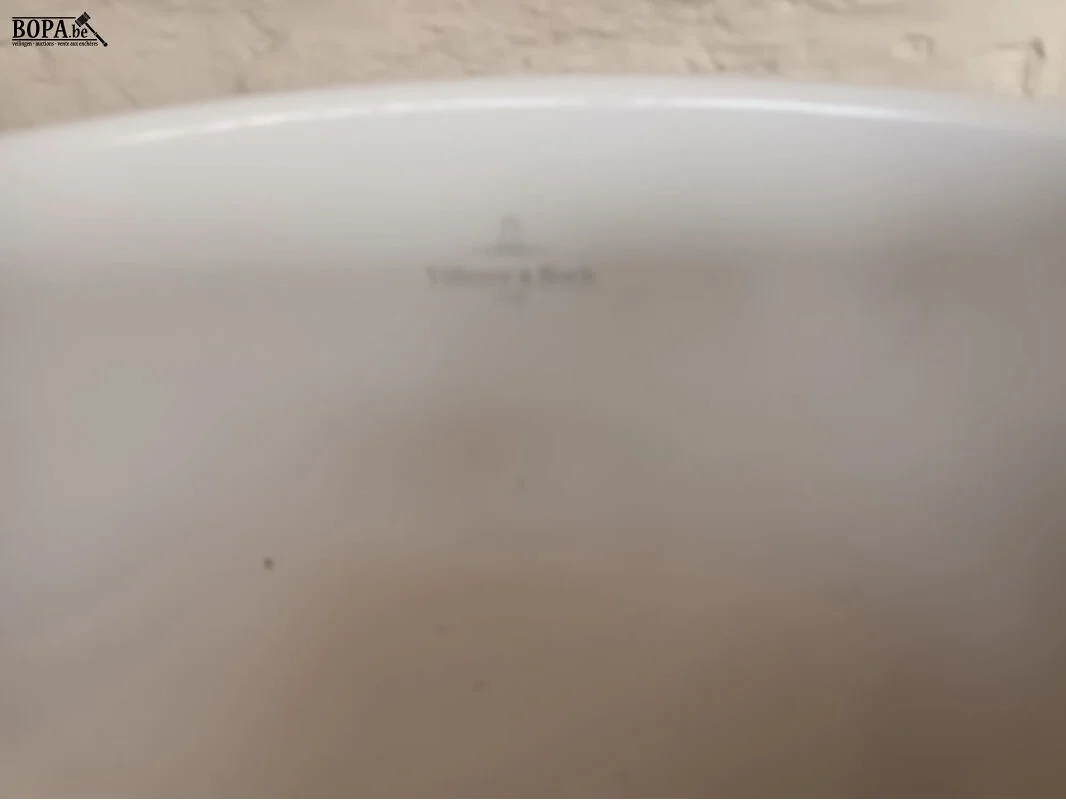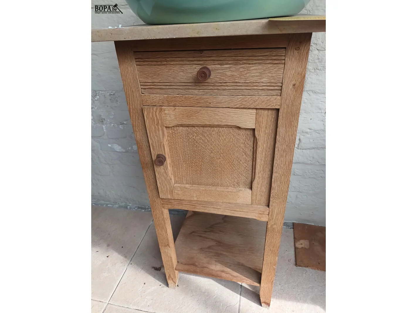 Houten bijzettafel (40 x 40 x 97 cm) met wasbak Villeroy en Boch (diameter 43 cm).