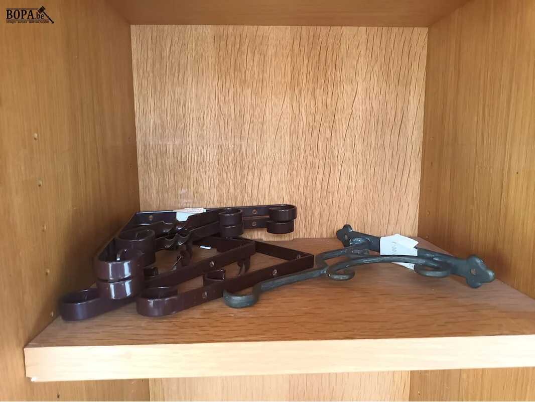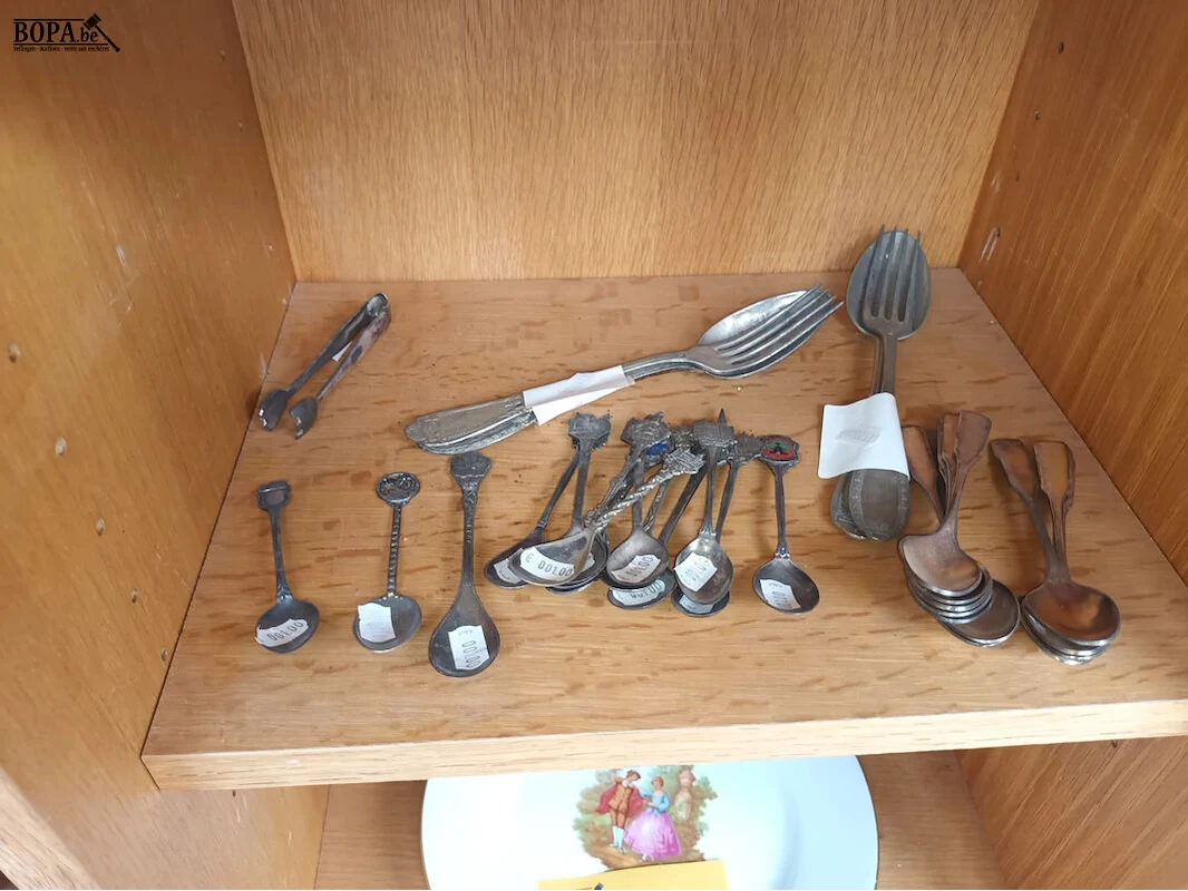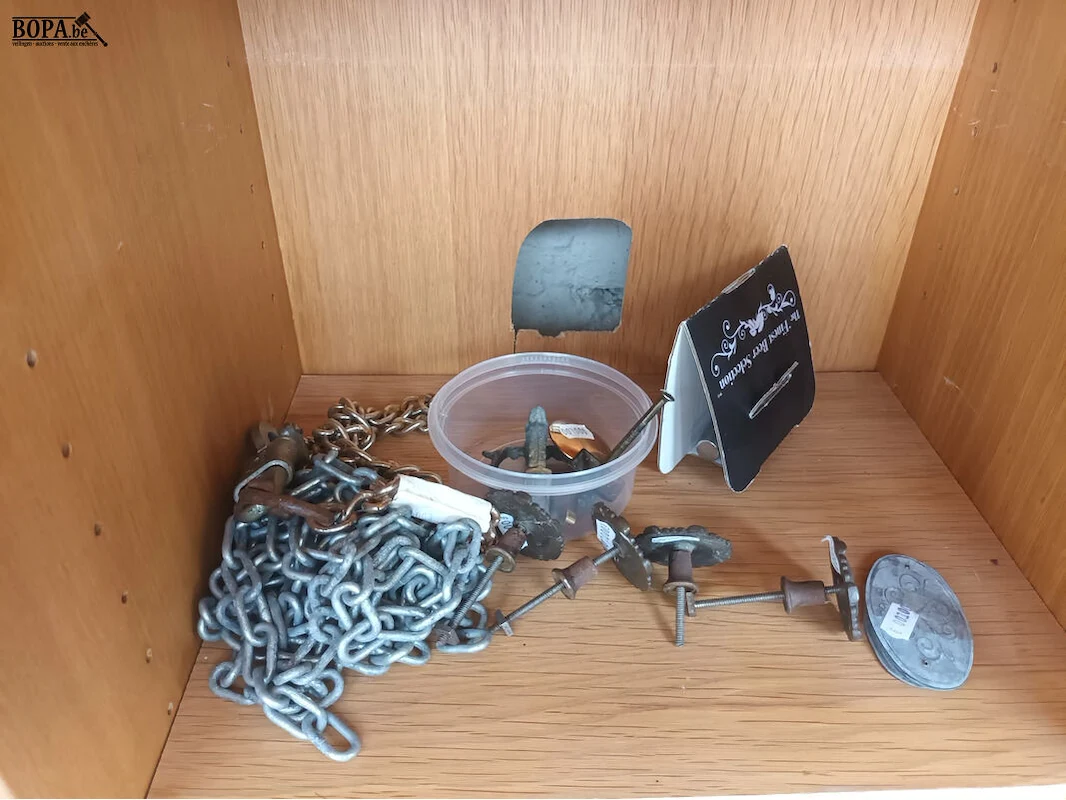 Diversen. Inhoud kast. Kast- en deurbeslag, bestek, haken voor hangpotten.