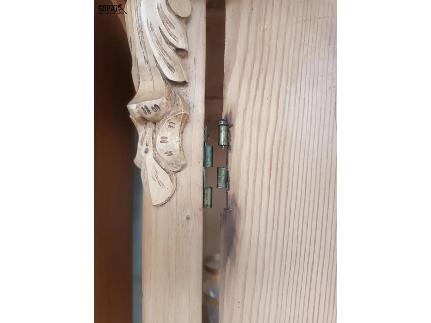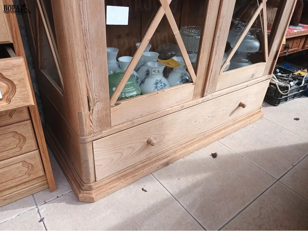 Houten vitrine kast met 2 deuren en 1 lade. 1 scharnier kapot. 120 x 50 x 196 cm.