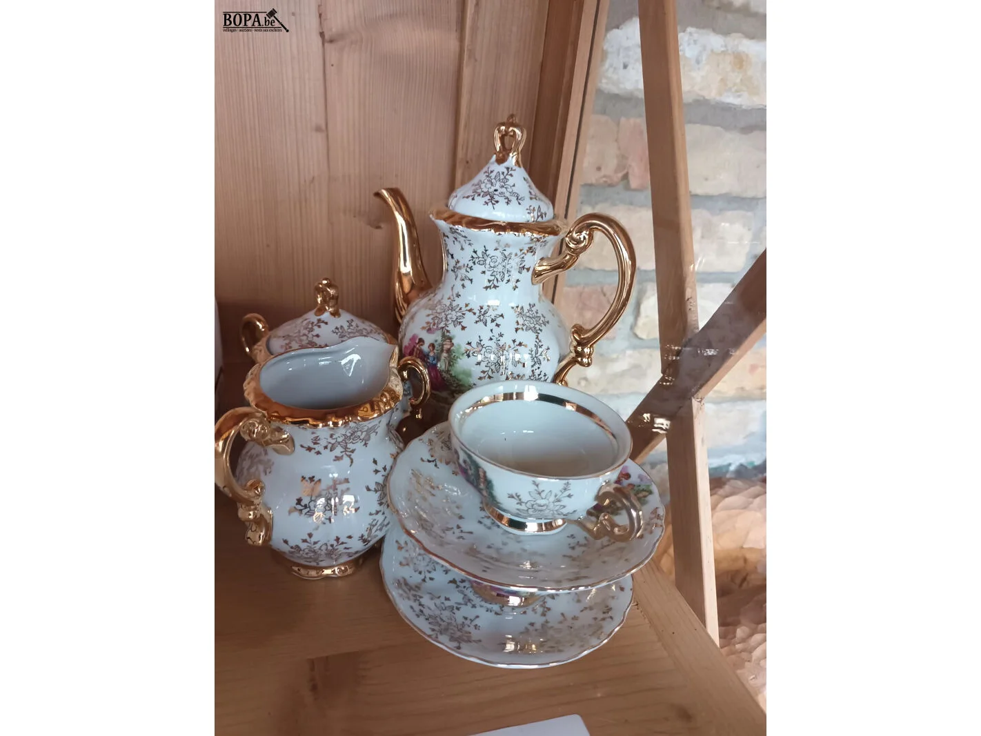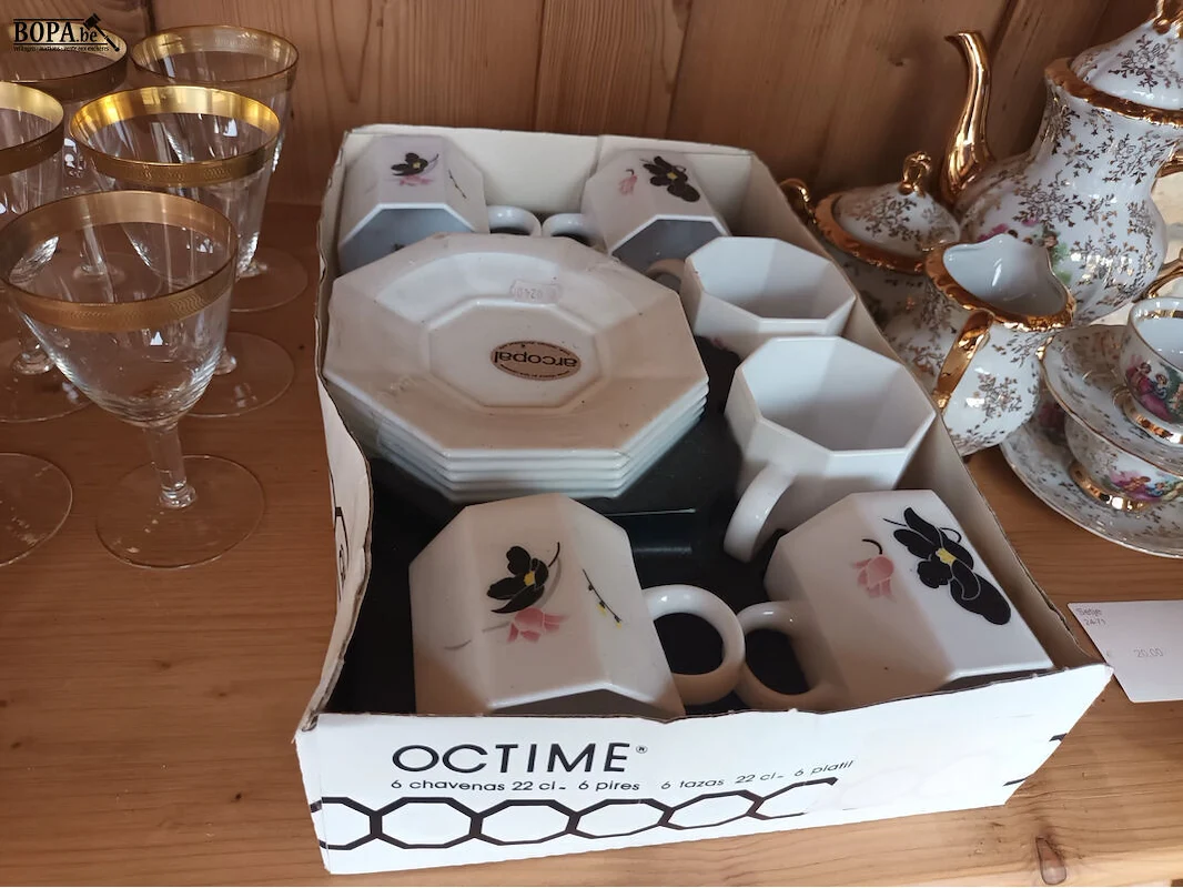 Vintage huisraad. 30 stuks. Wijnglazen met vergulde boord, Arcopal koffieservies en een koffieservies in porselein.