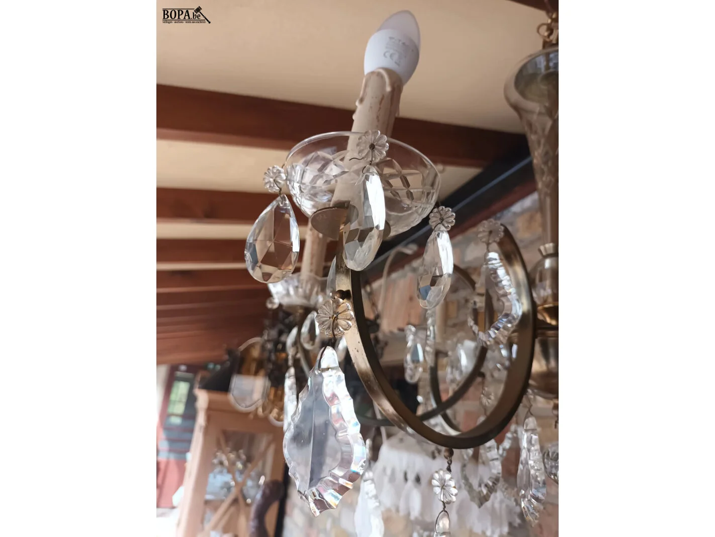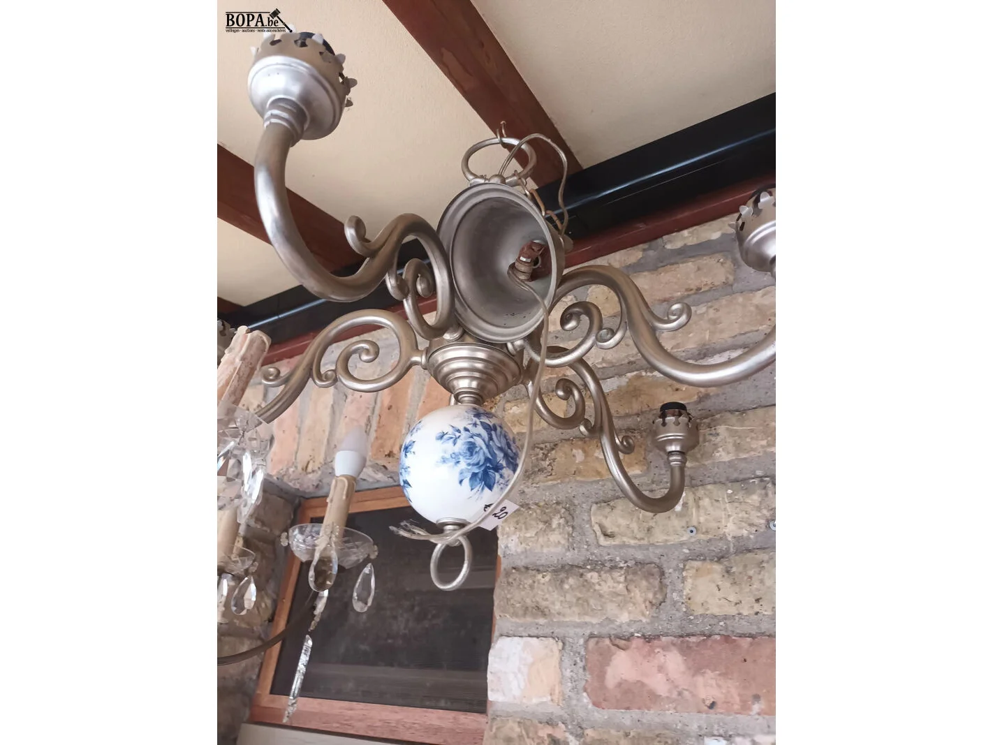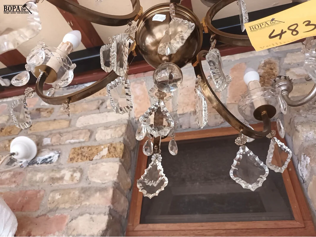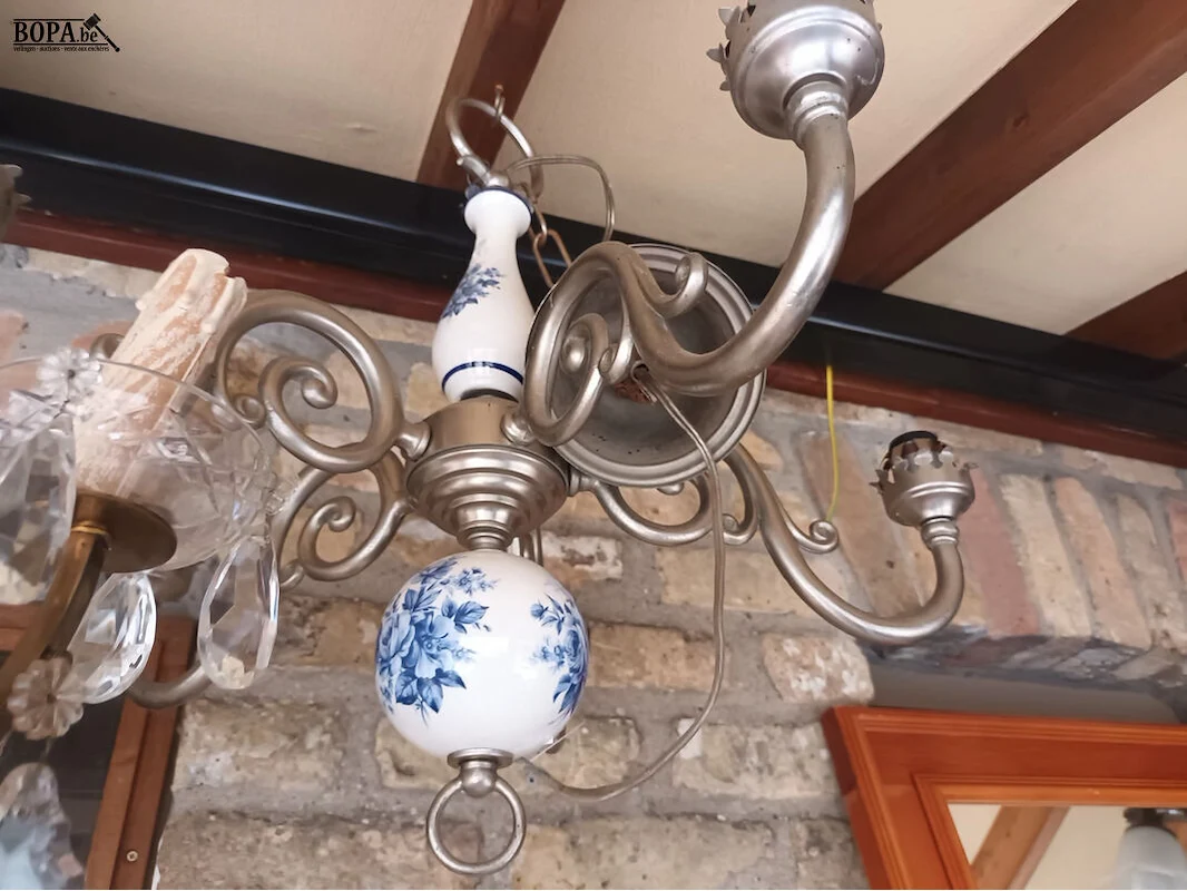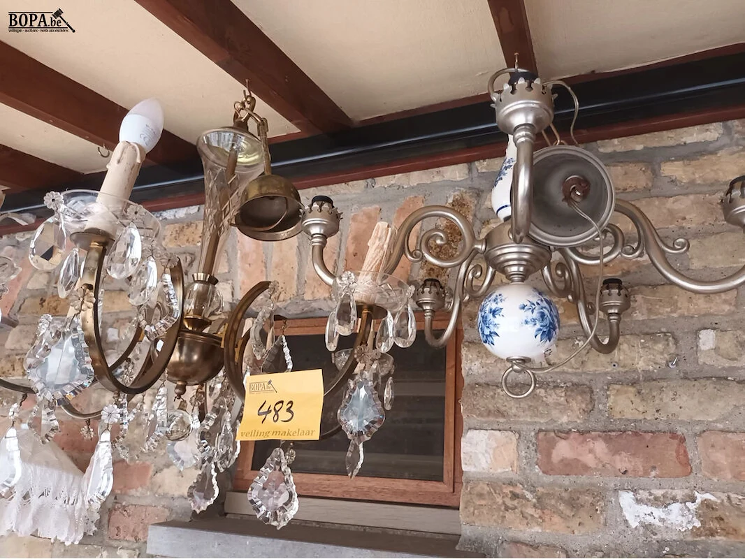 1 luster met kristallen (diameter 50 cm, hoogte 60 cm) en 1 luster in metaal en porselein.