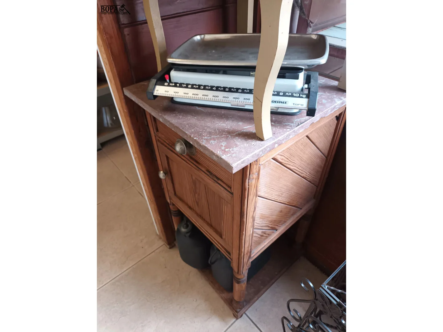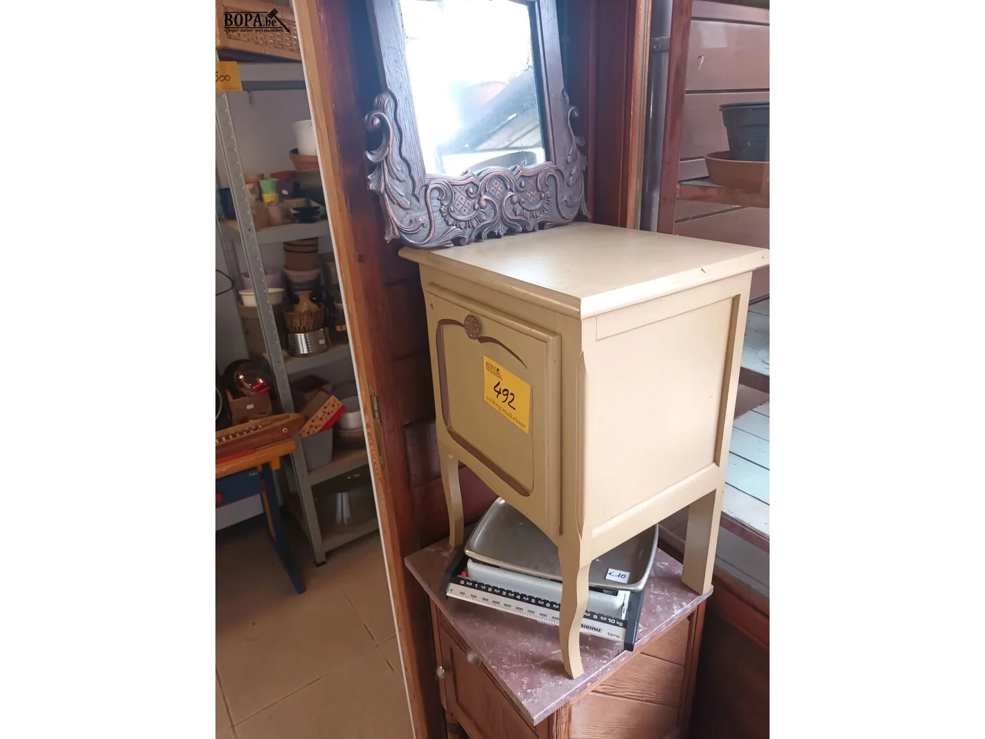 2 nachtkastjes, spiegel, weegschaal, bidons.