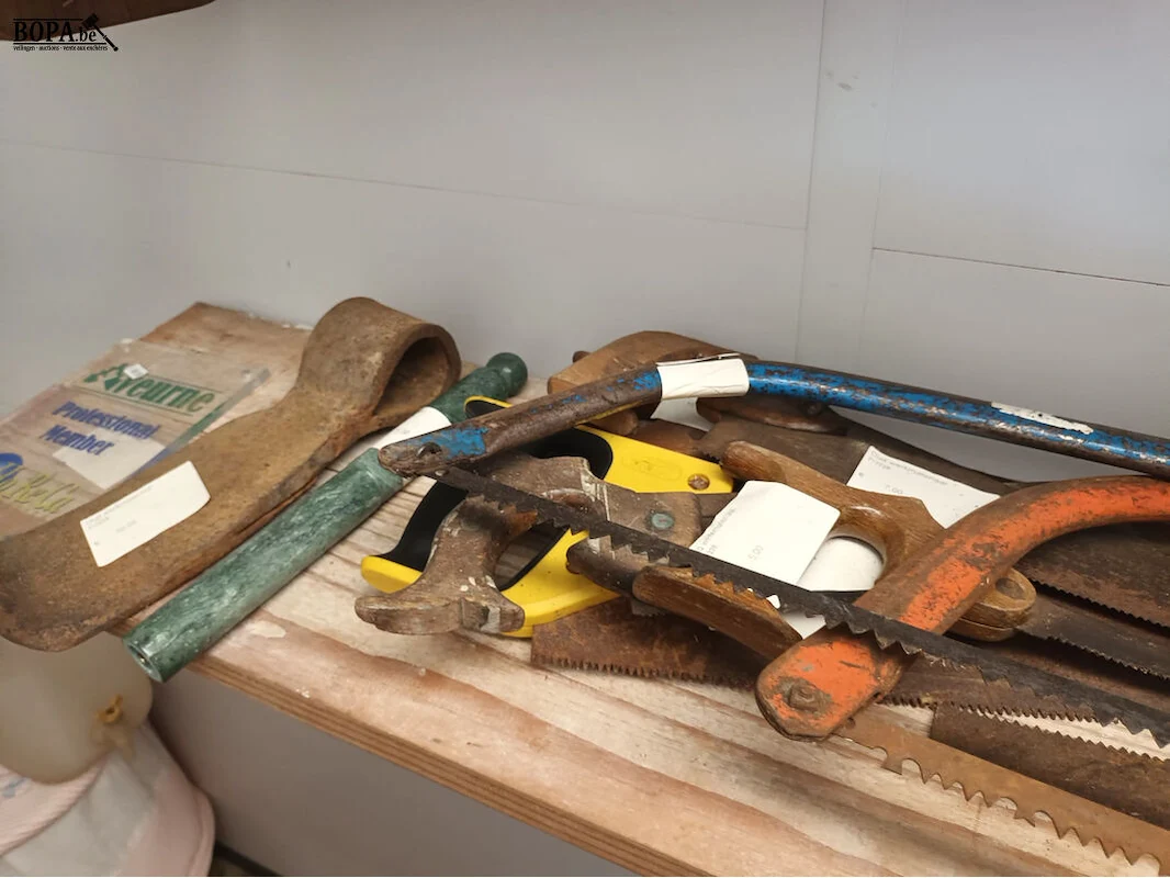 Werkmateriaal, brocante, elektro en bureau (107 x 58 x 64 cm).