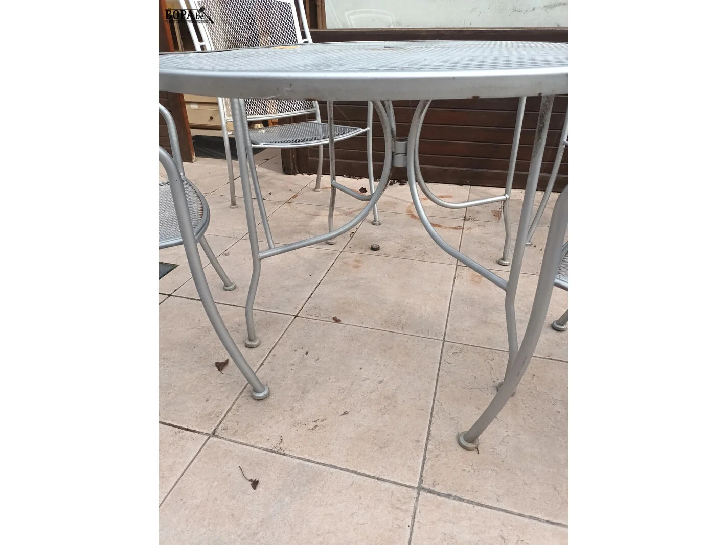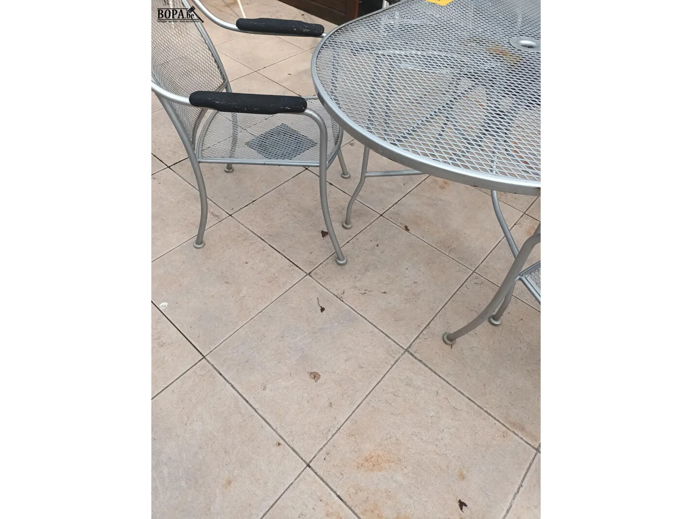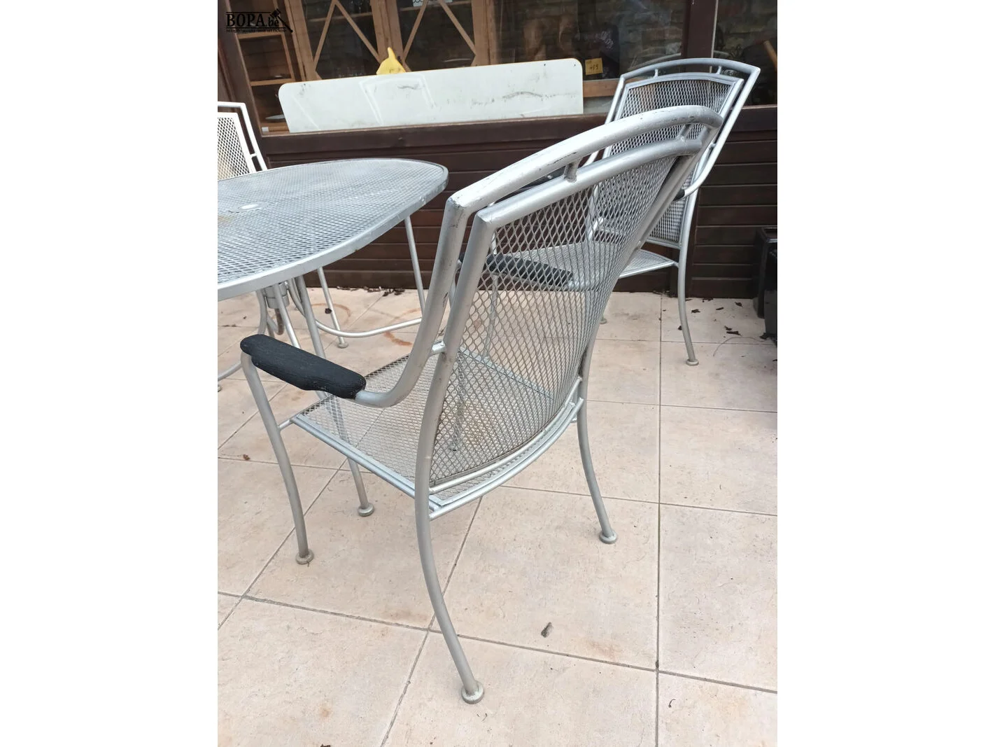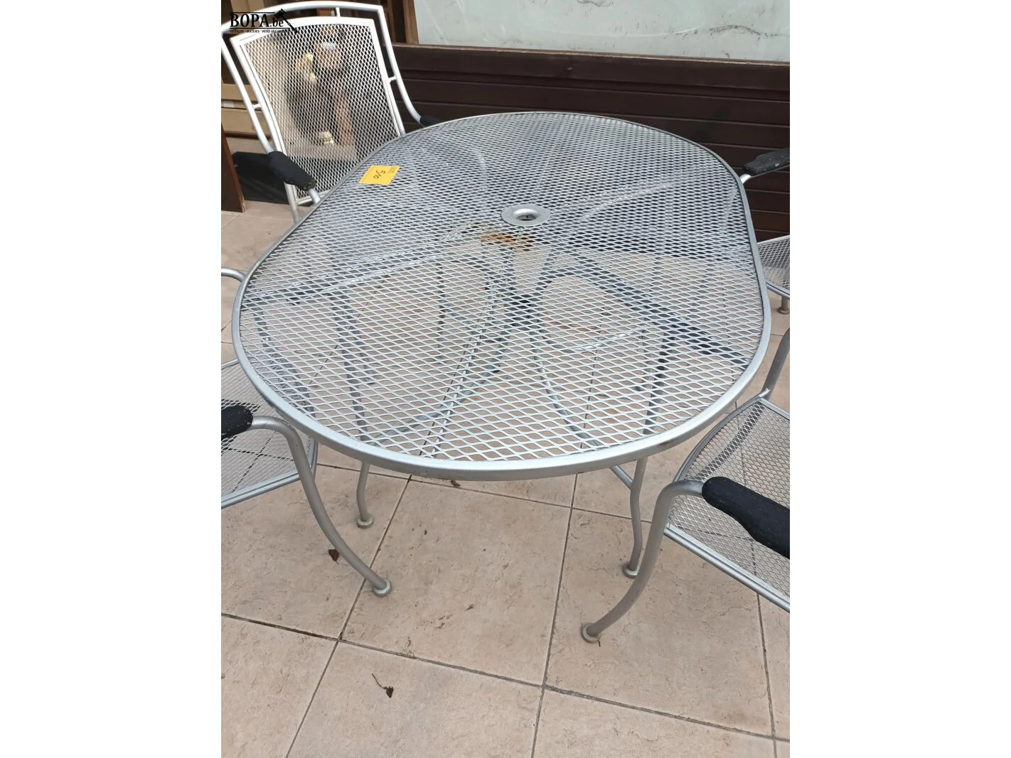 Metalen tuintafel (137 x 92 x 73 cm) en 4 stoelen.