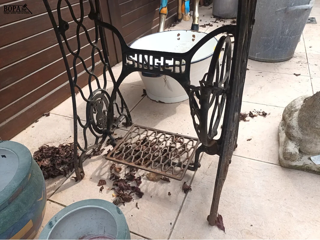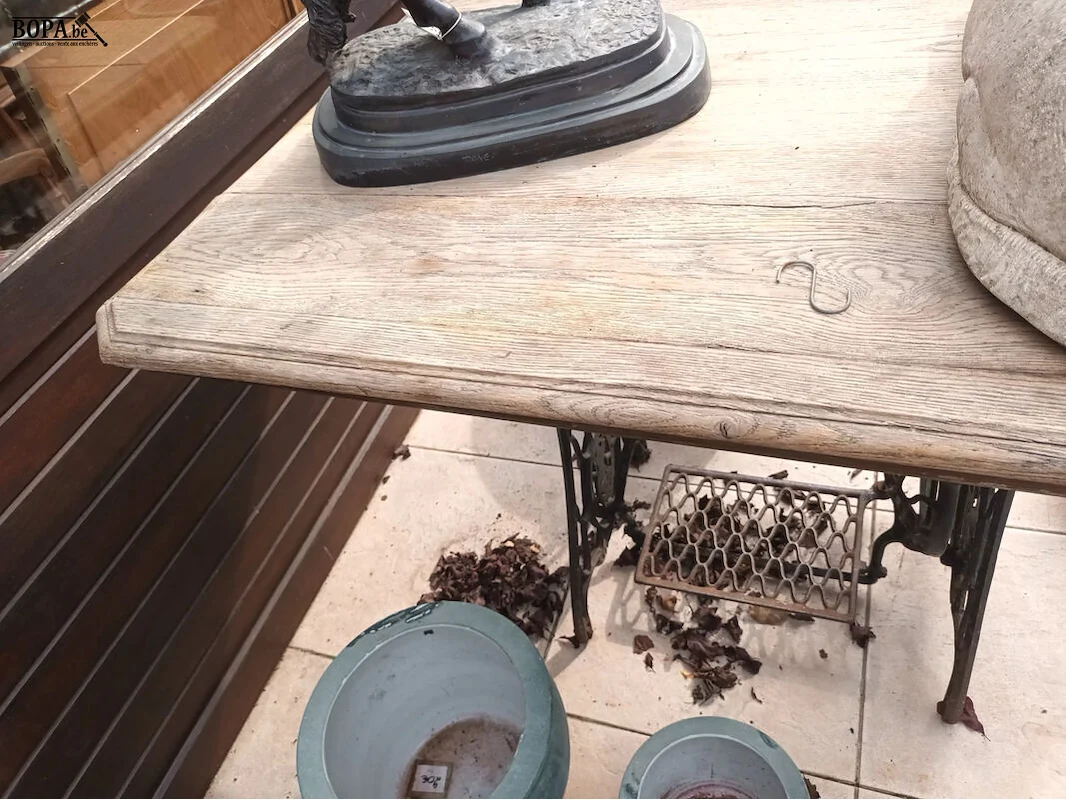 Tafel met houten blad en smeedijzeren onderstel van een Singer naaimachine. 118 x 82 x 77 cm.