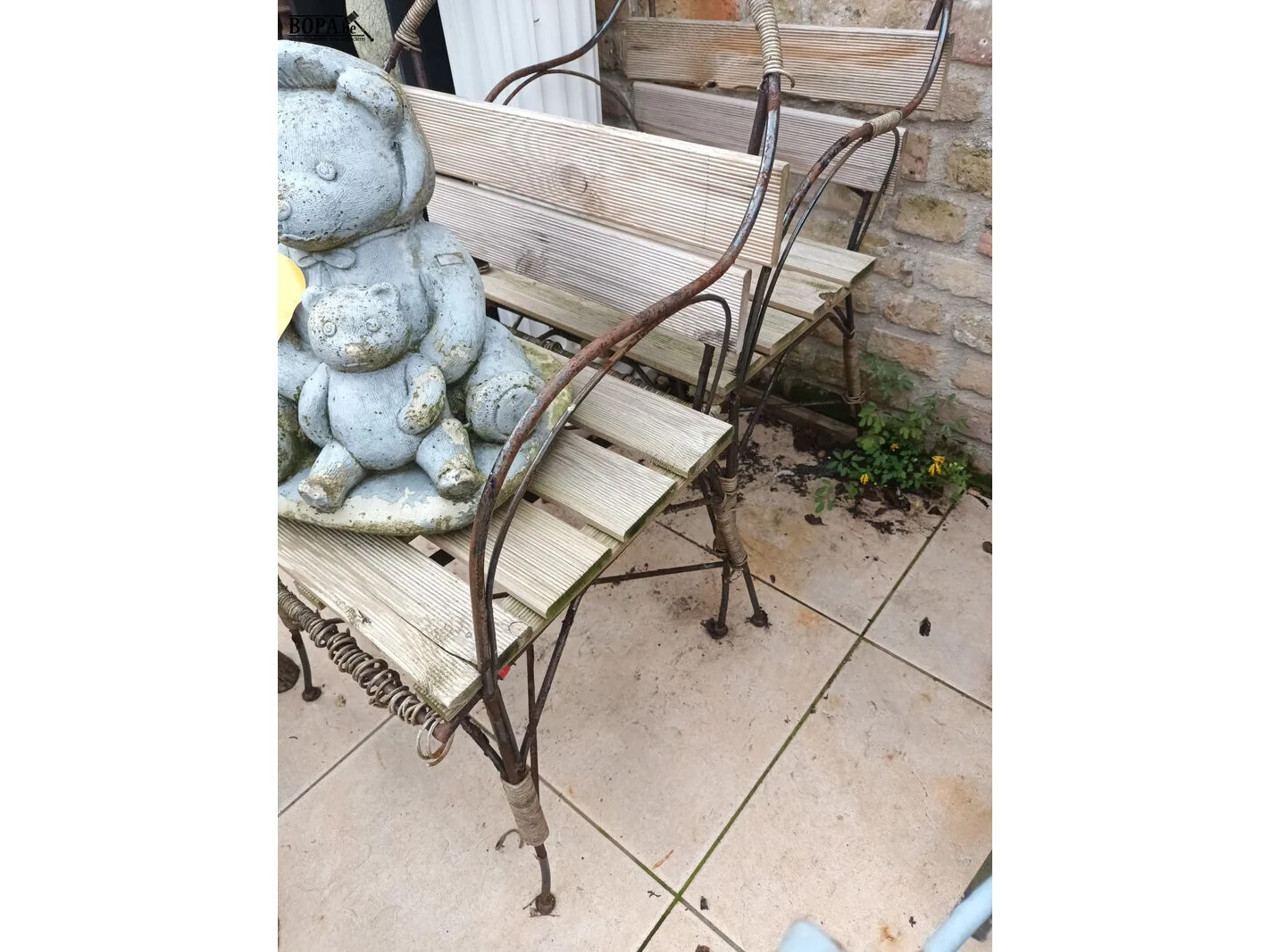 2 tuinstoelen met ijzeren frame en houten zitting. 45 x 45 x 90 cm.