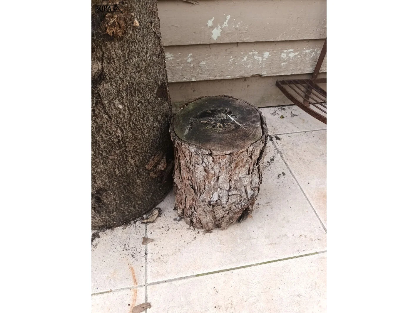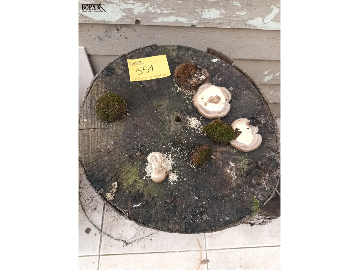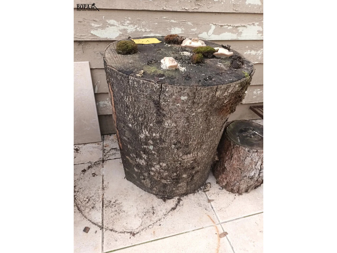 Houtblok. 2 stuks. De grootste heeft een diameter van 49 cm en een hoogte van 58 cm.