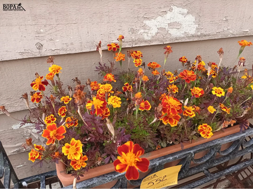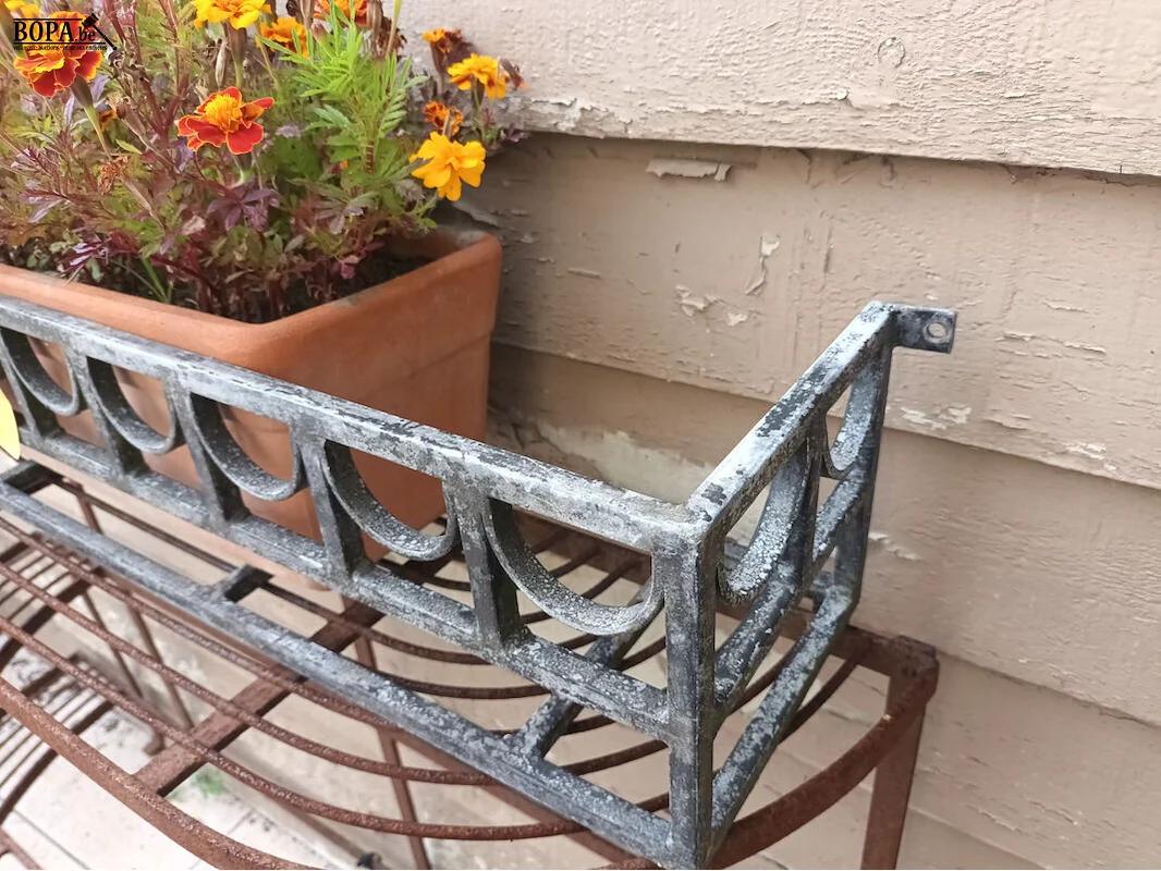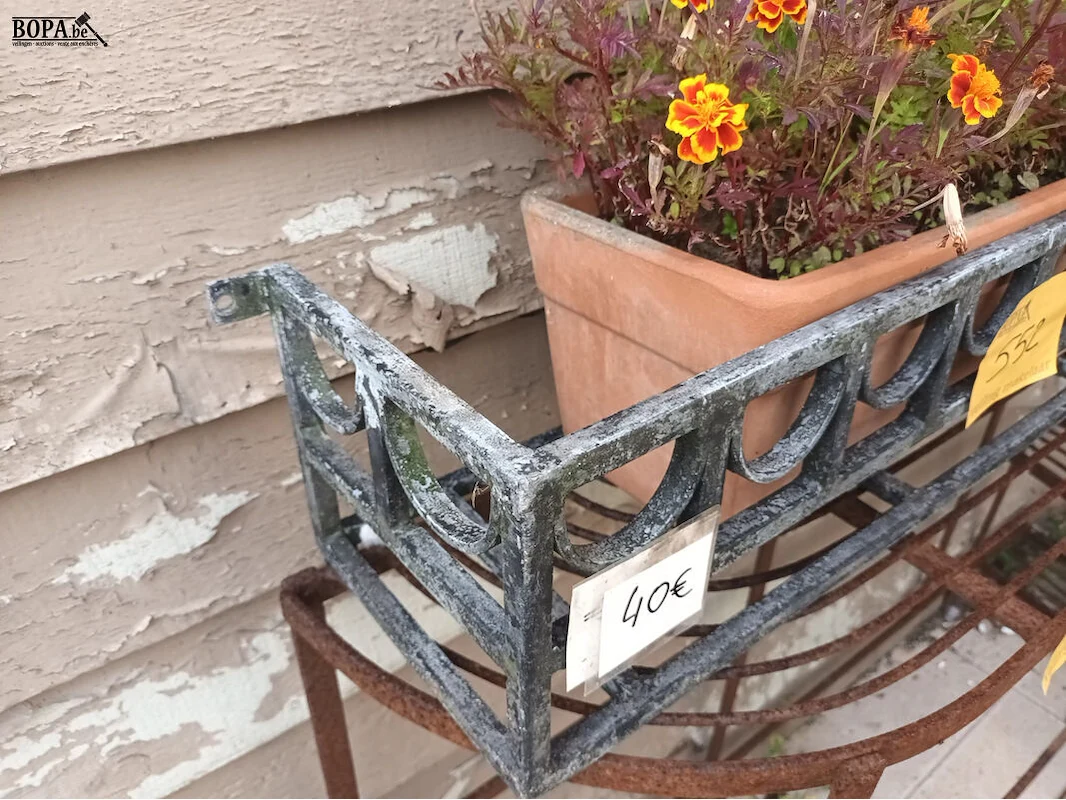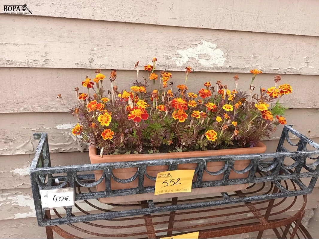 Ijzeren bloembakhouder (84 x 19 x 17 cm) en bloembak met bloemen.