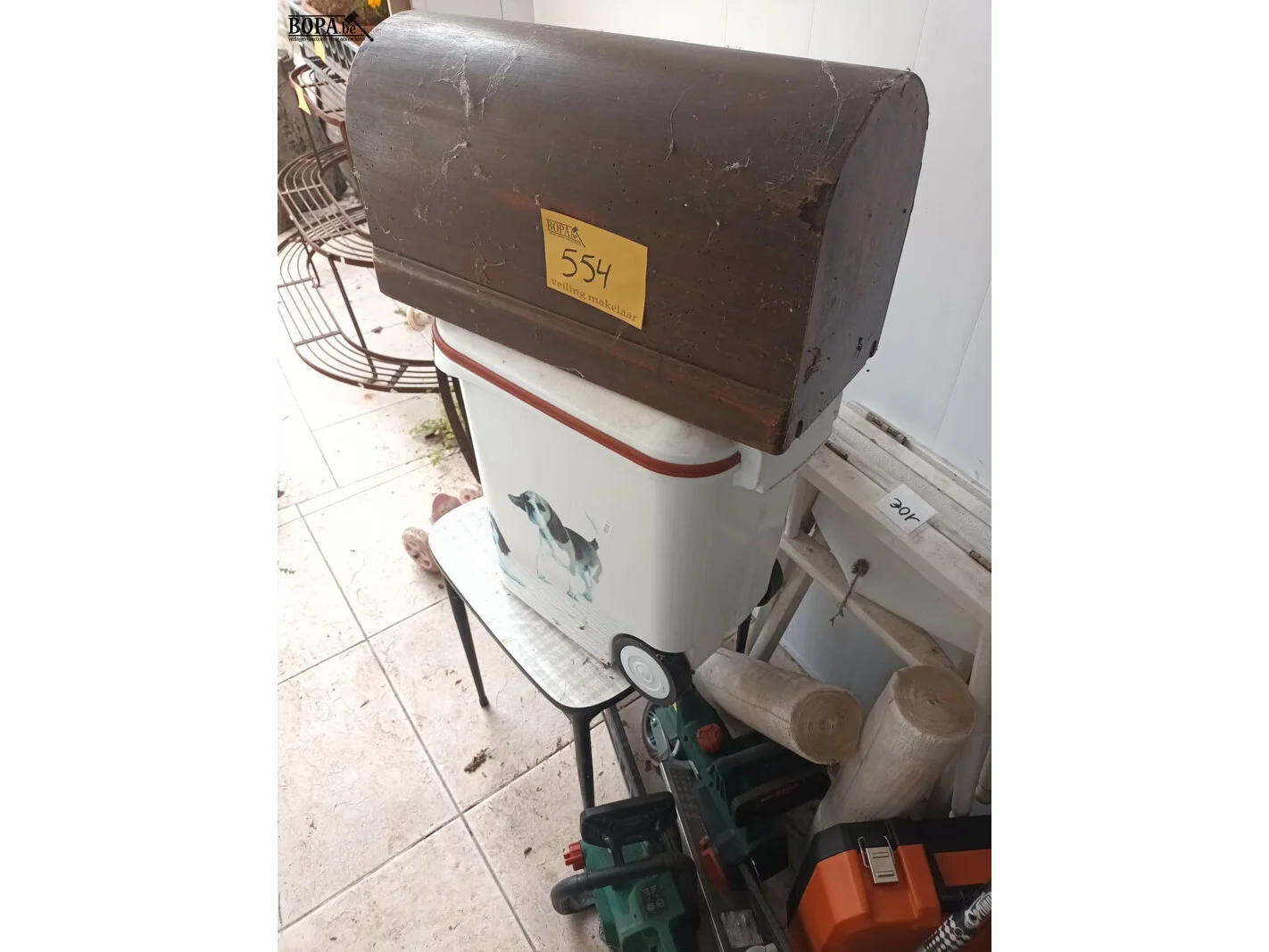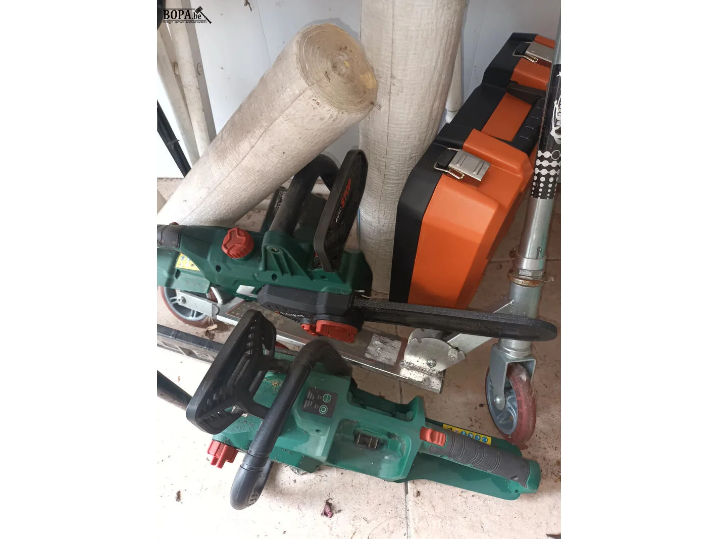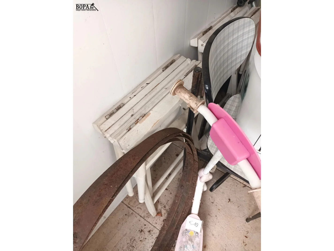 Lot diversen zoals een stoel, pvc bakje, houten deksel, behangpapier, kindersteps, duigen, kettingzagen, etc.