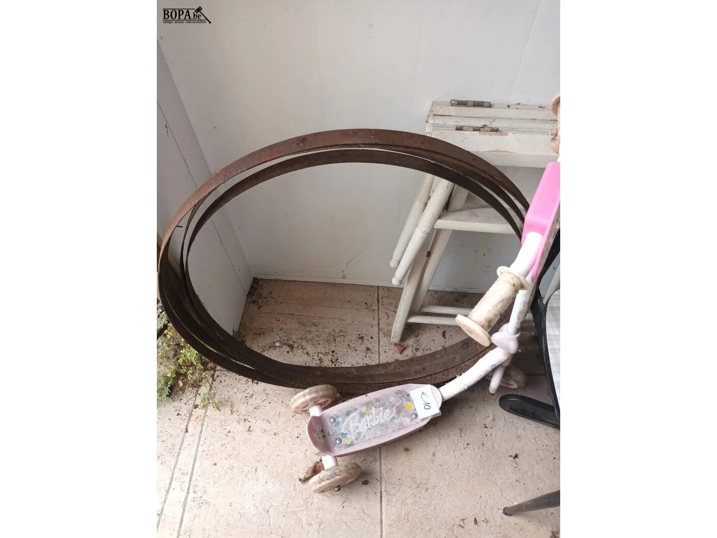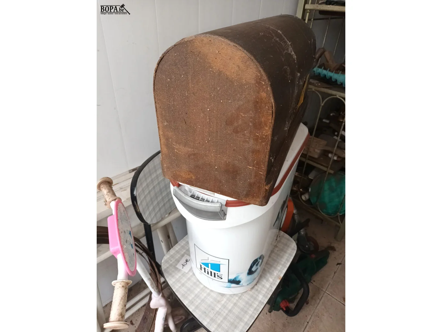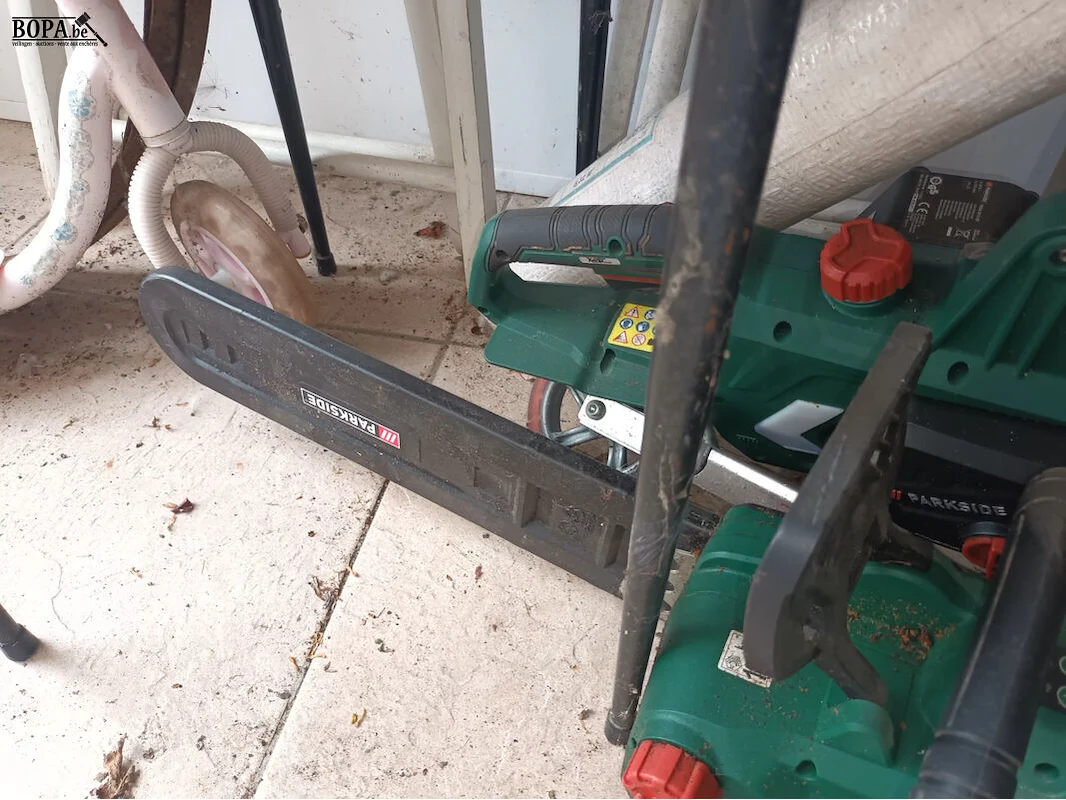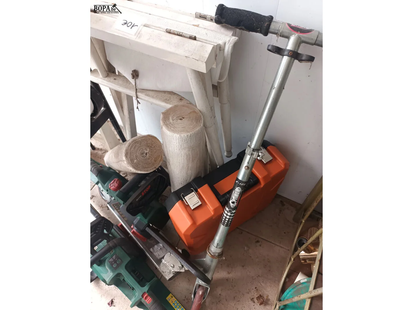 Lot diversen zoals een stoel, pvc bakje, houten deksel, behangpapier, kindersteps, duigen, kettingzagen, etc.