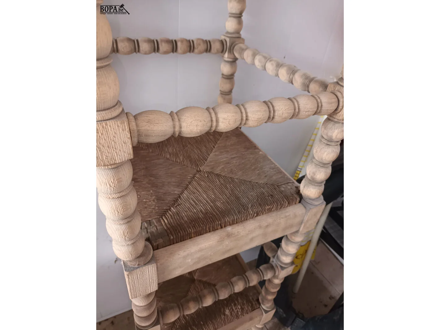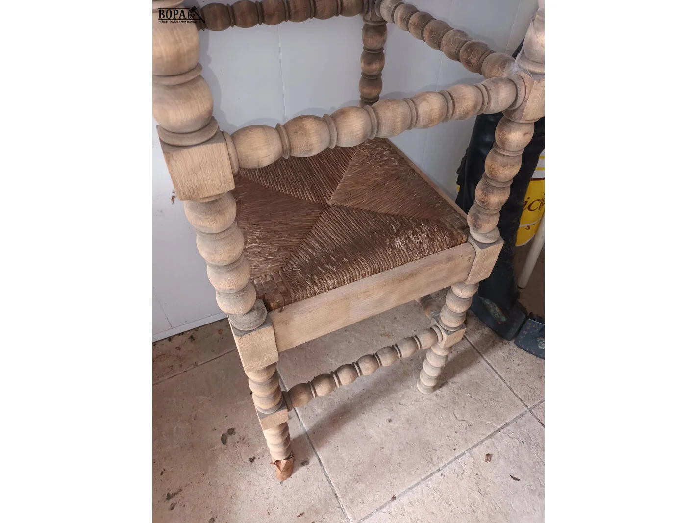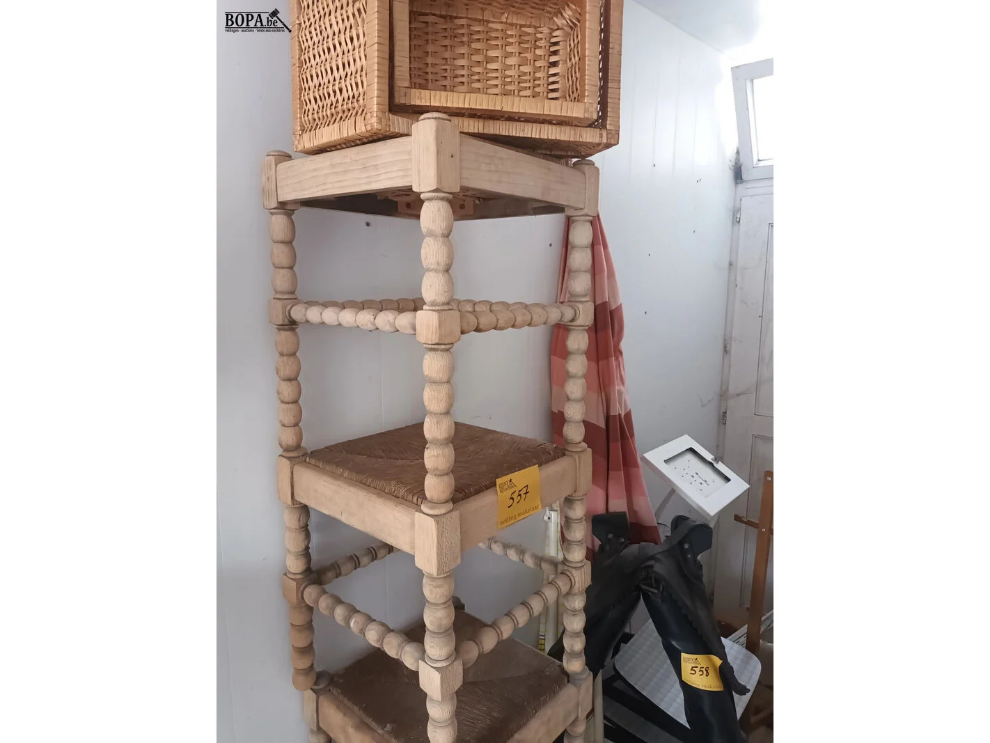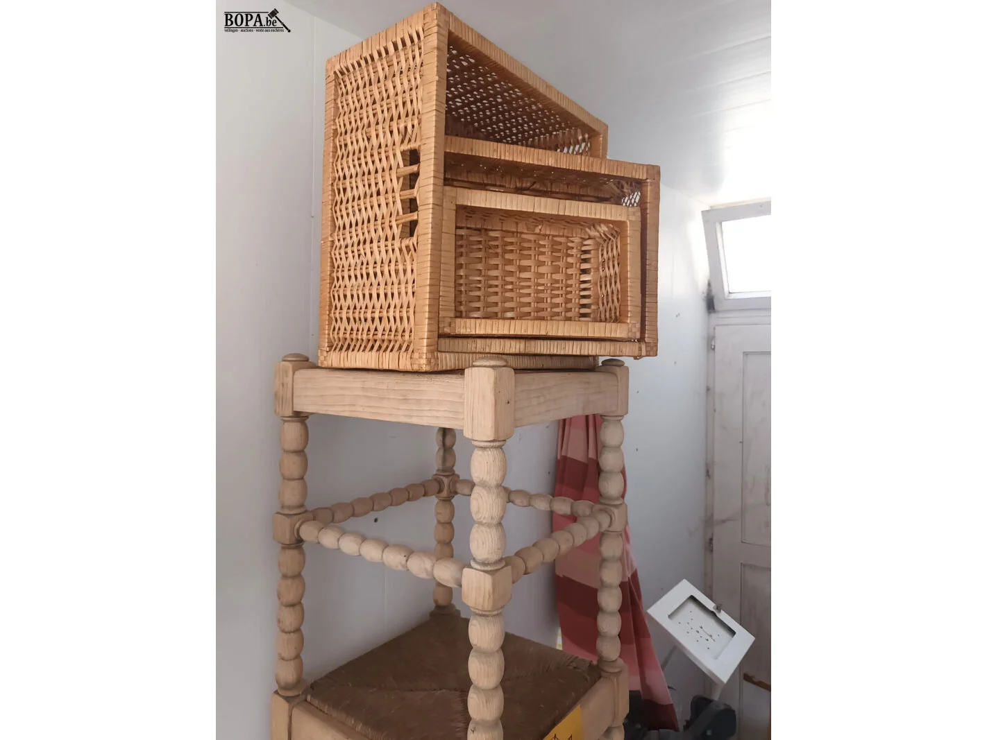 4 houten krukken (39 x 39 x 43 cm) met rieten zitting en 3 rieten manden.
