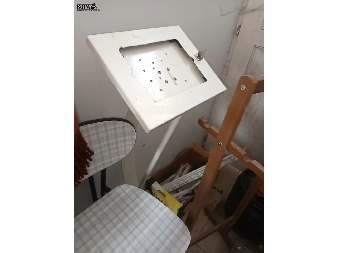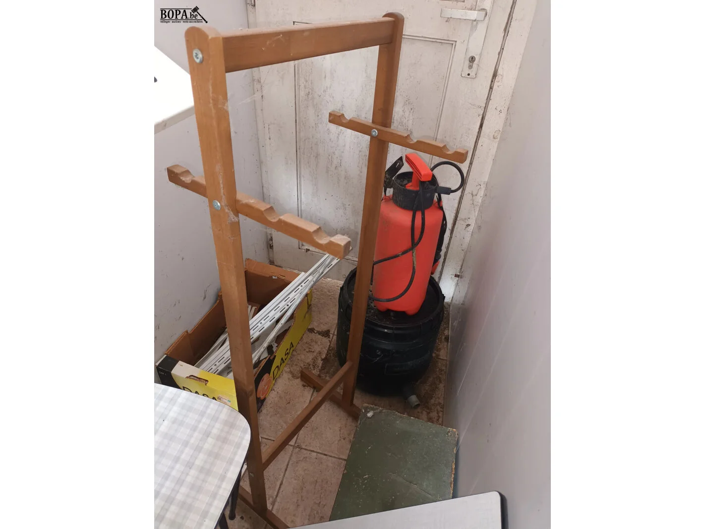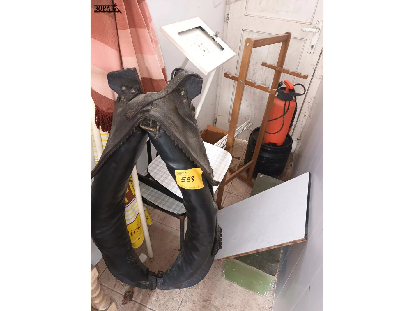 Lot diversen zoals een paardengareel, parasols, 2 stoelen, houten bak, drukspuit, houten rek, etc.