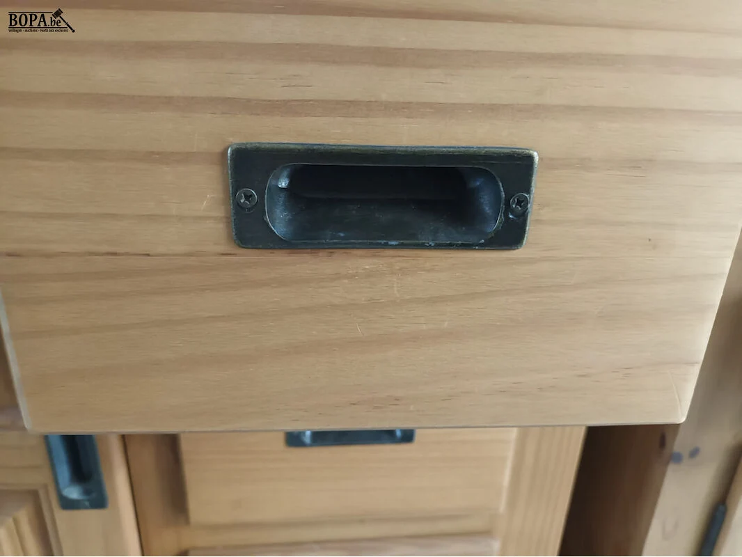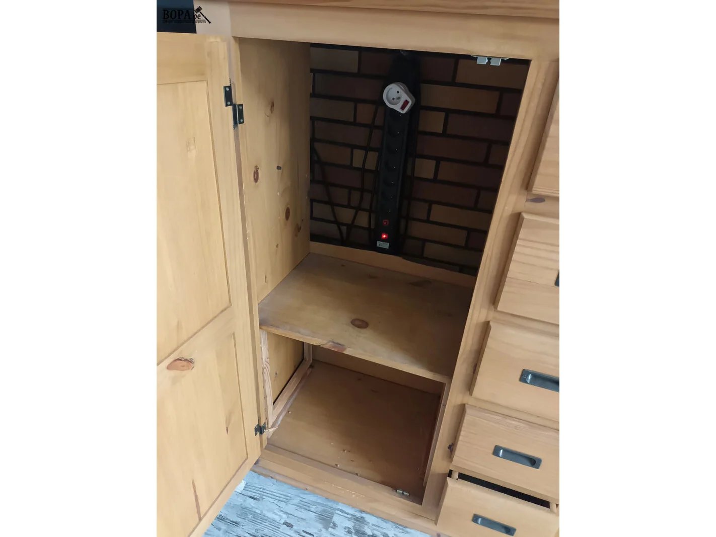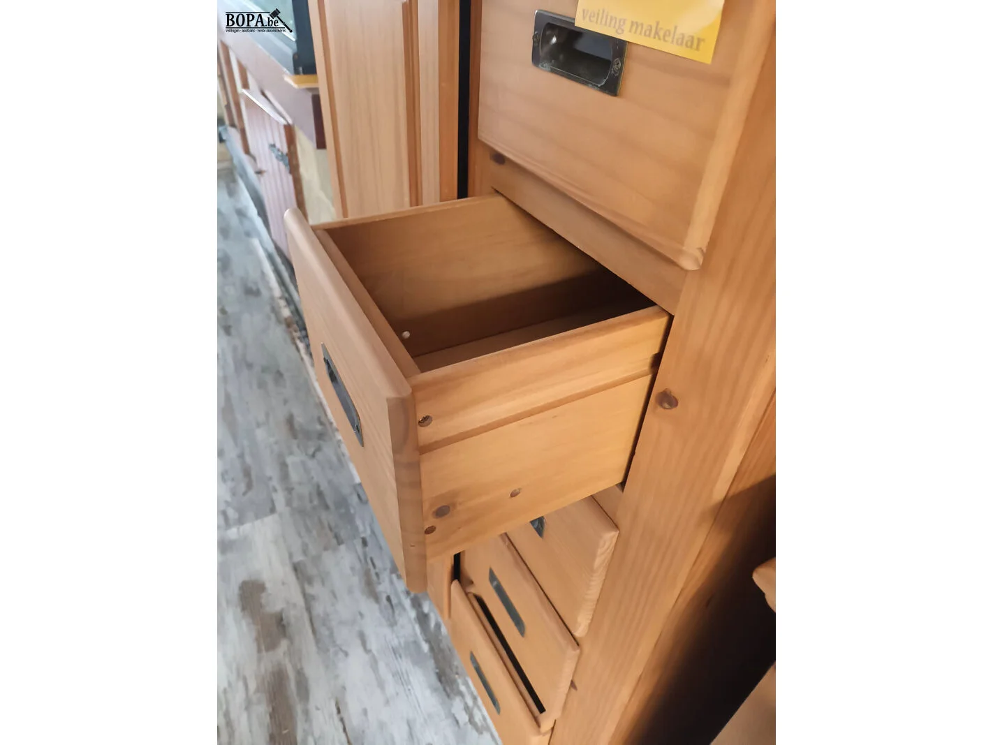 Houten kast met 1 deur en 5 lades. 90 x 43 x 126 cm. Zonder achterwand.