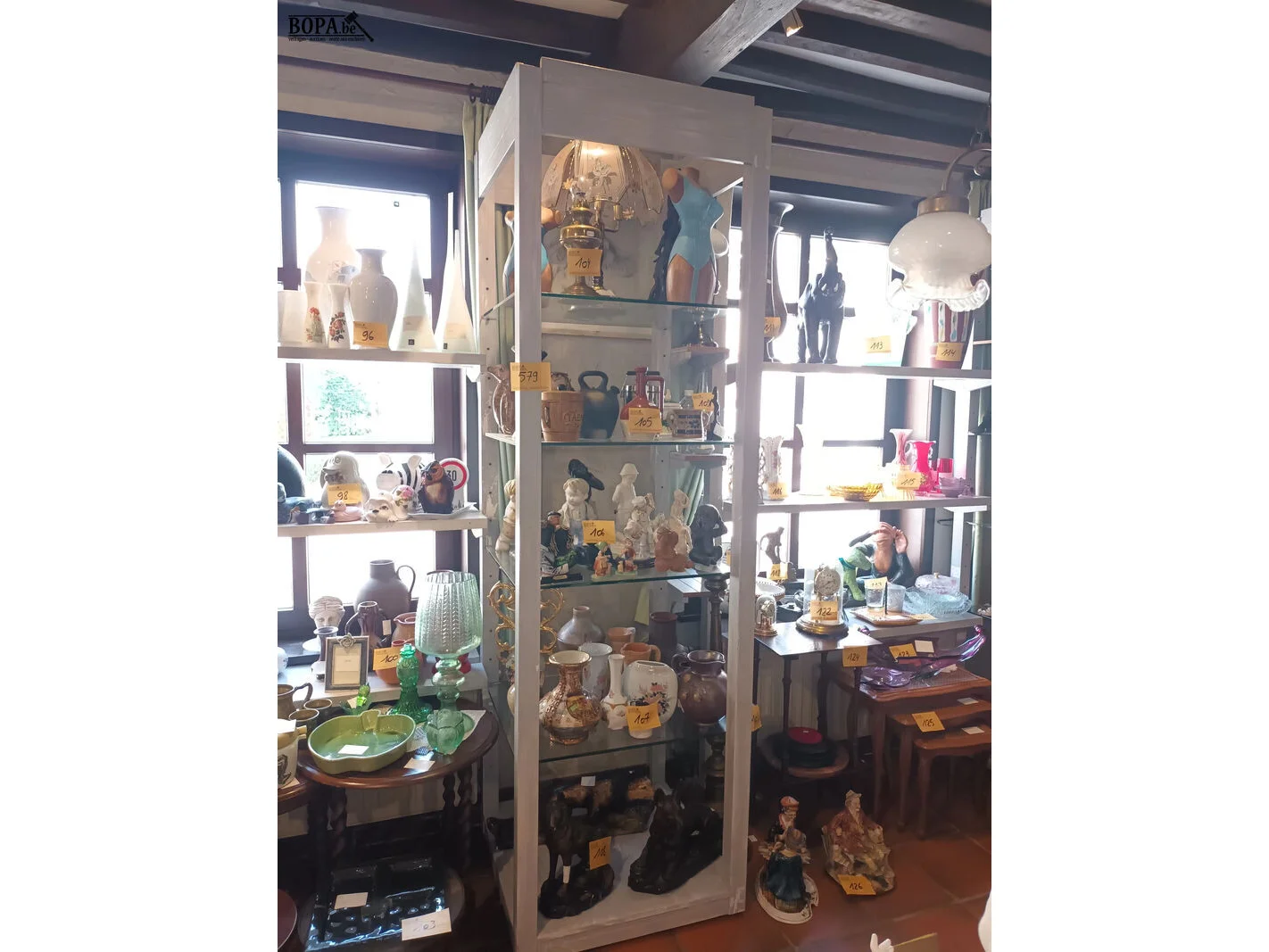 5 houten rekken met glazen legplanken (72 x 72 x 245 cm) met daartussen 2 rekken met telkens 3 houten legplanken van 122 x 35 cm.