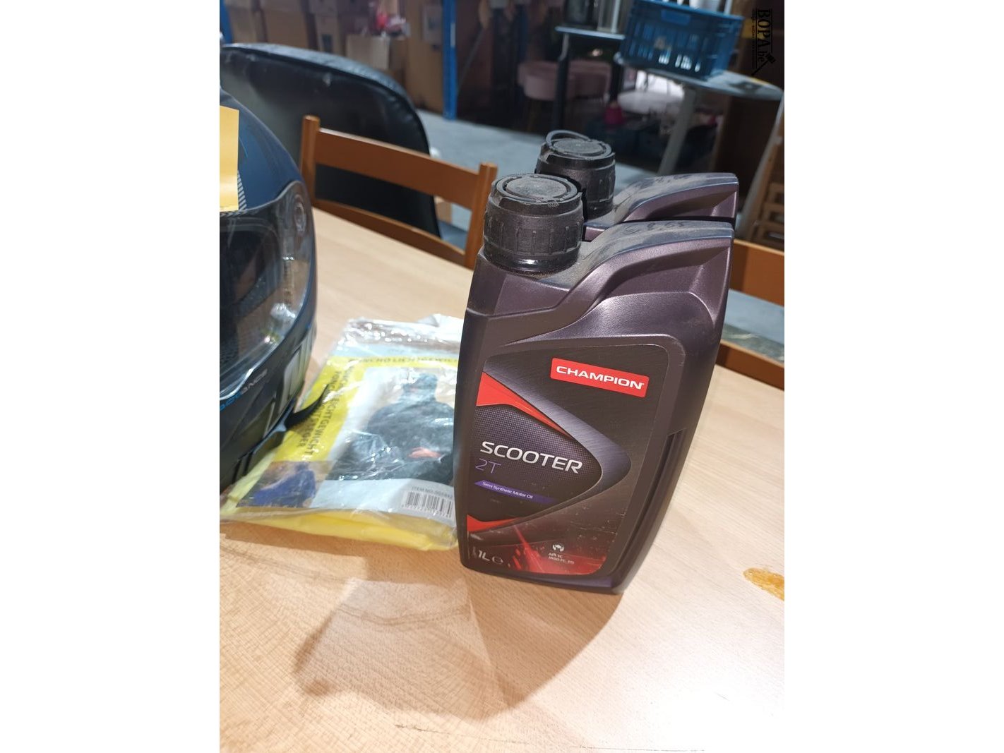 Motorhelm, regenpak en olie. 4 stuks.