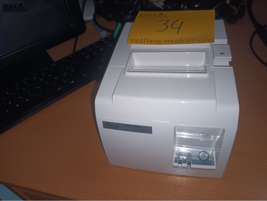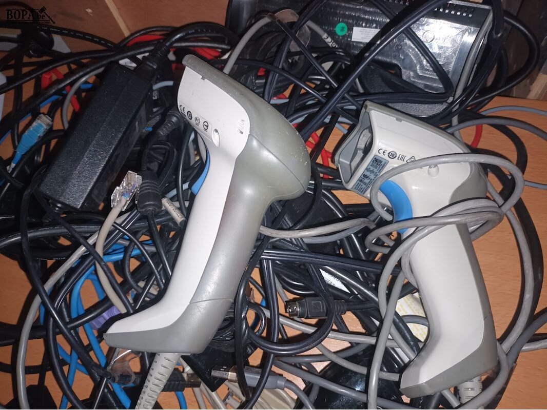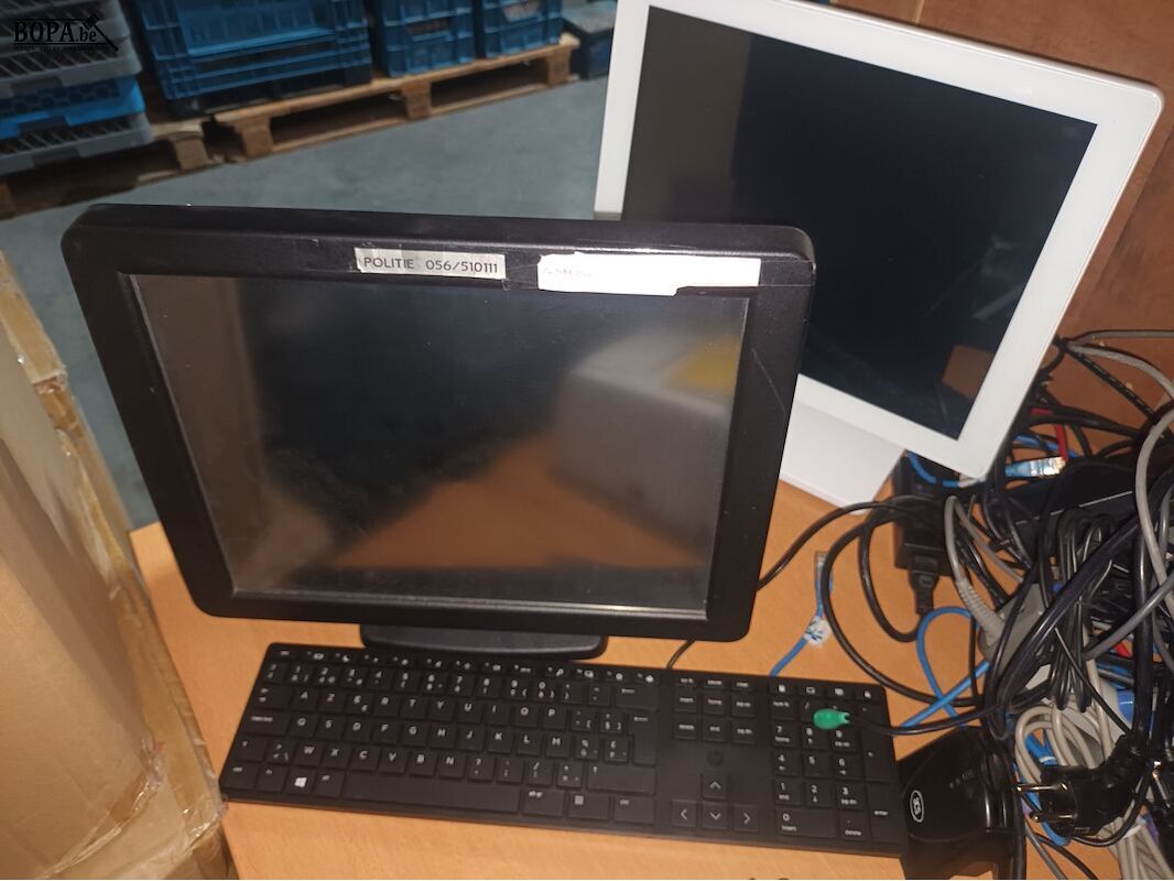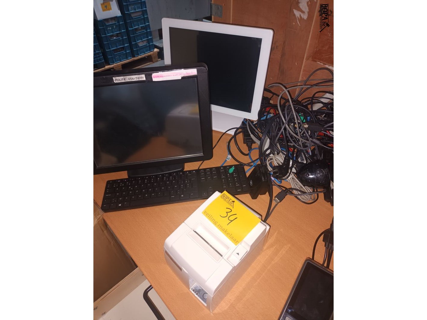 Kassasysteem met ticketprinter, scherm, handscanners, kabels.
