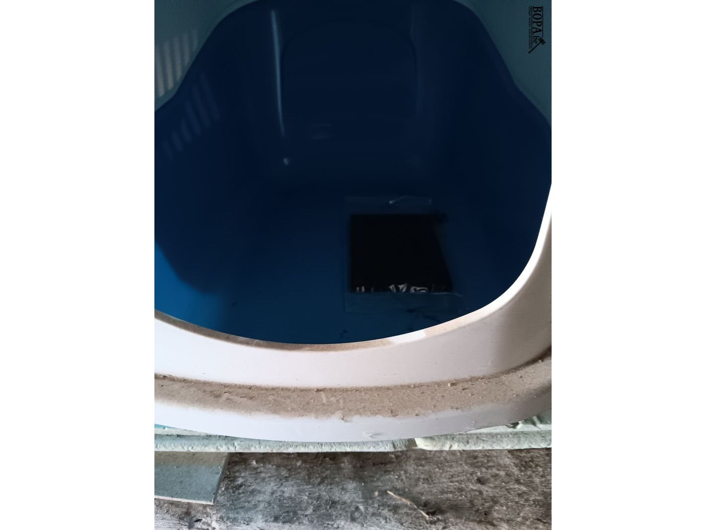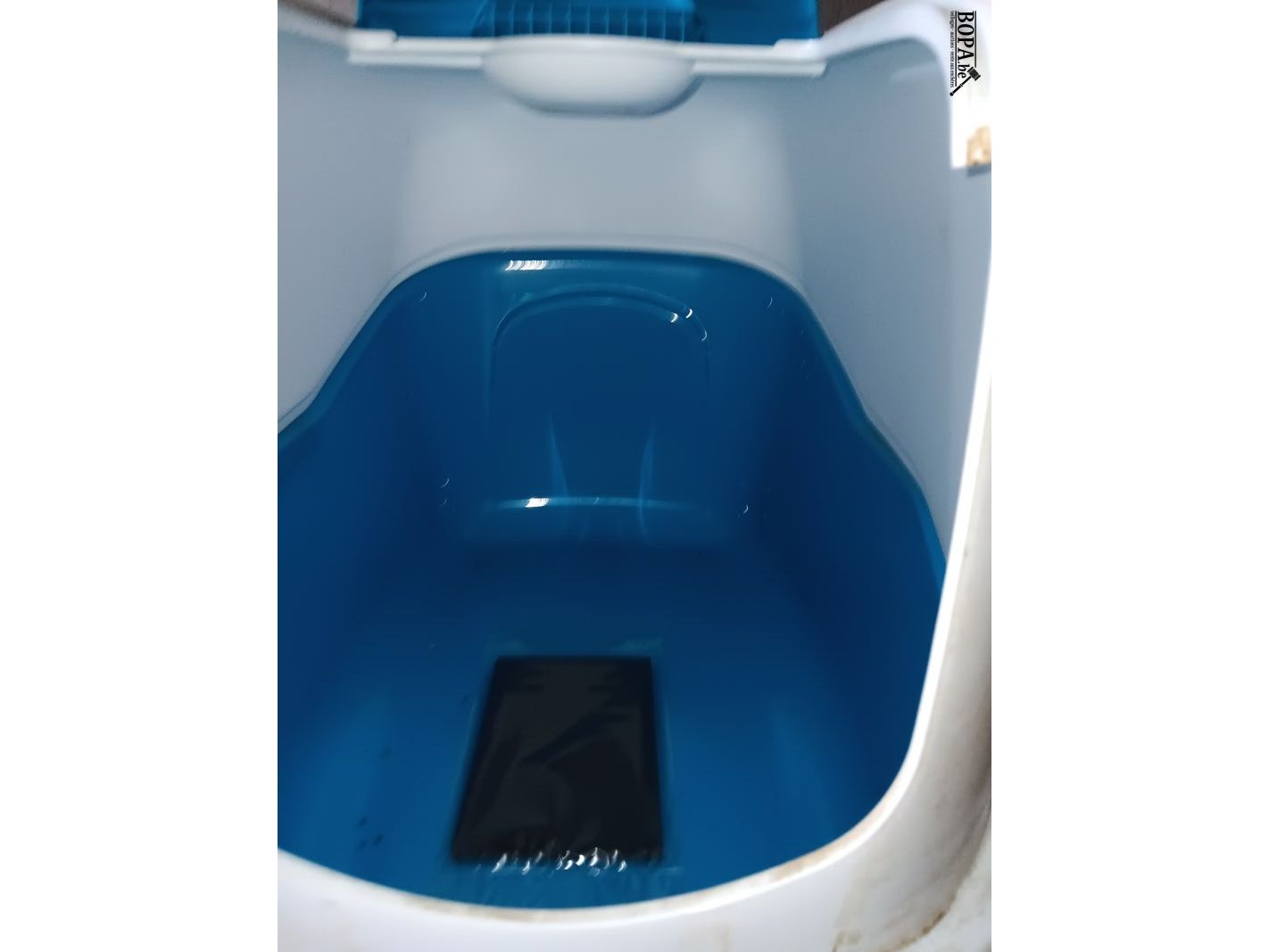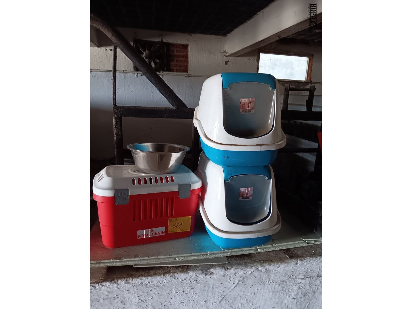 Dierenbenodigdheden. 2 poezentoiletten, eetkommen en transportmand.