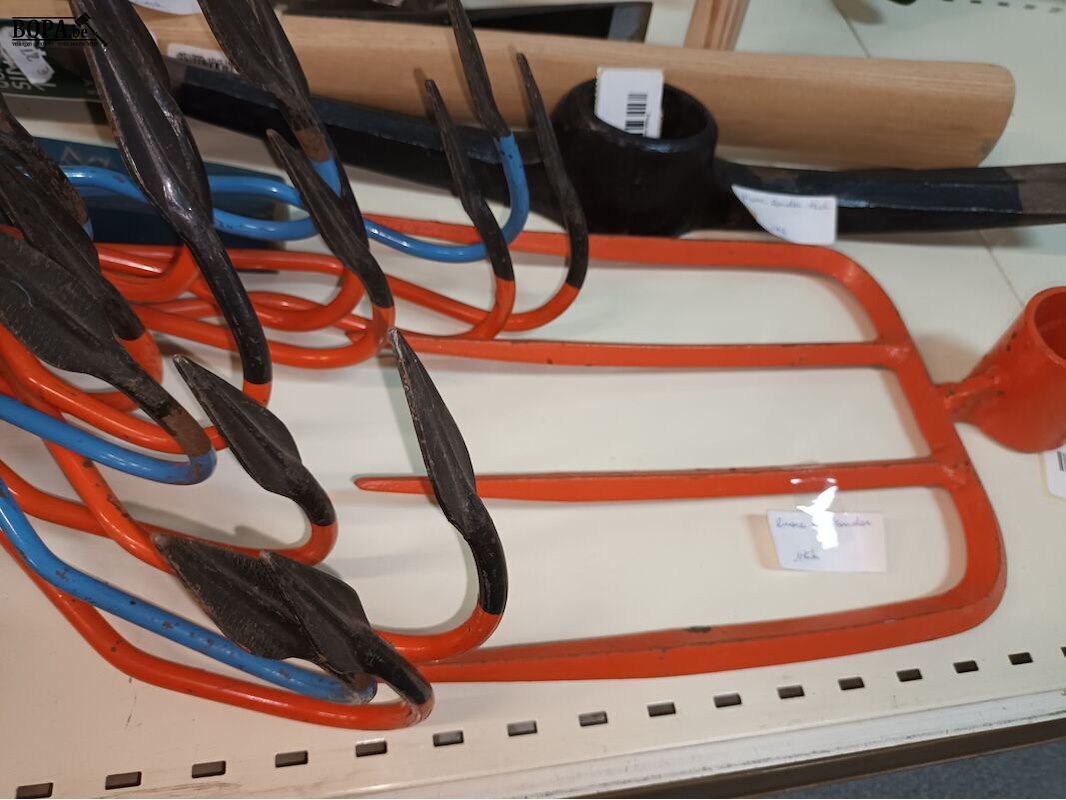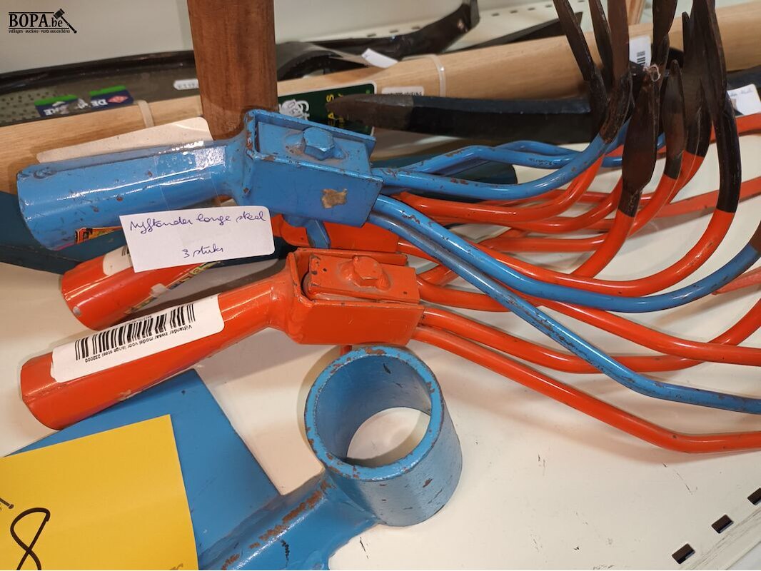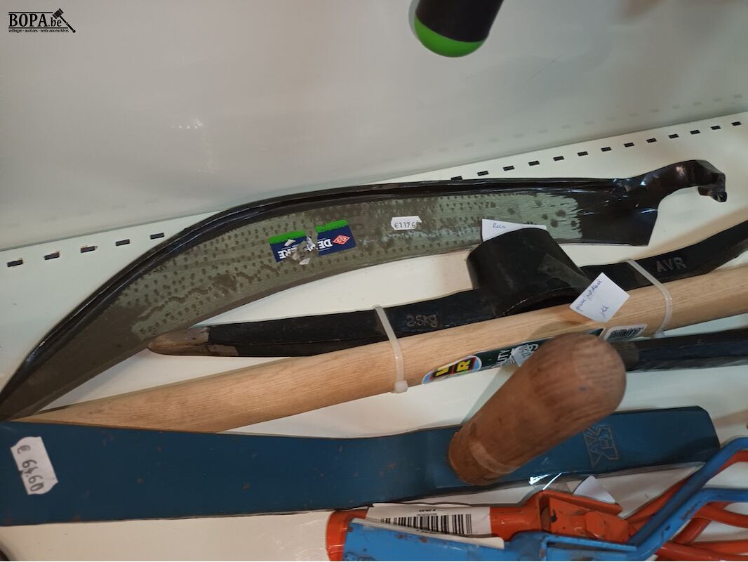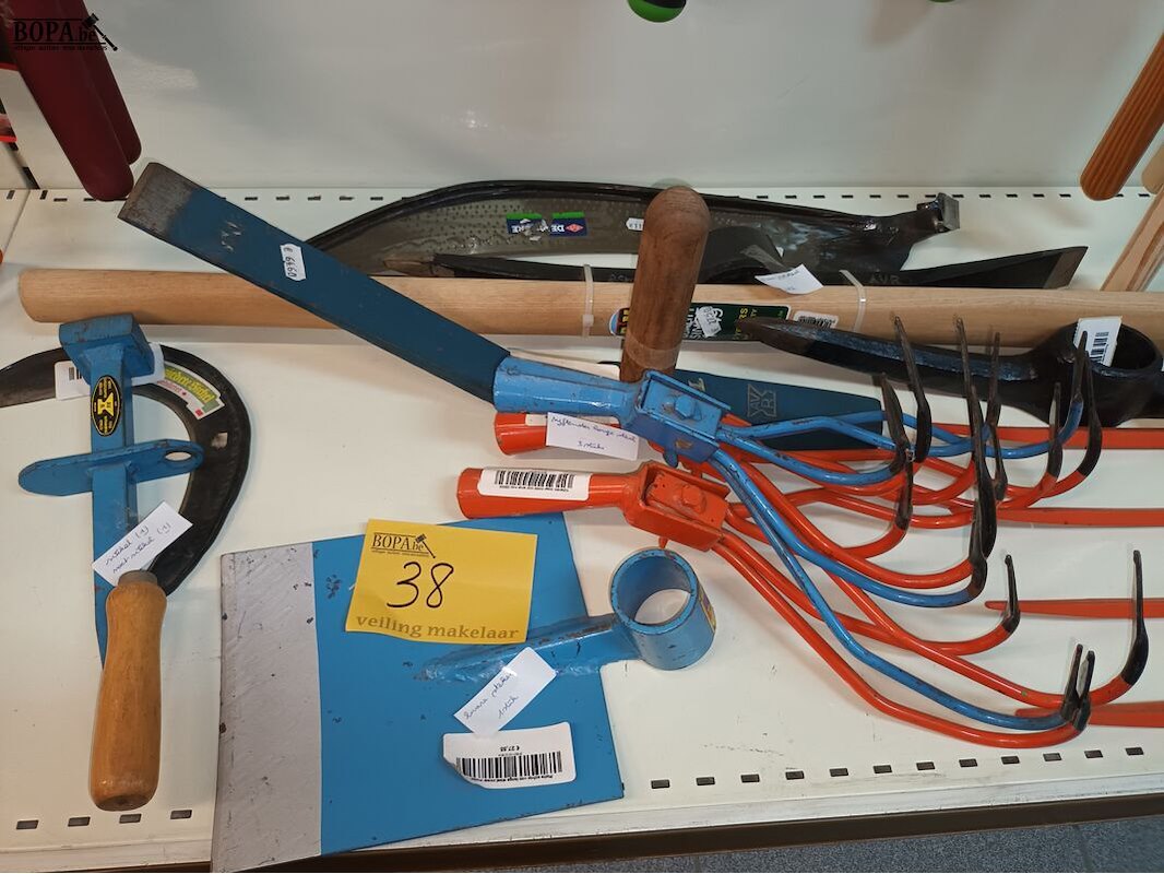 Divers tuingereedschap. 10 stuks. Sikkels, steker, vijftanden, zeis, piochen.