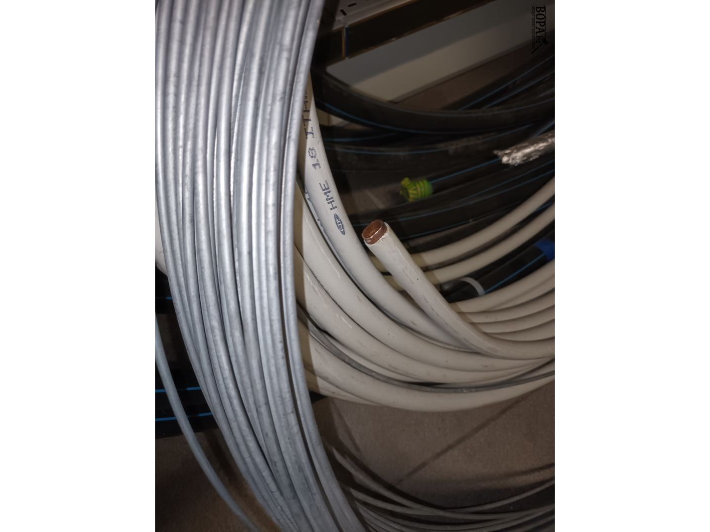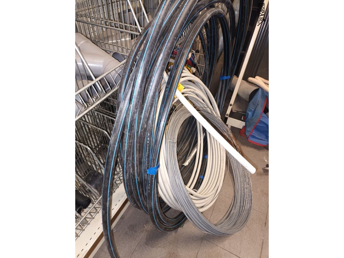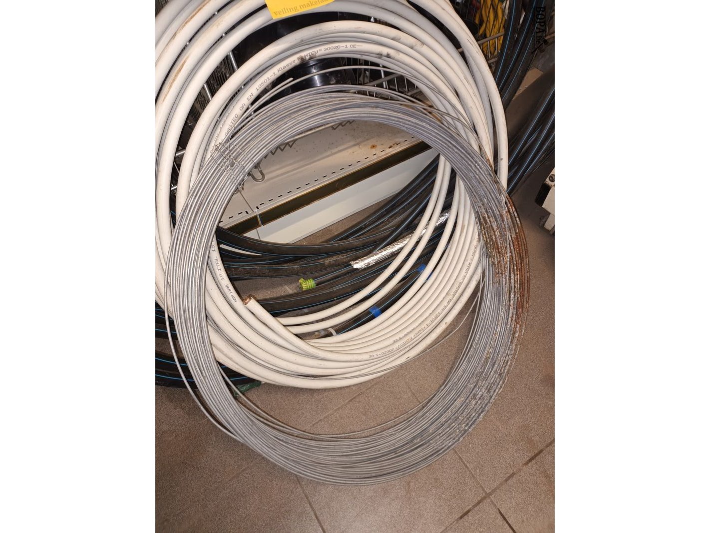 Kunststof buizen, rol metalen kabel en een restrol geïsoleerde koperen buis.