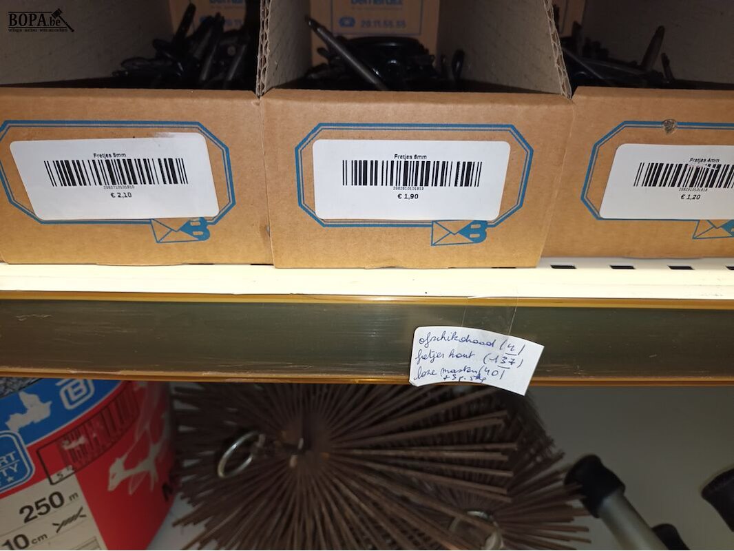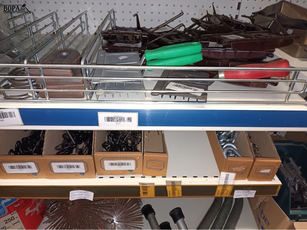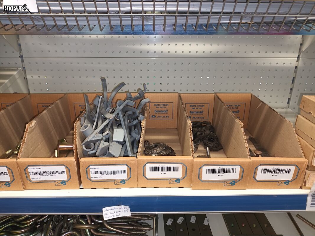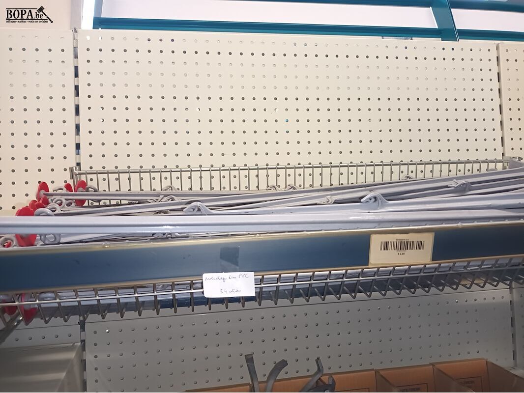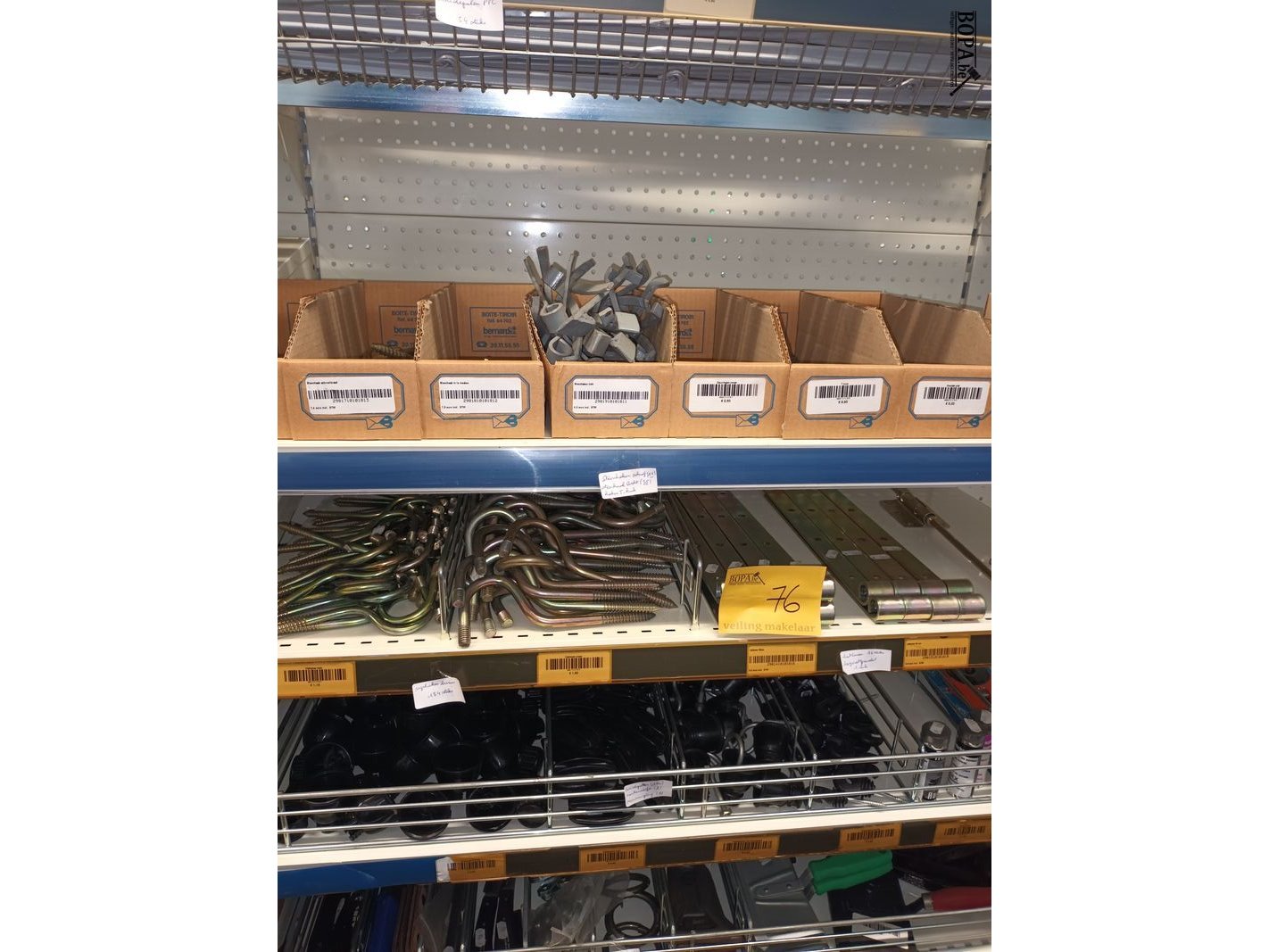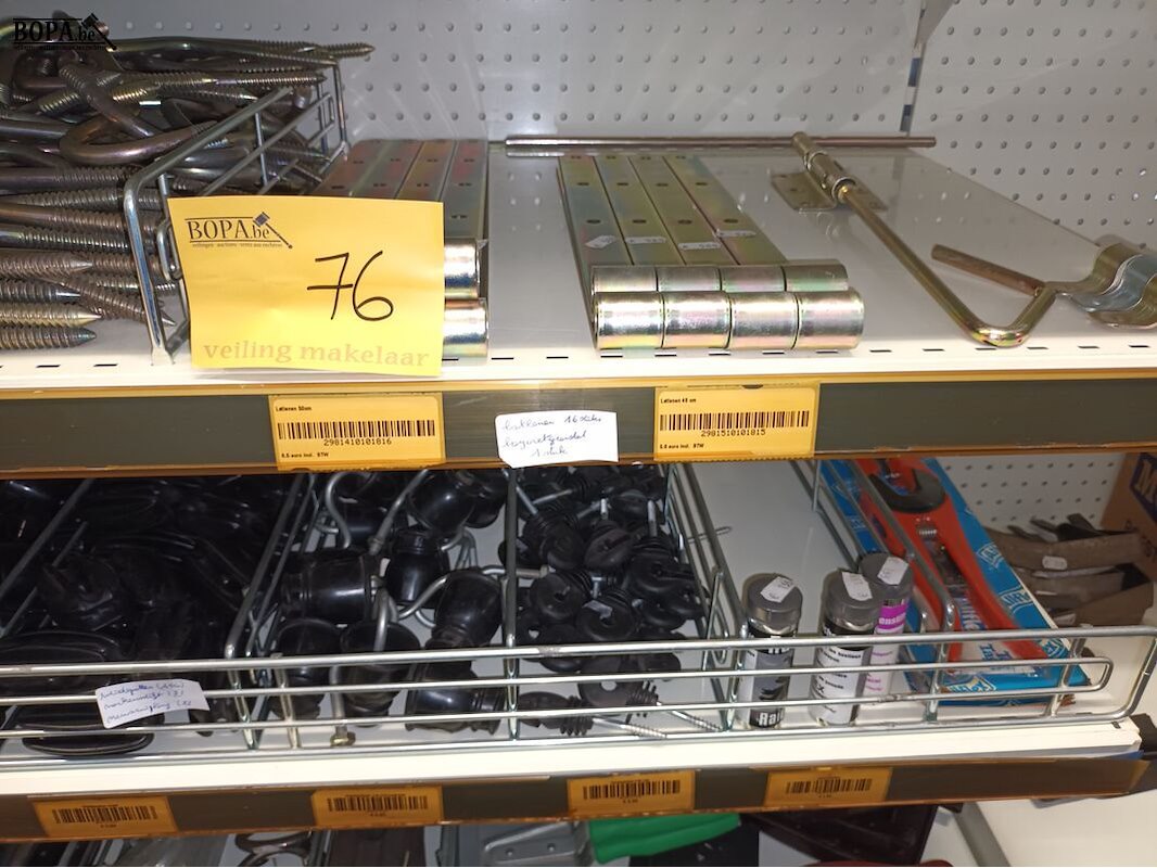 34 weidepalen in pvc, 46 steenhaken, 134 zware vijshaken, 16 latlenen, bajonetgrendel, 156 weidepotten, 3 varkensstiften, 2 neusringtangen, lozemasten, afschrikdraad, schoorsteenborstels, 3 koebeugels, etc.