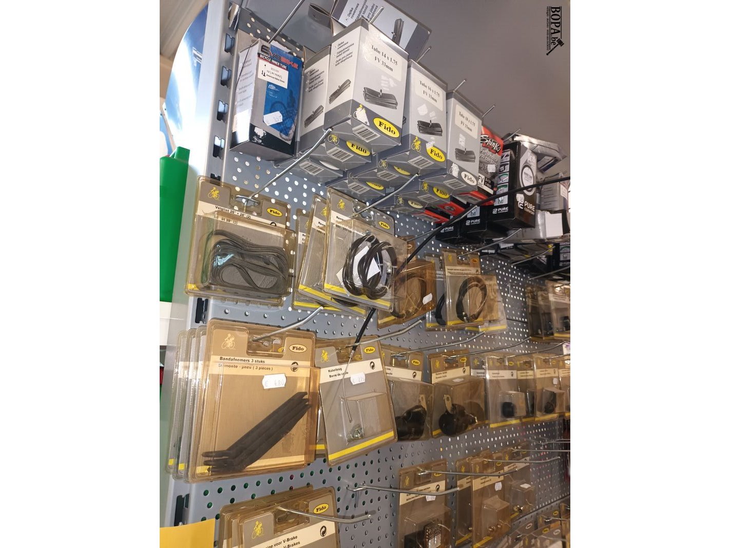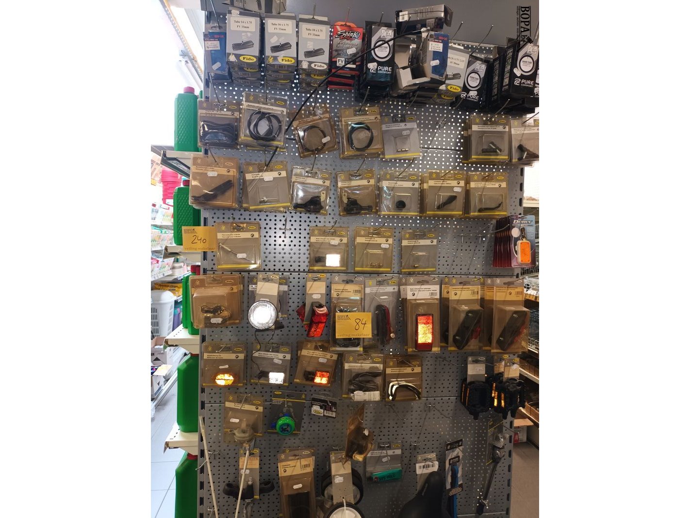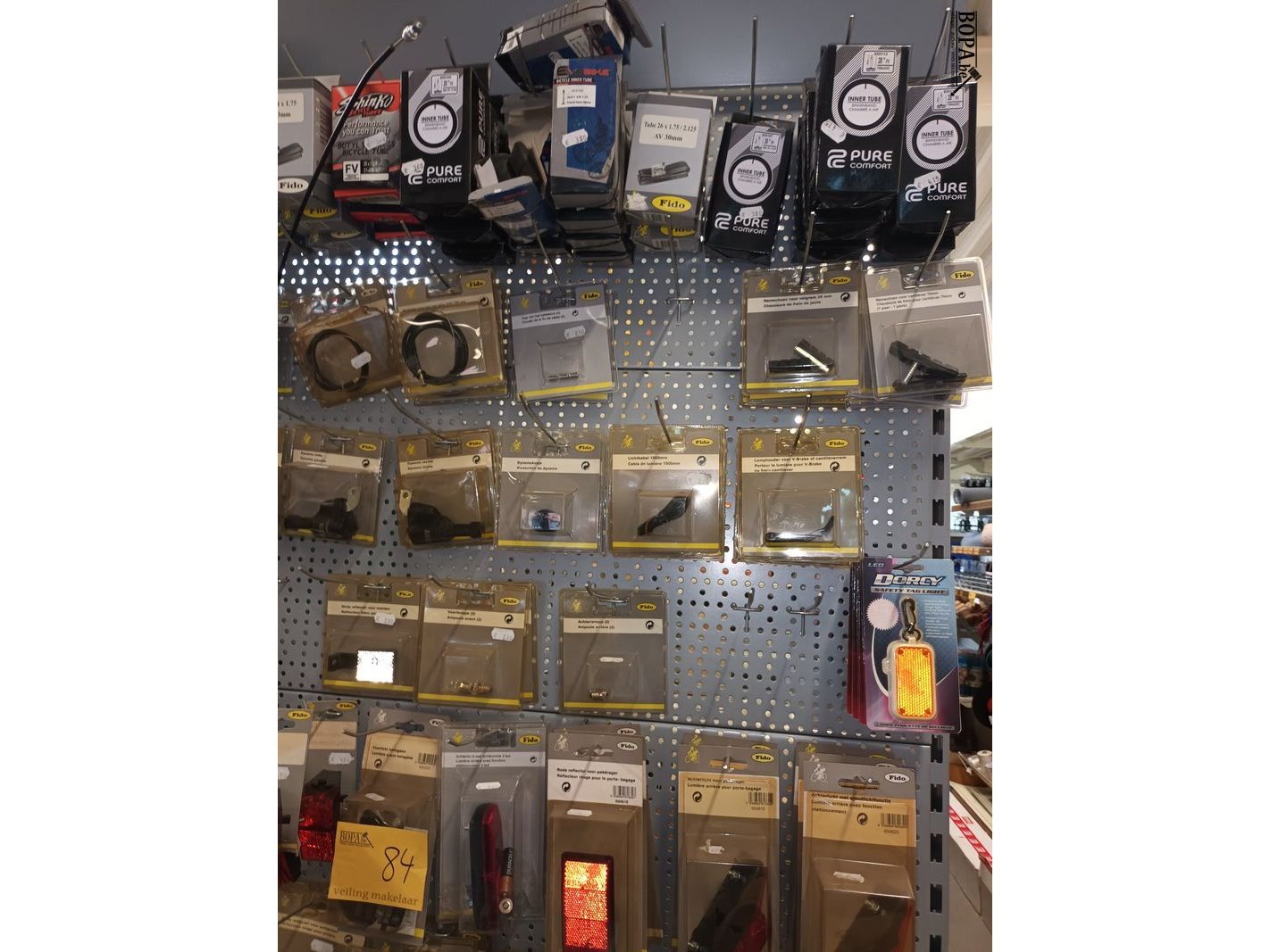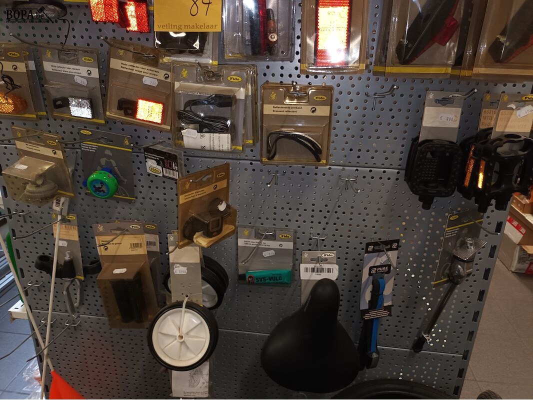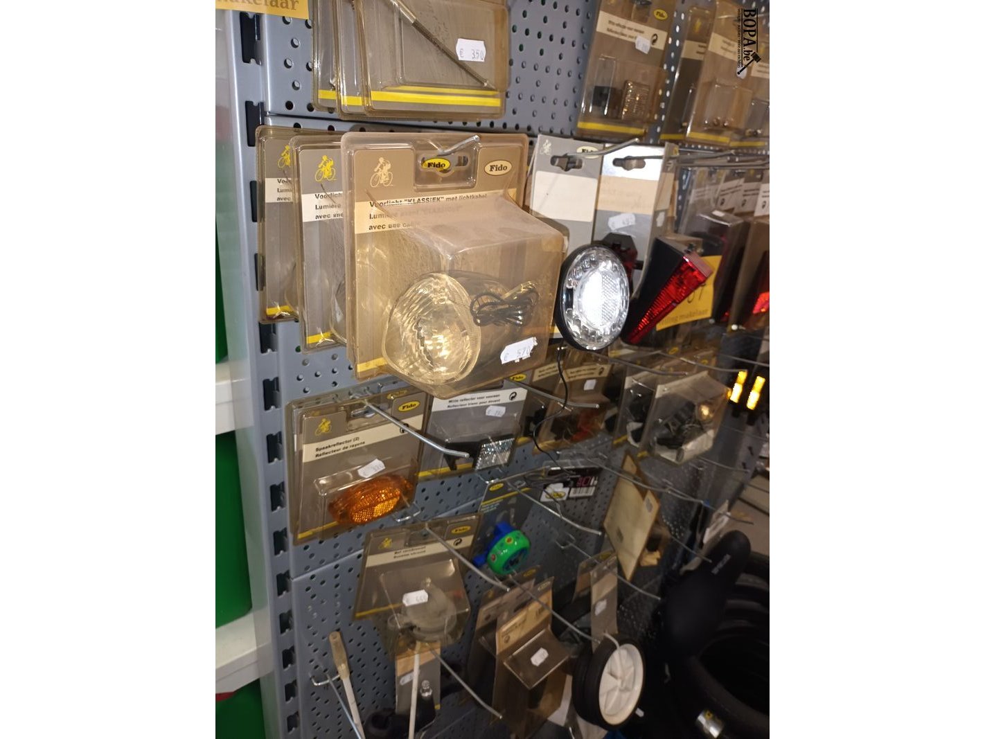Lot fietsmateriaal. Binnenbanden, fietsverlichting, zadel, pedalen, zijwieltjes, bellen, fietsmandjes, etc.