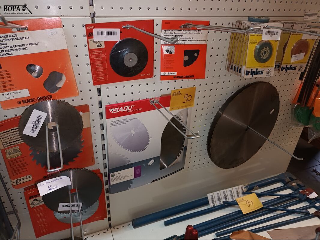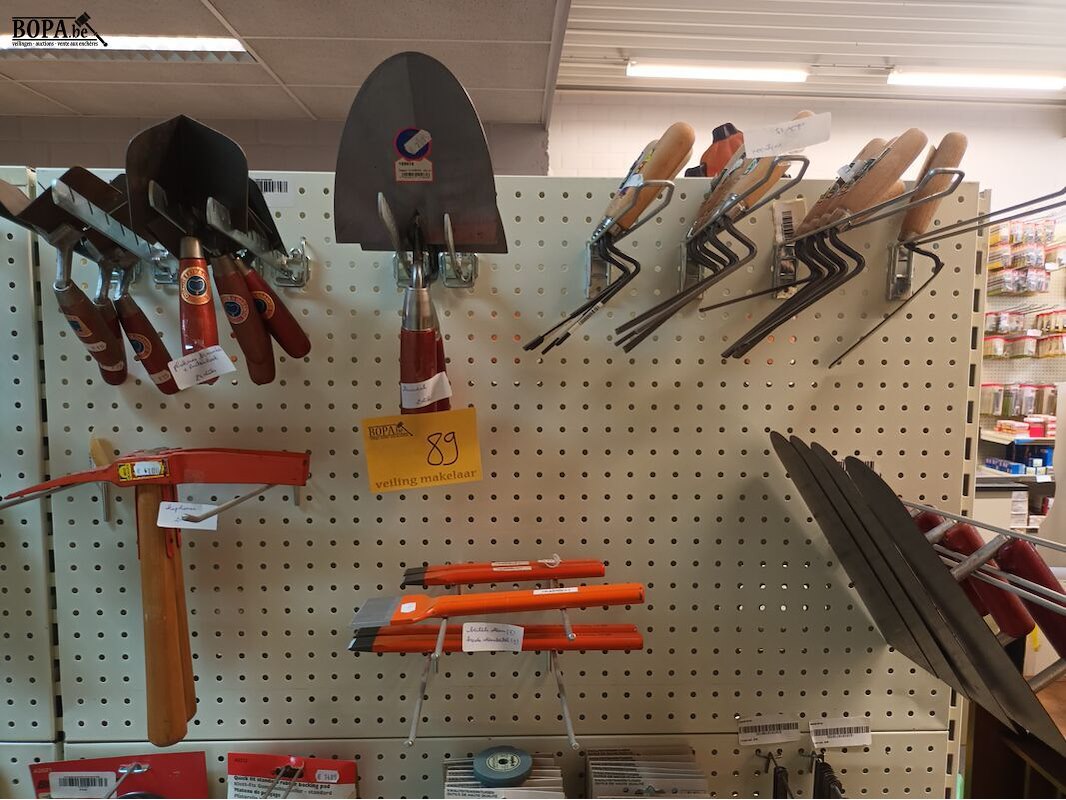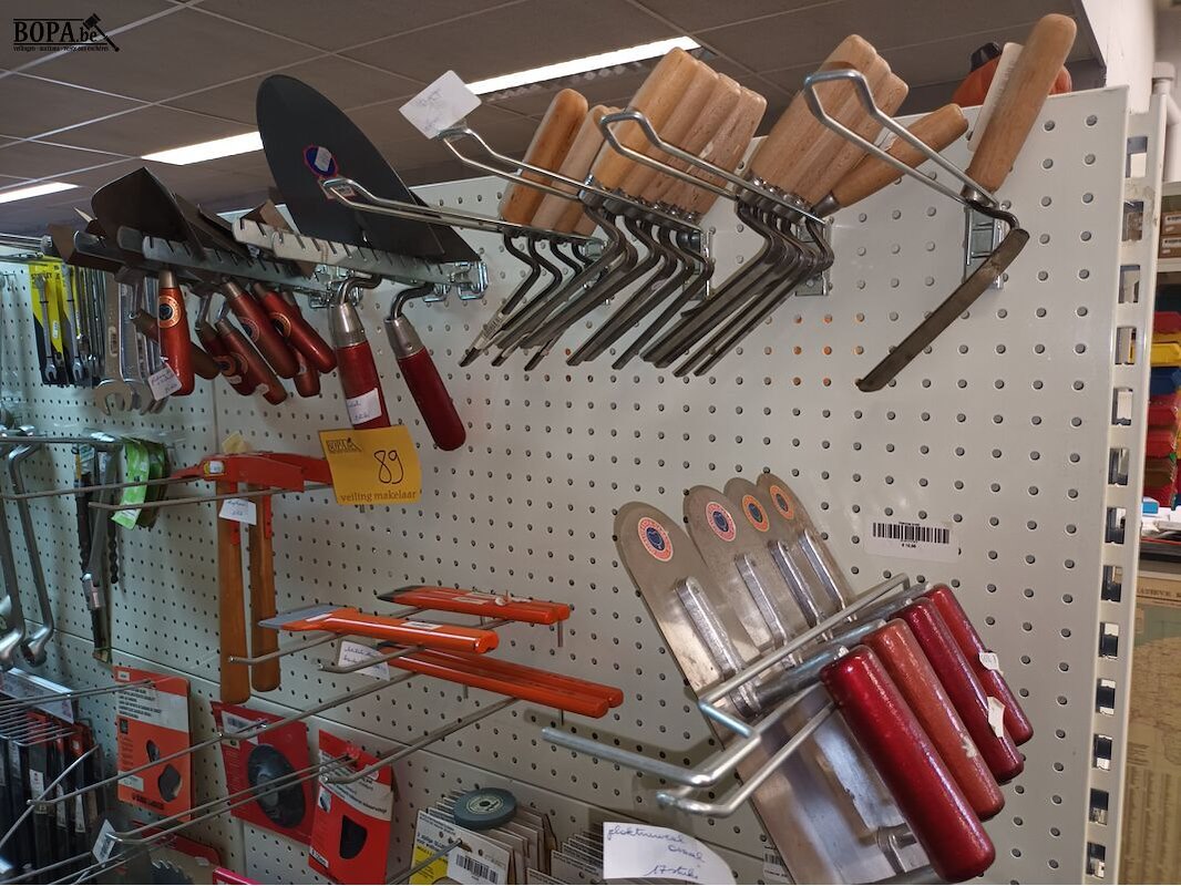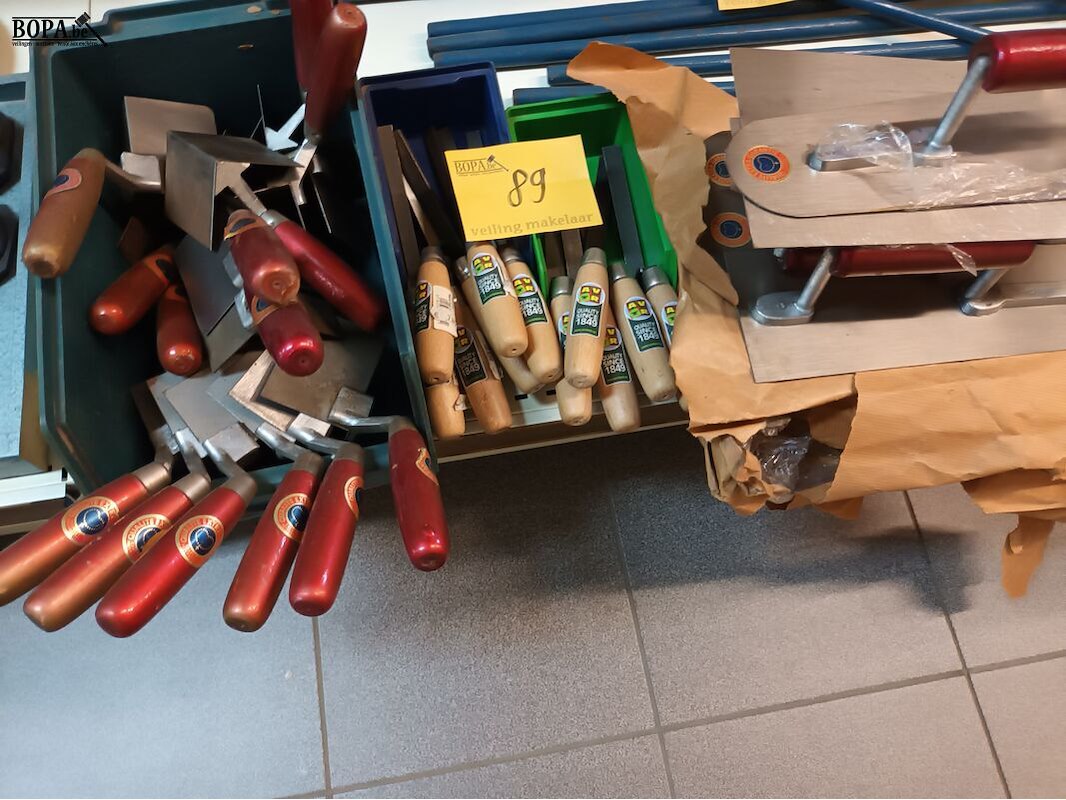 24 plakmessen, 2 truwelen, 12 voegspijkers, 2 kaphamers, 6 steenbeitels, 17 plaktruwelen.