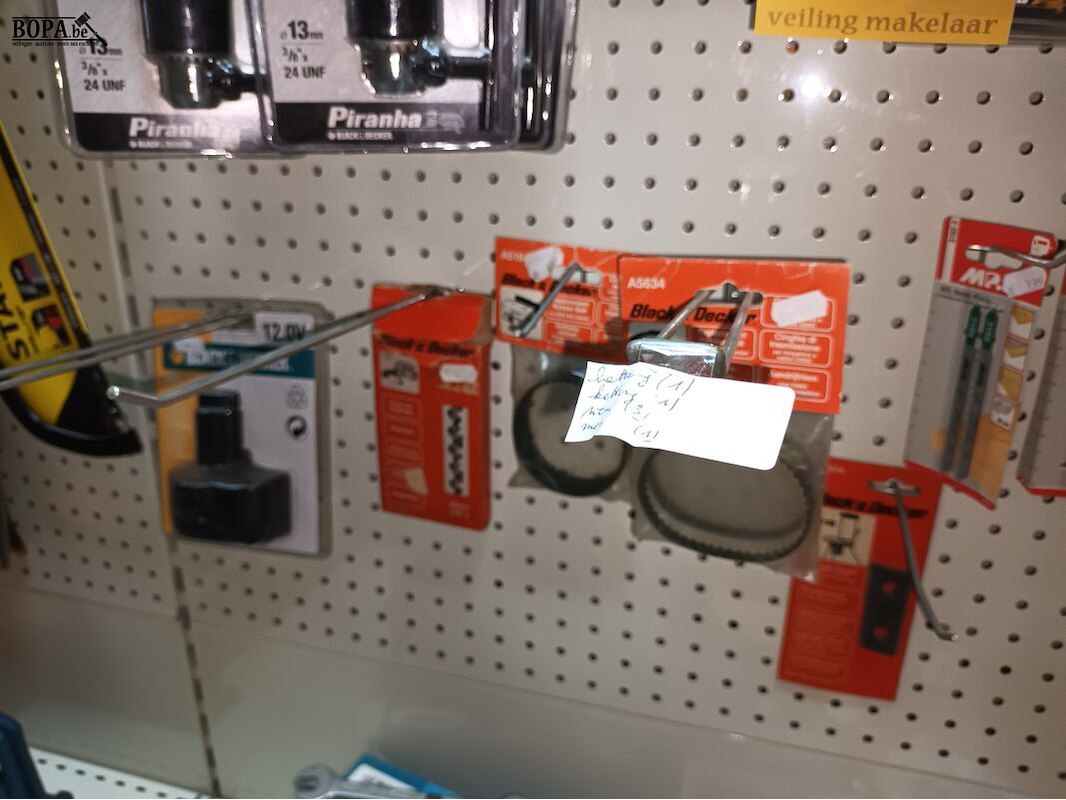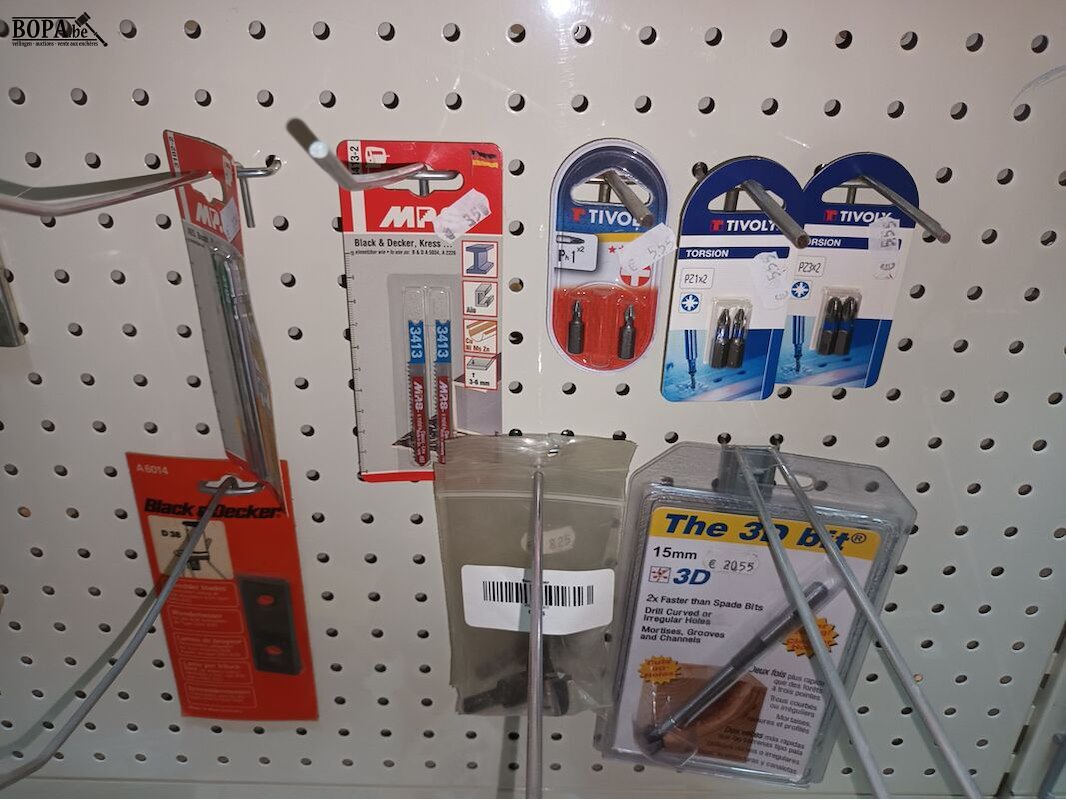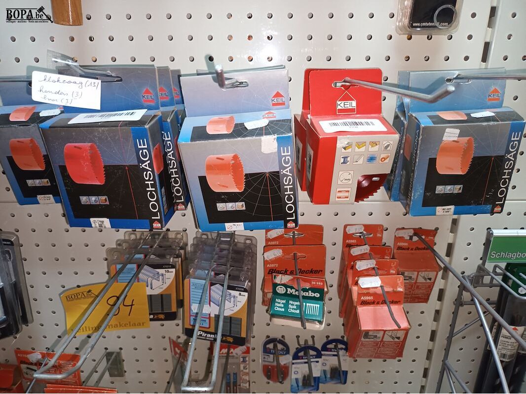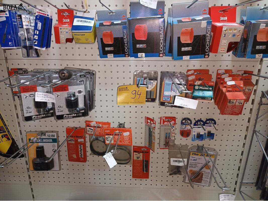 15 boorkoppen, 16 pakjes nieten, kettingen, riem, mes, batterij B, bitsen, decoupeerzagen, rondgatboor, 13 klokzagen, etc.
