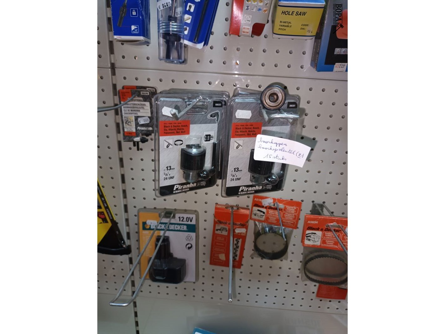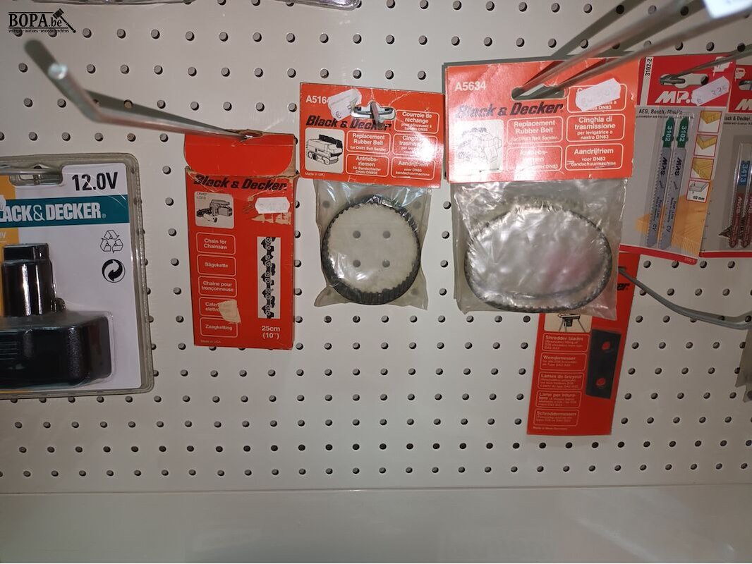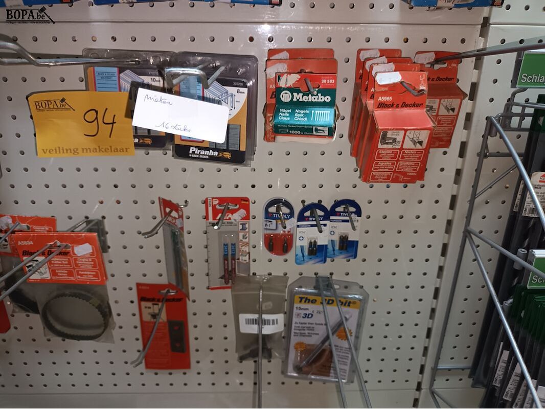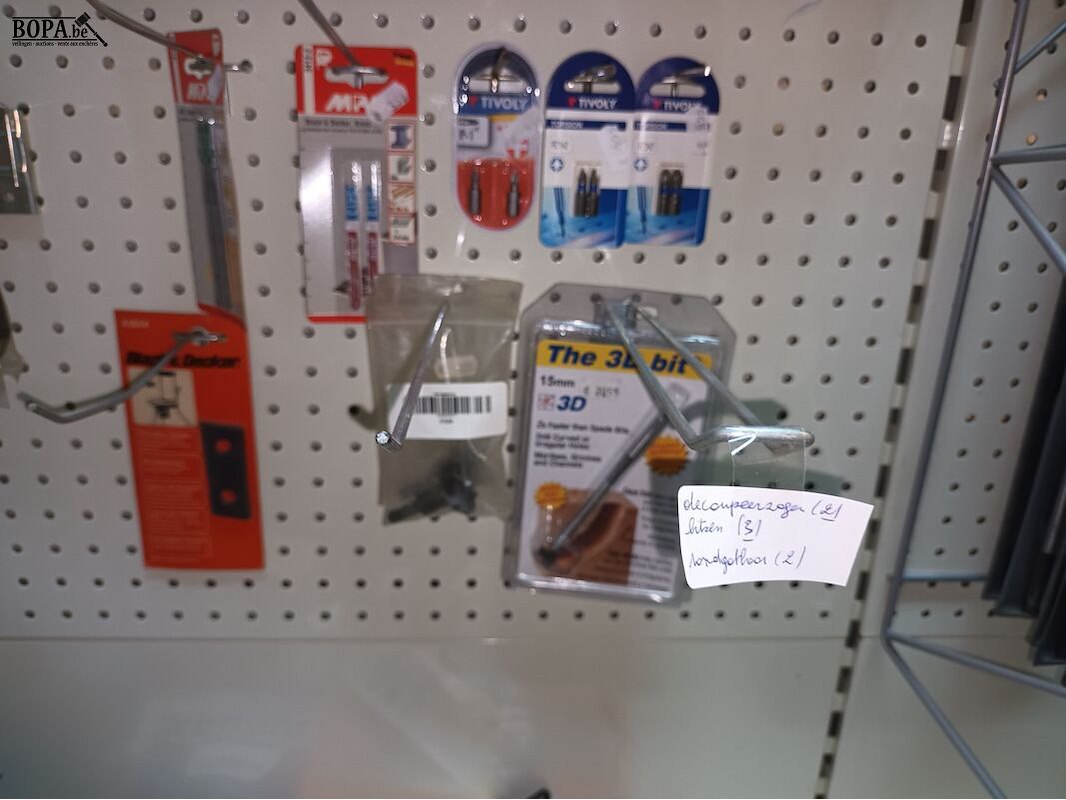 15 boorkoppen, 16 pakjes nieten, kettingen, riem, mes, batterij B, bitsen, decoupeerzagen, rondgatboor, 13 klokzagen, etc.