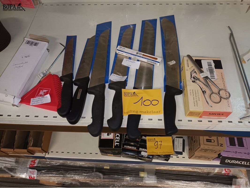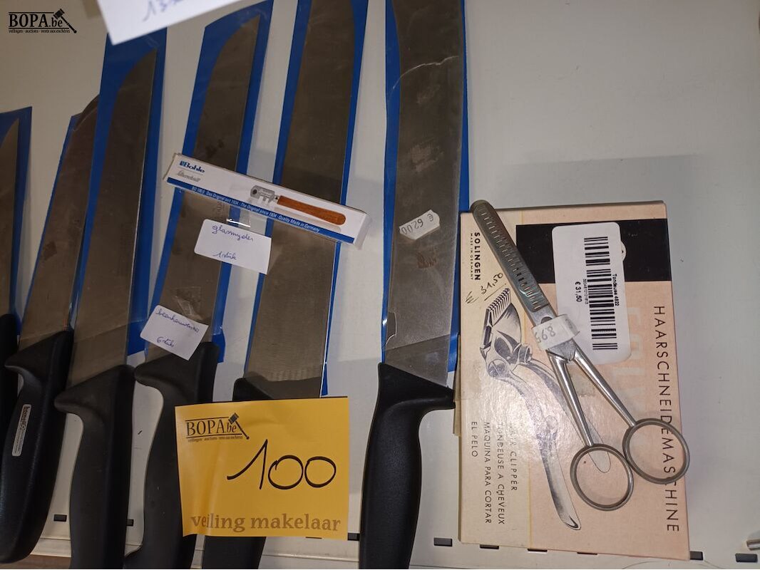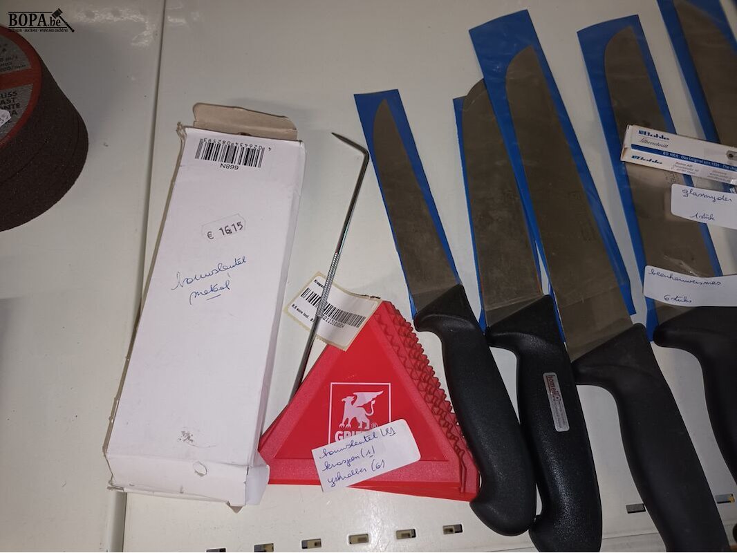 2 bouwsleutels, 6 ijskrabbers, 6 slagersmessen, 1 glassnijder, kappersschaar en clipper.